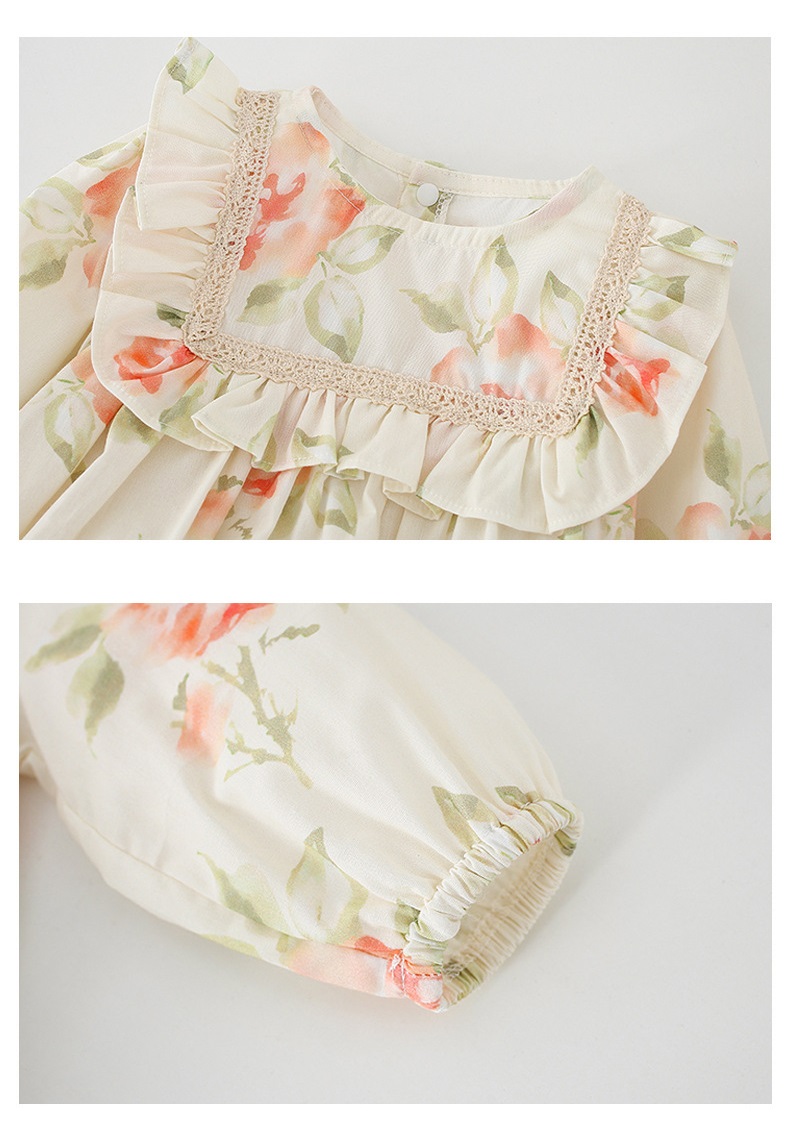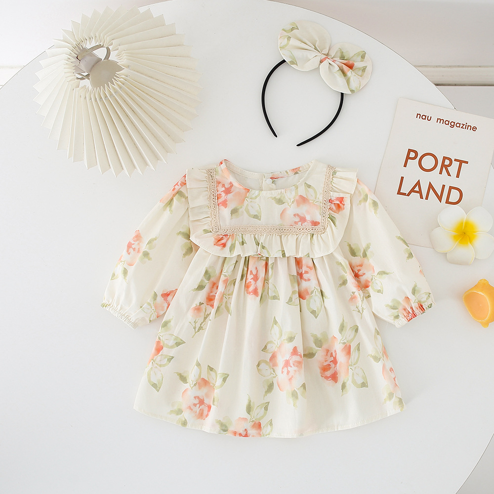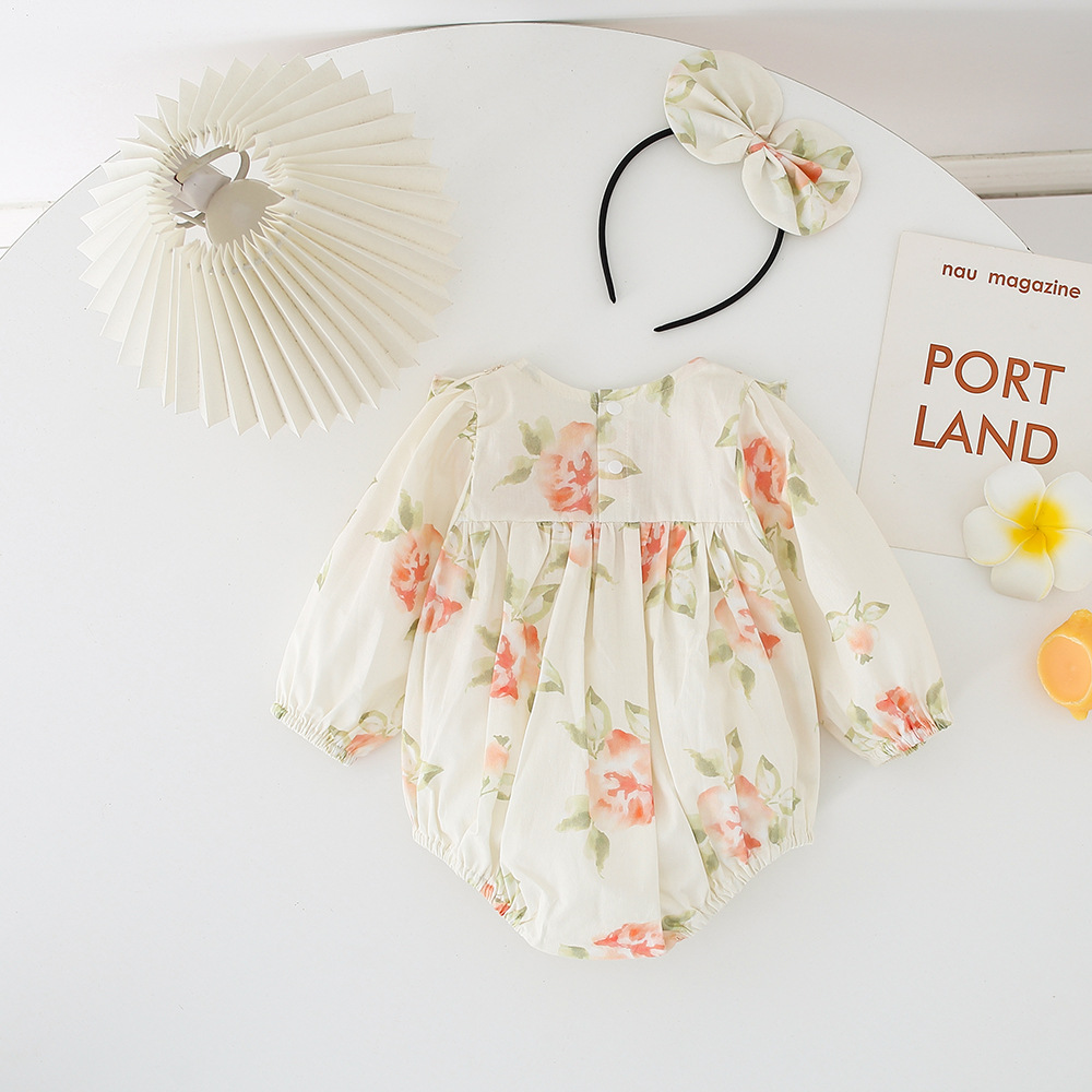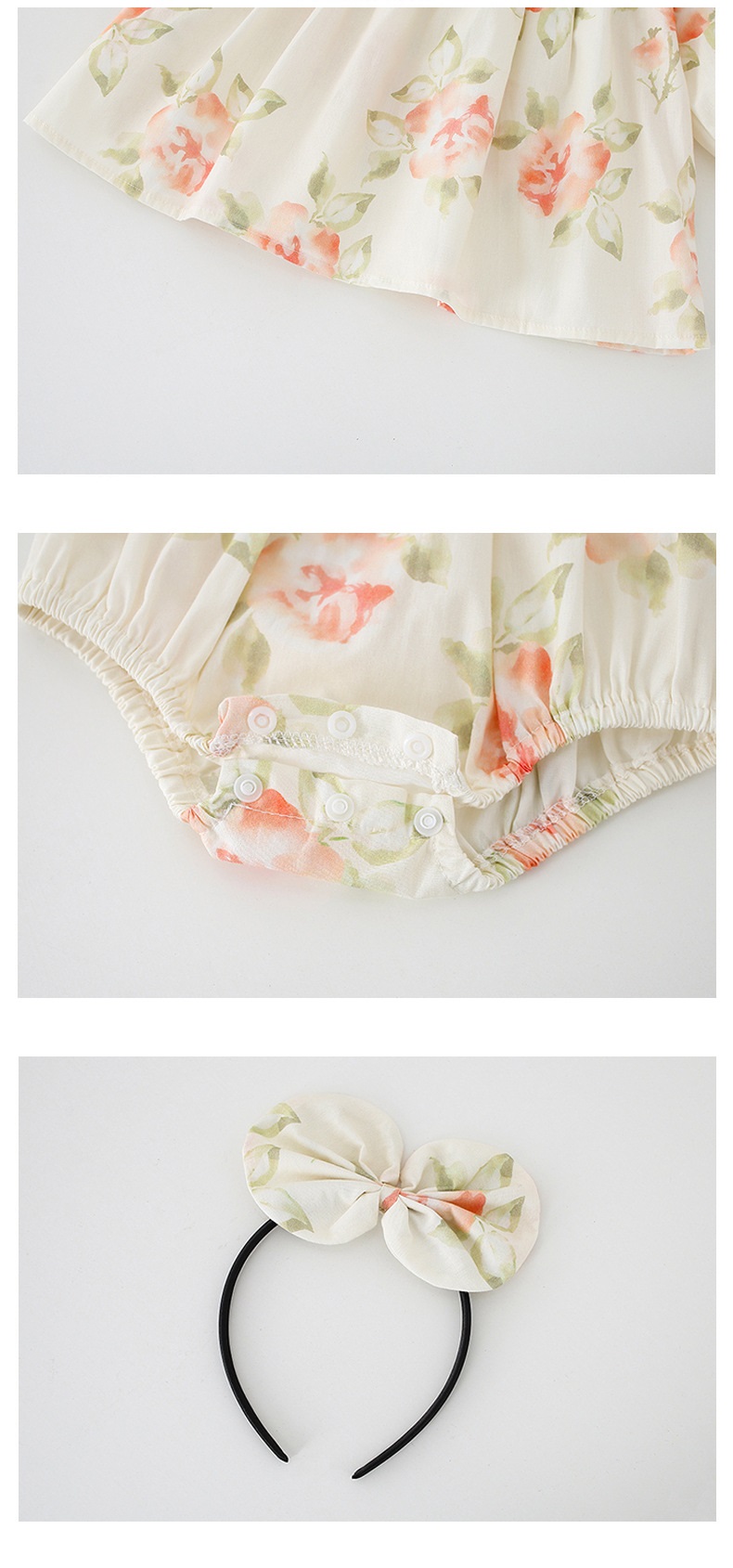 【BS012】韓版方領水彩玫瑰花長袖包屁衣小洋裝(送髮箍)(1色)