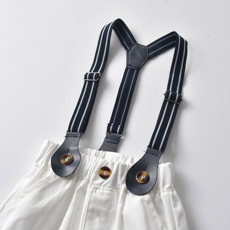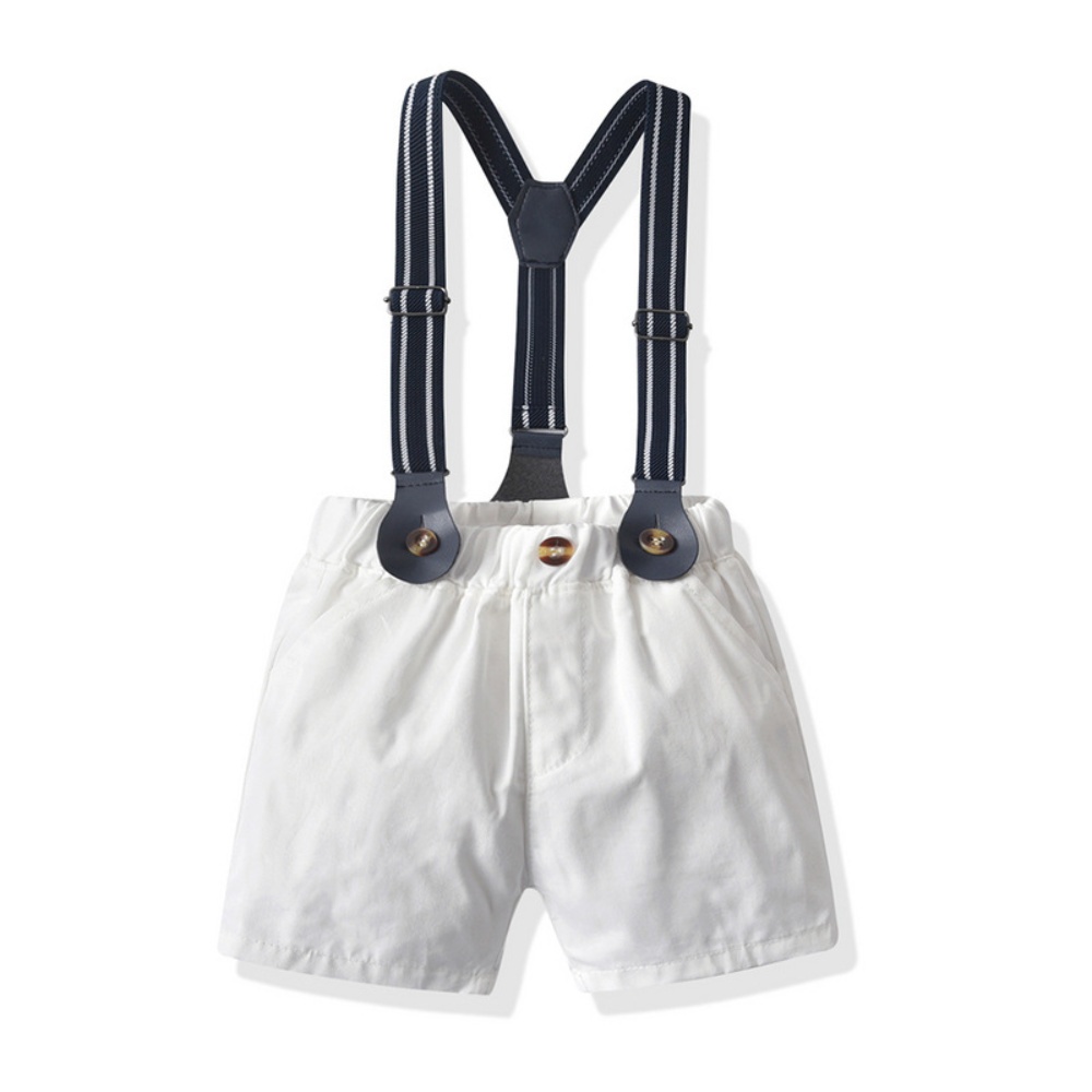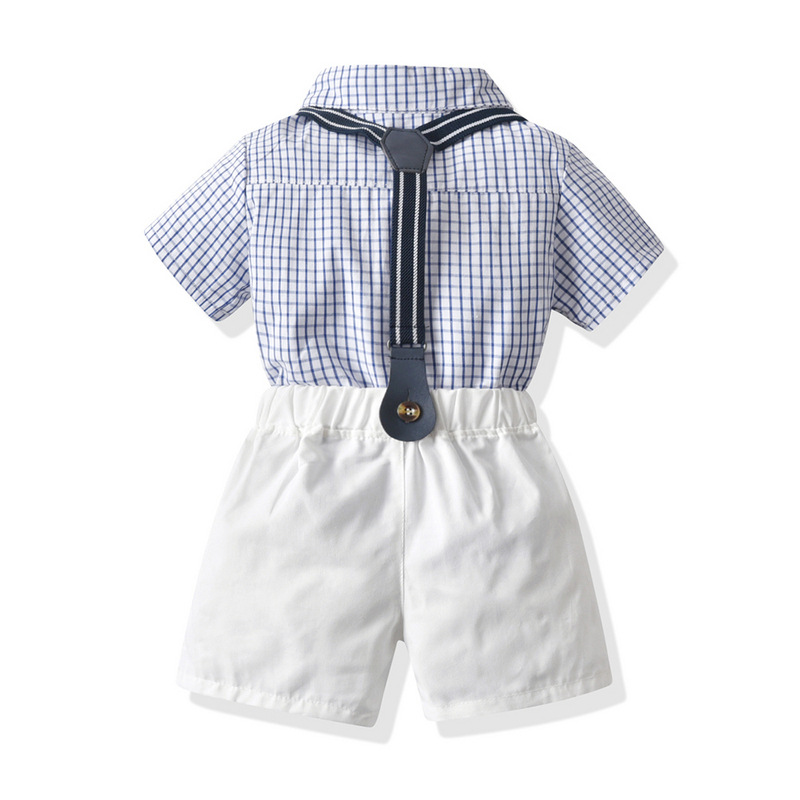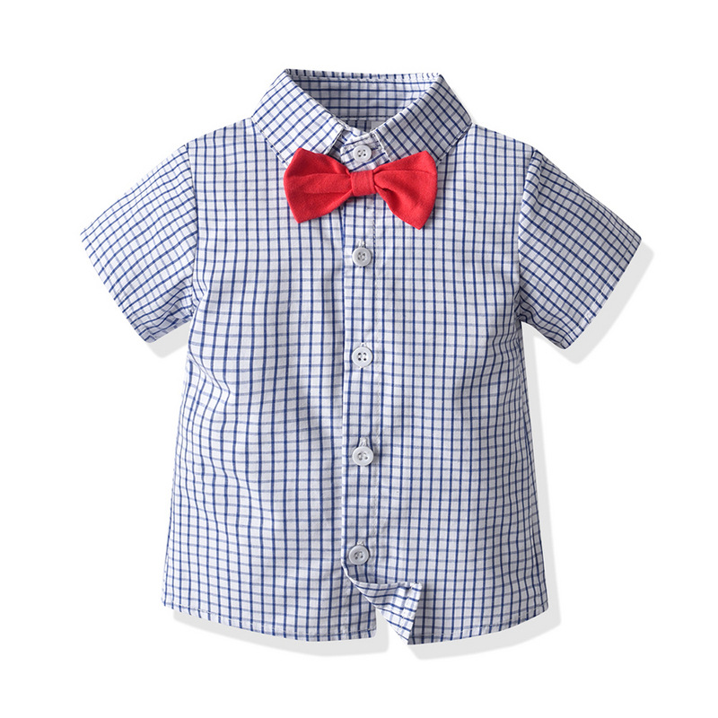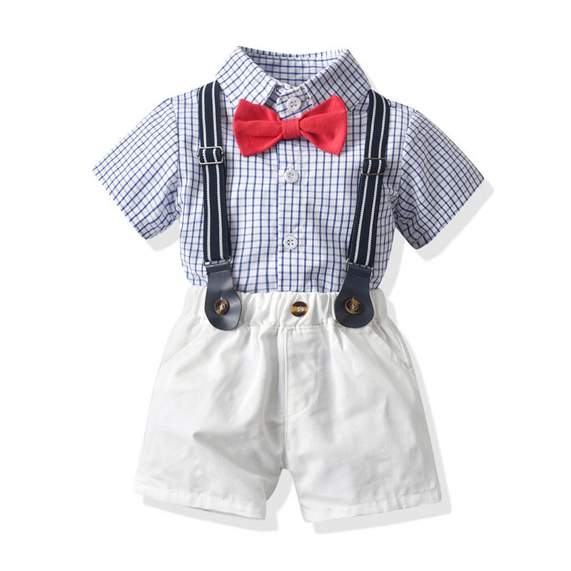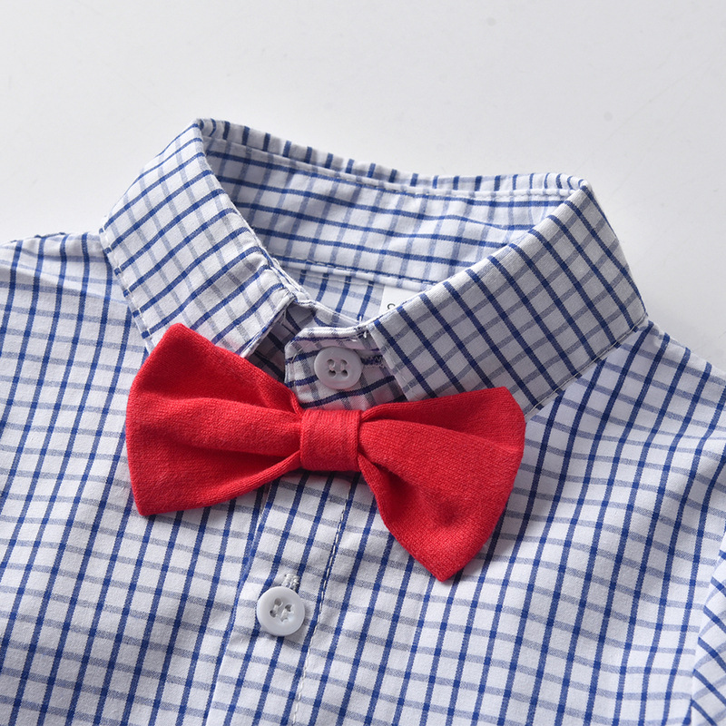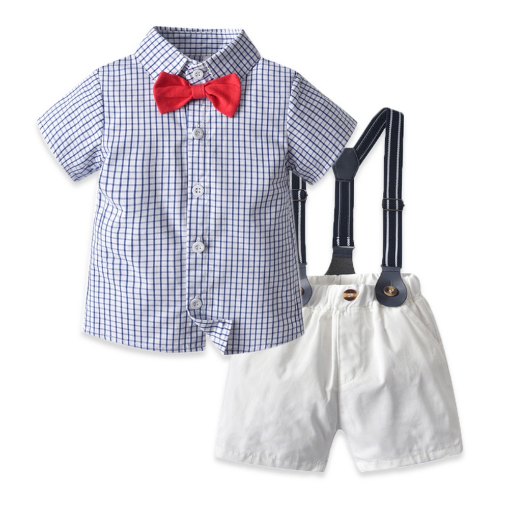 (缺貨)【BB100】韓版紅領結格子兩件式吊帶短袖短褲套裝(1色)