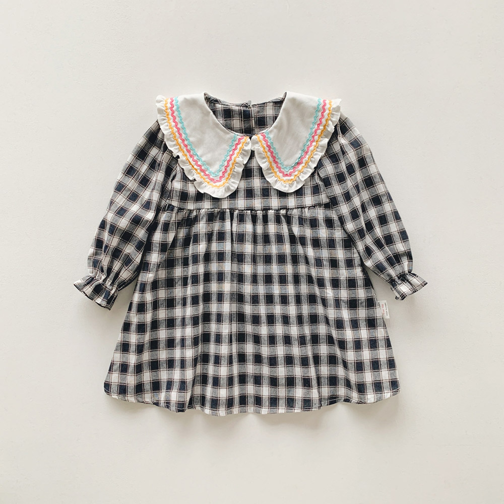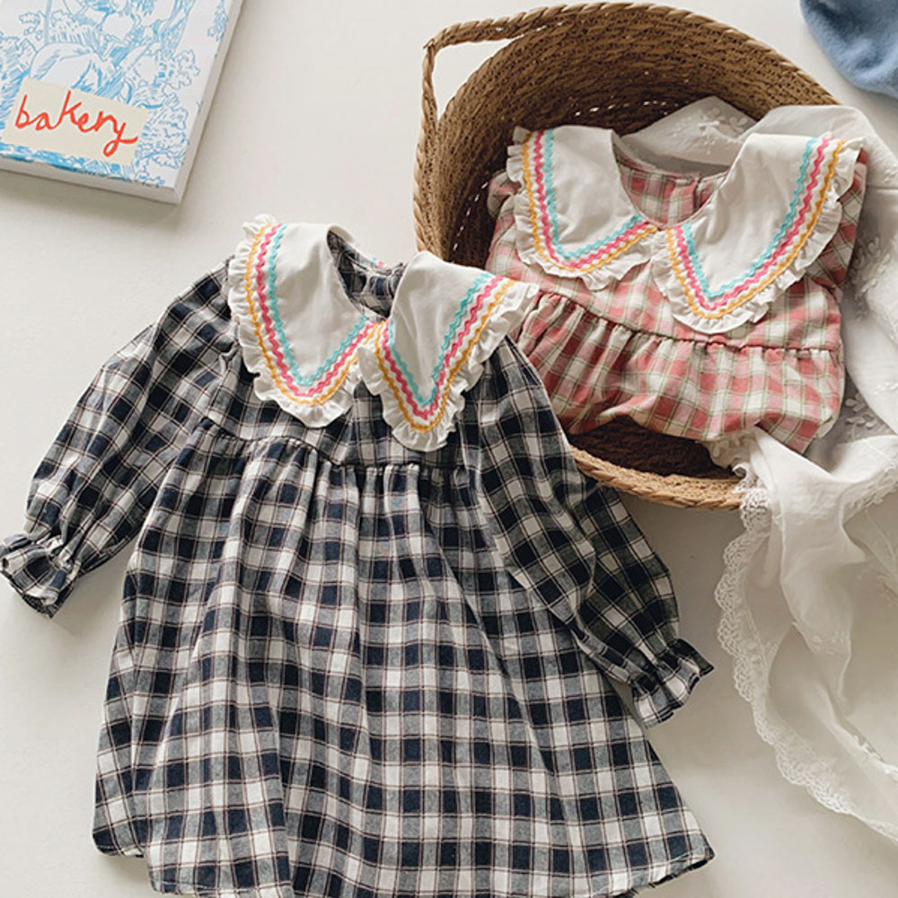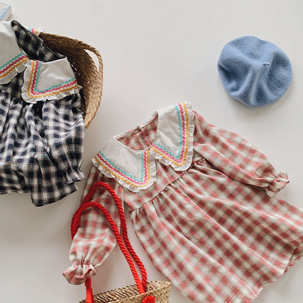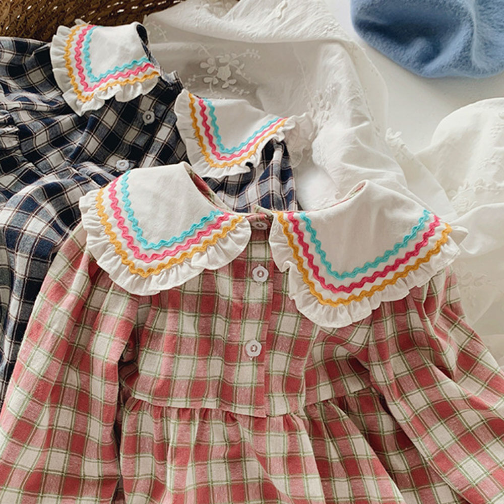 【BG569】法式尖領刺繡花邊格紋長袖澎澎洋裝(2色)