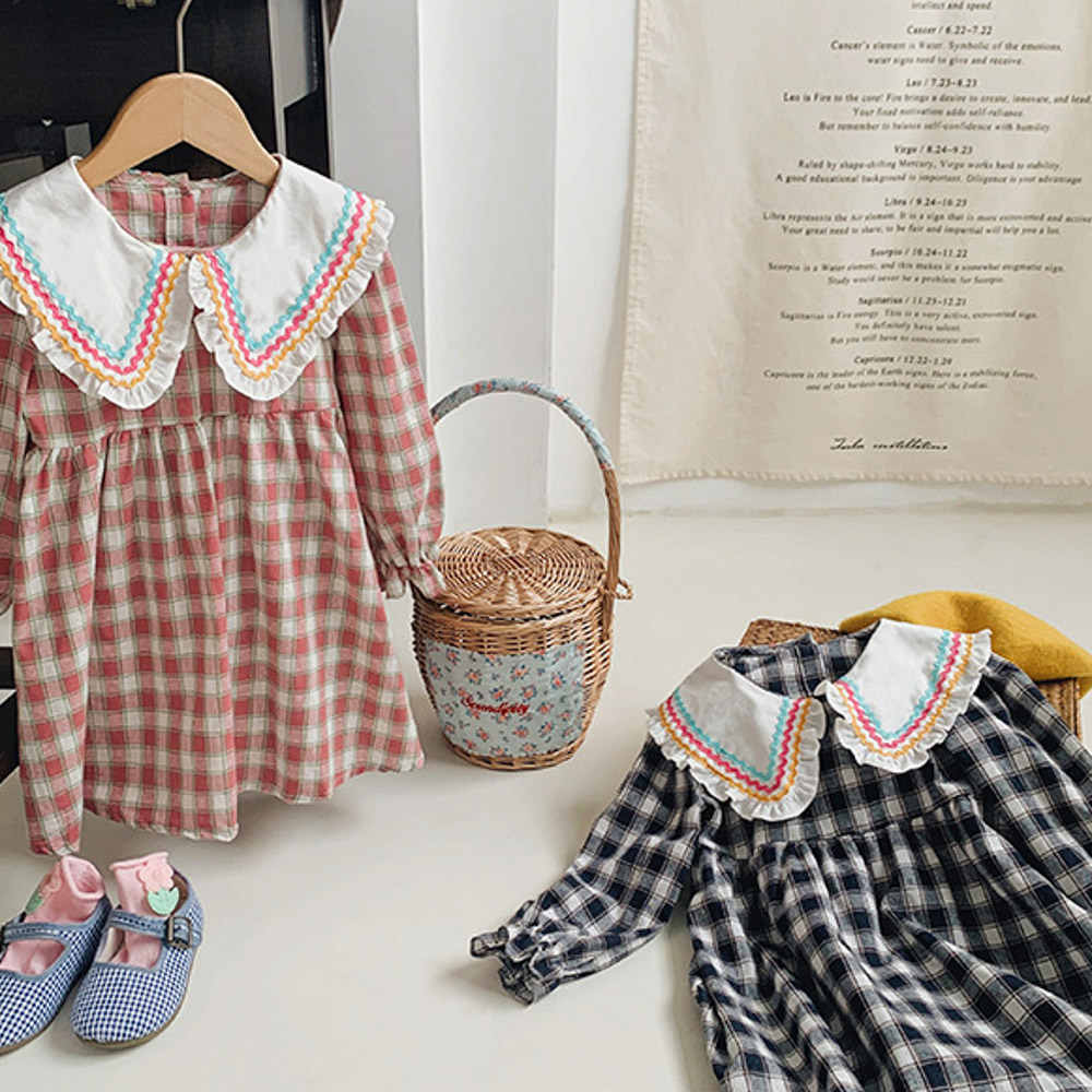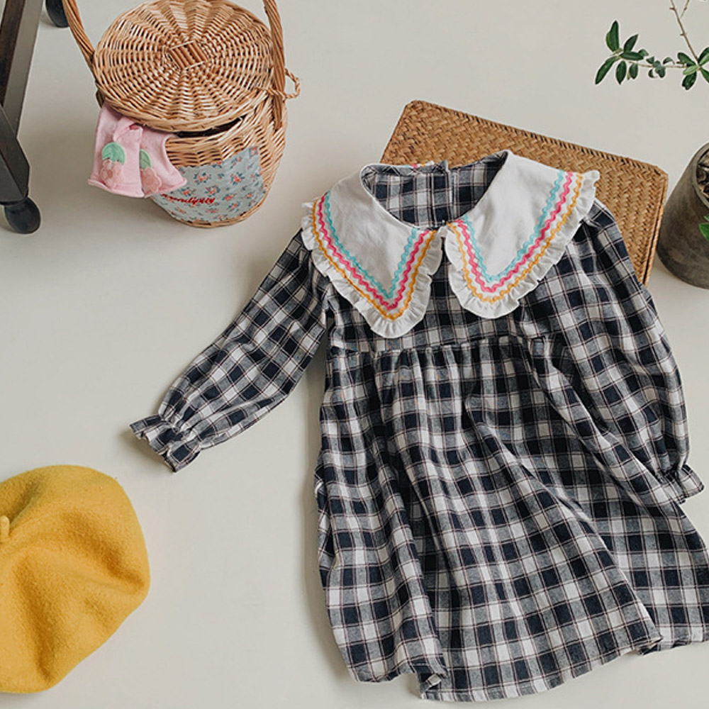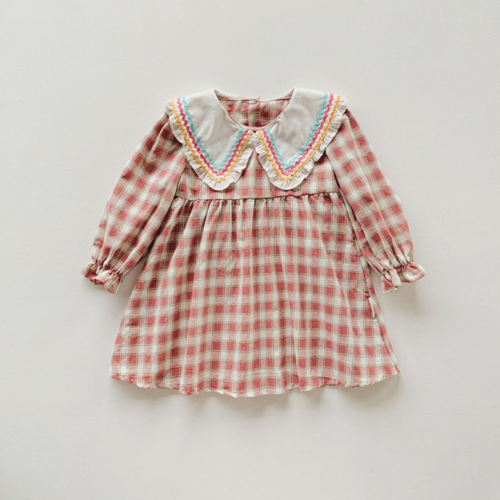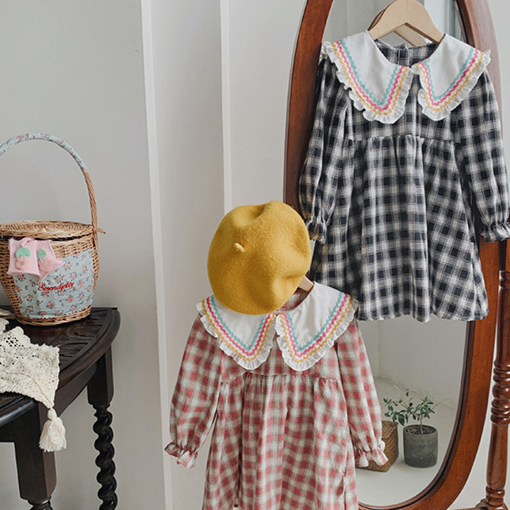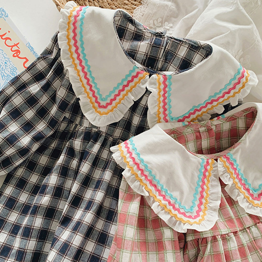 【BG569】法式尖領刺繡花邊格紋長袖澎澎洋裝(2色)