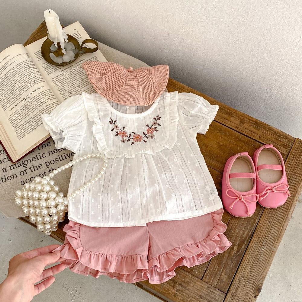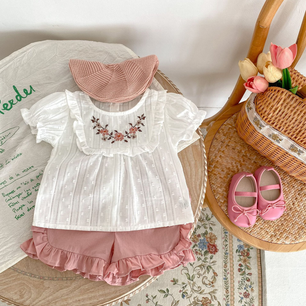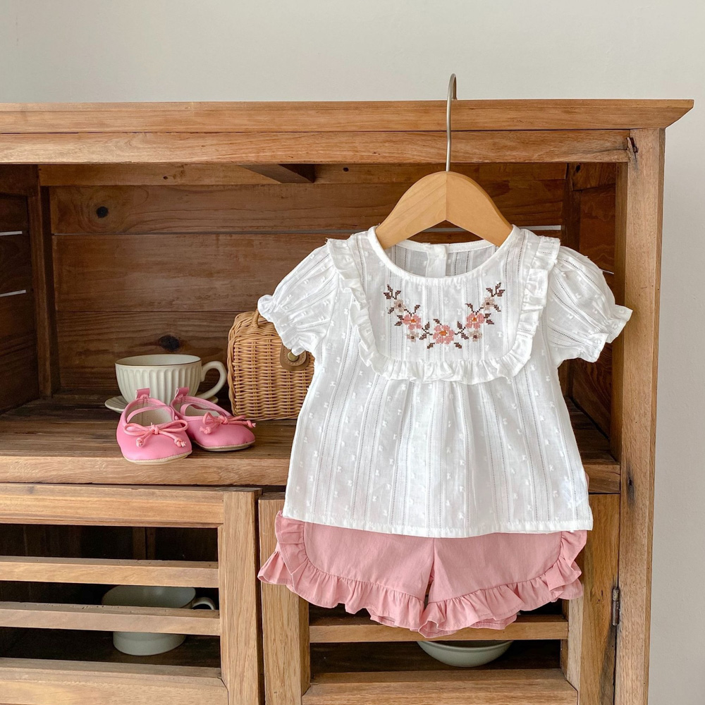 (缺貨)【BA622】日系刺繡小花兩件式短袖短褲套裝(1色)