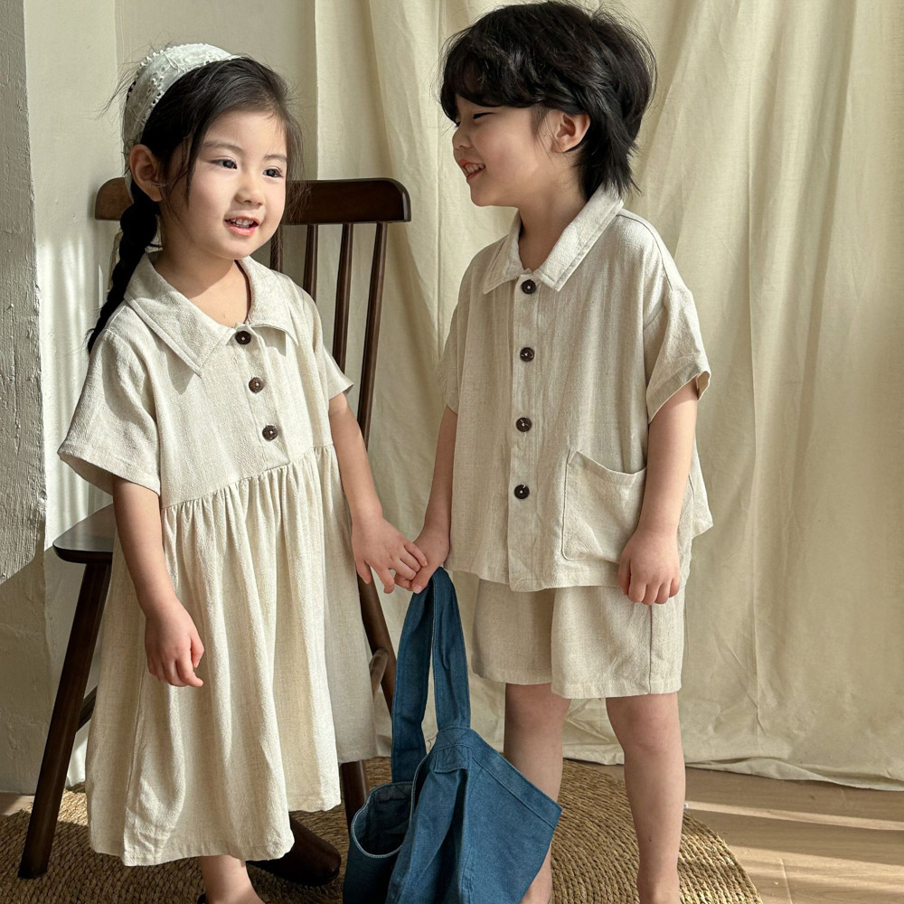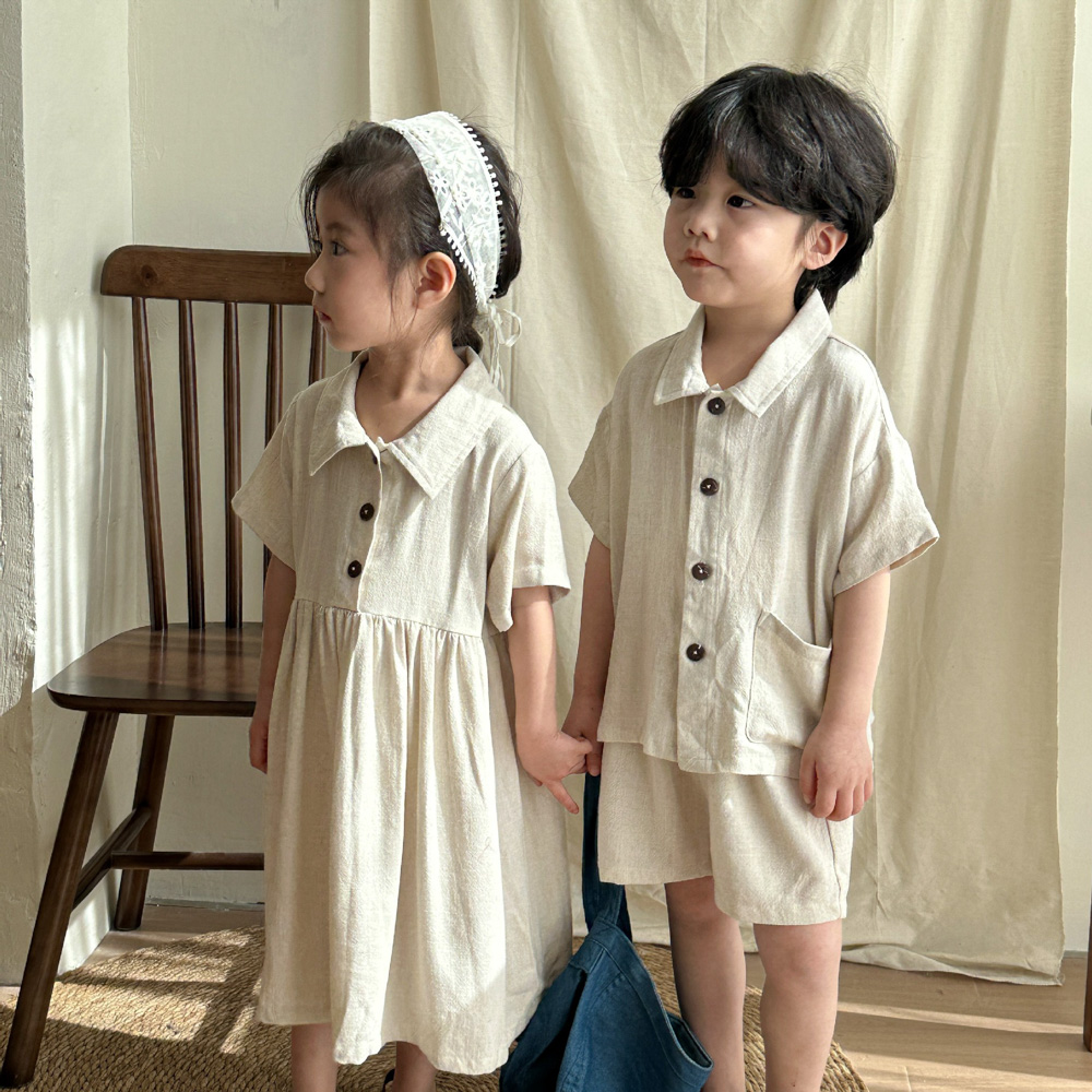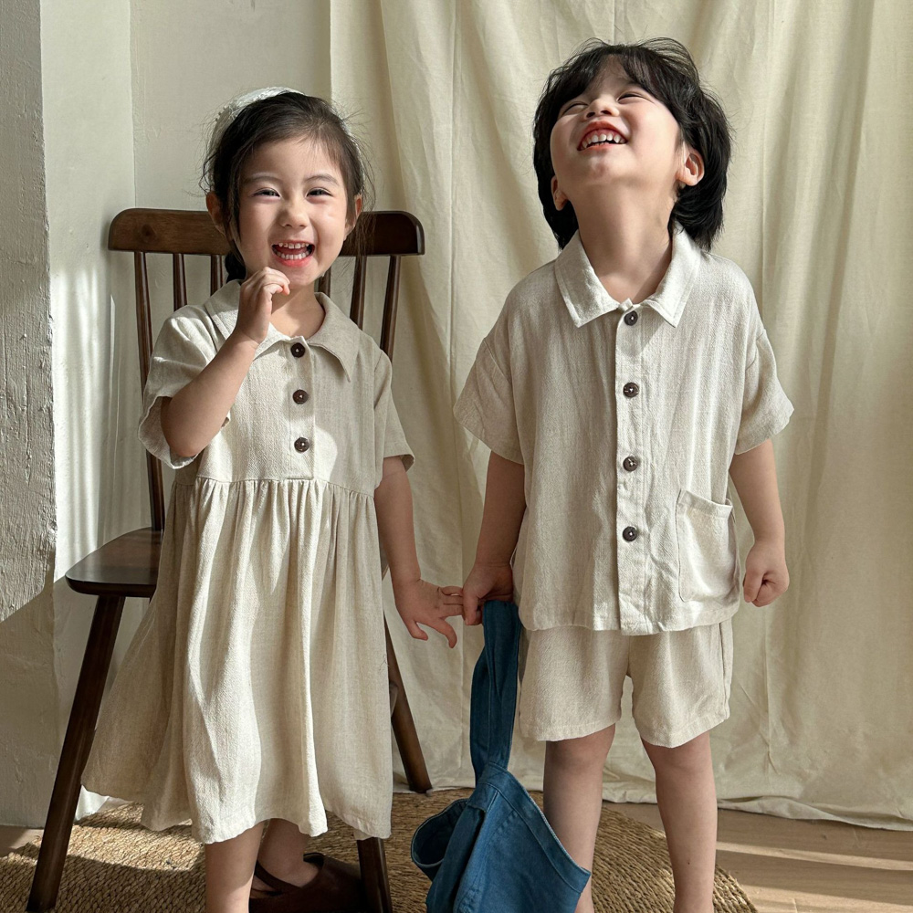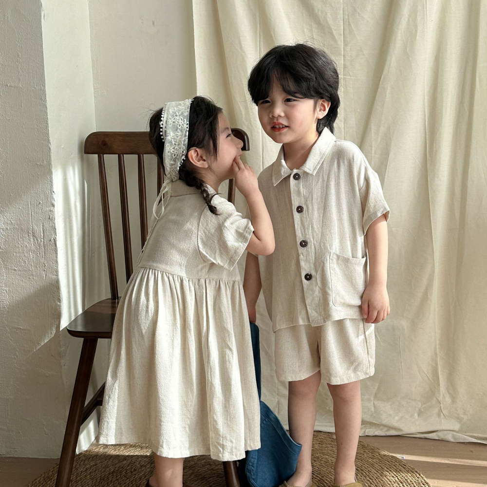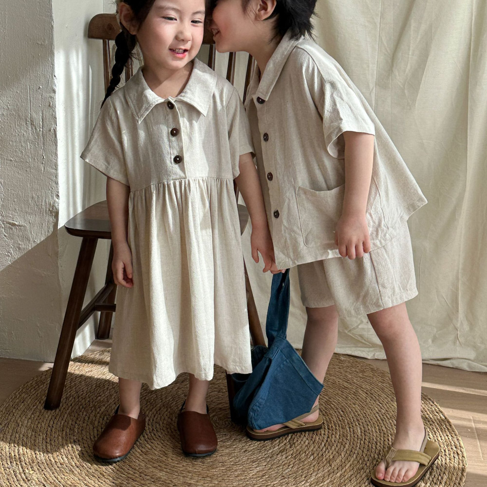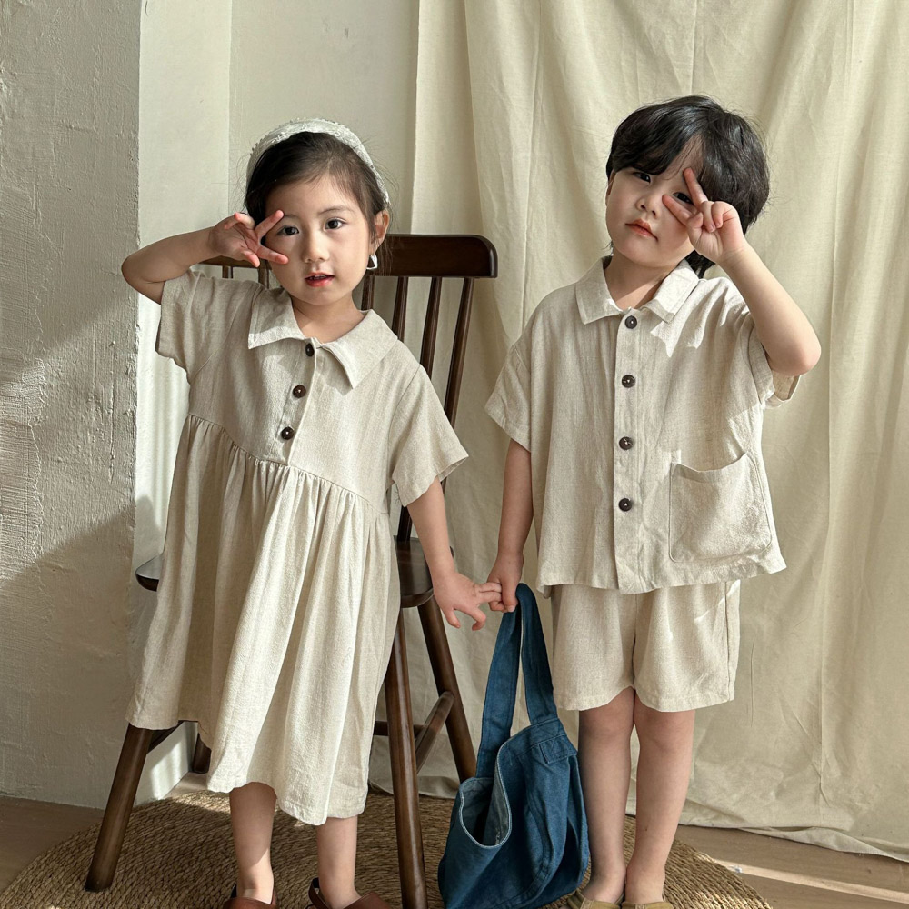 【BS117】韓版純色小鈕扣兄妹短袖洋裝套裝(1色)
