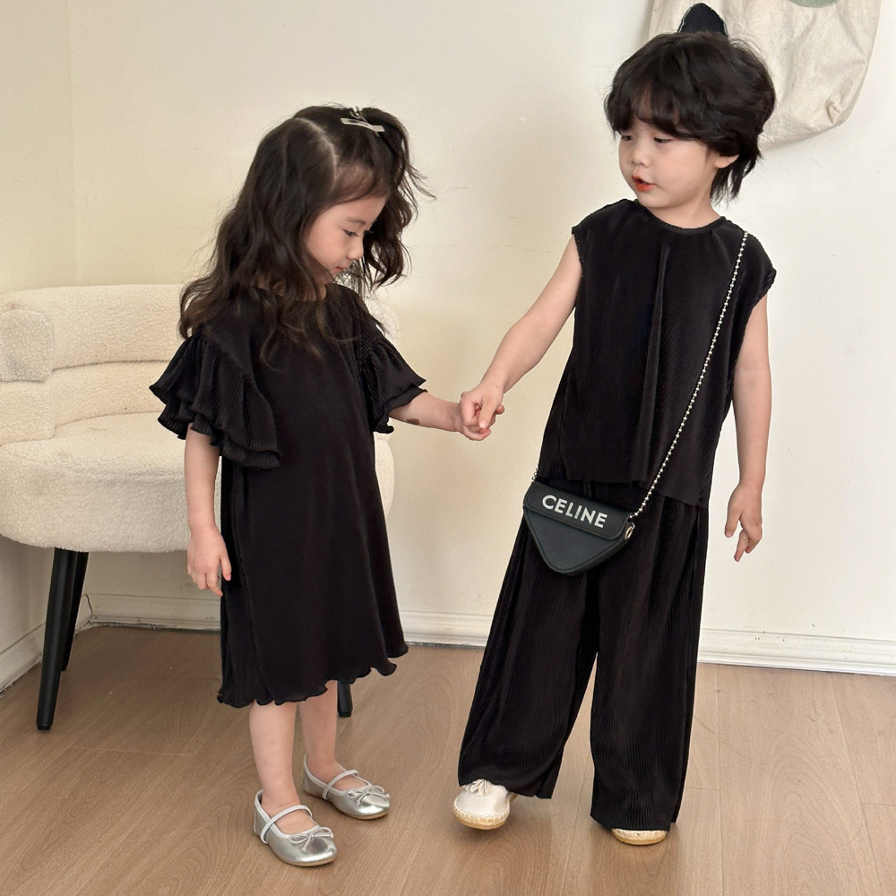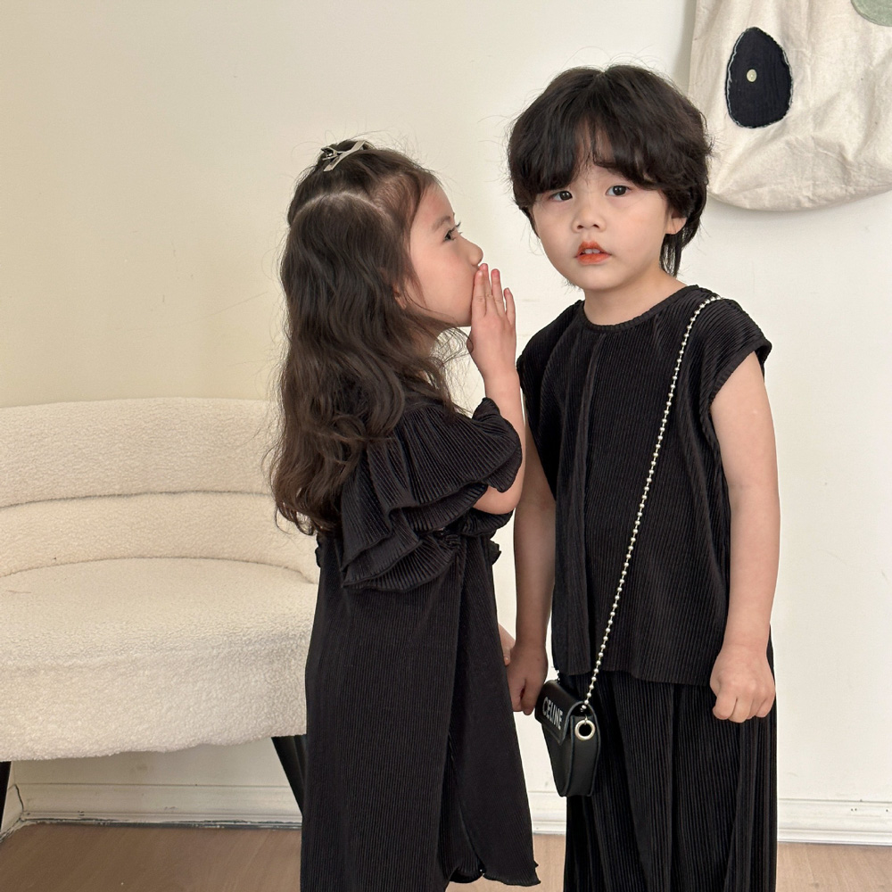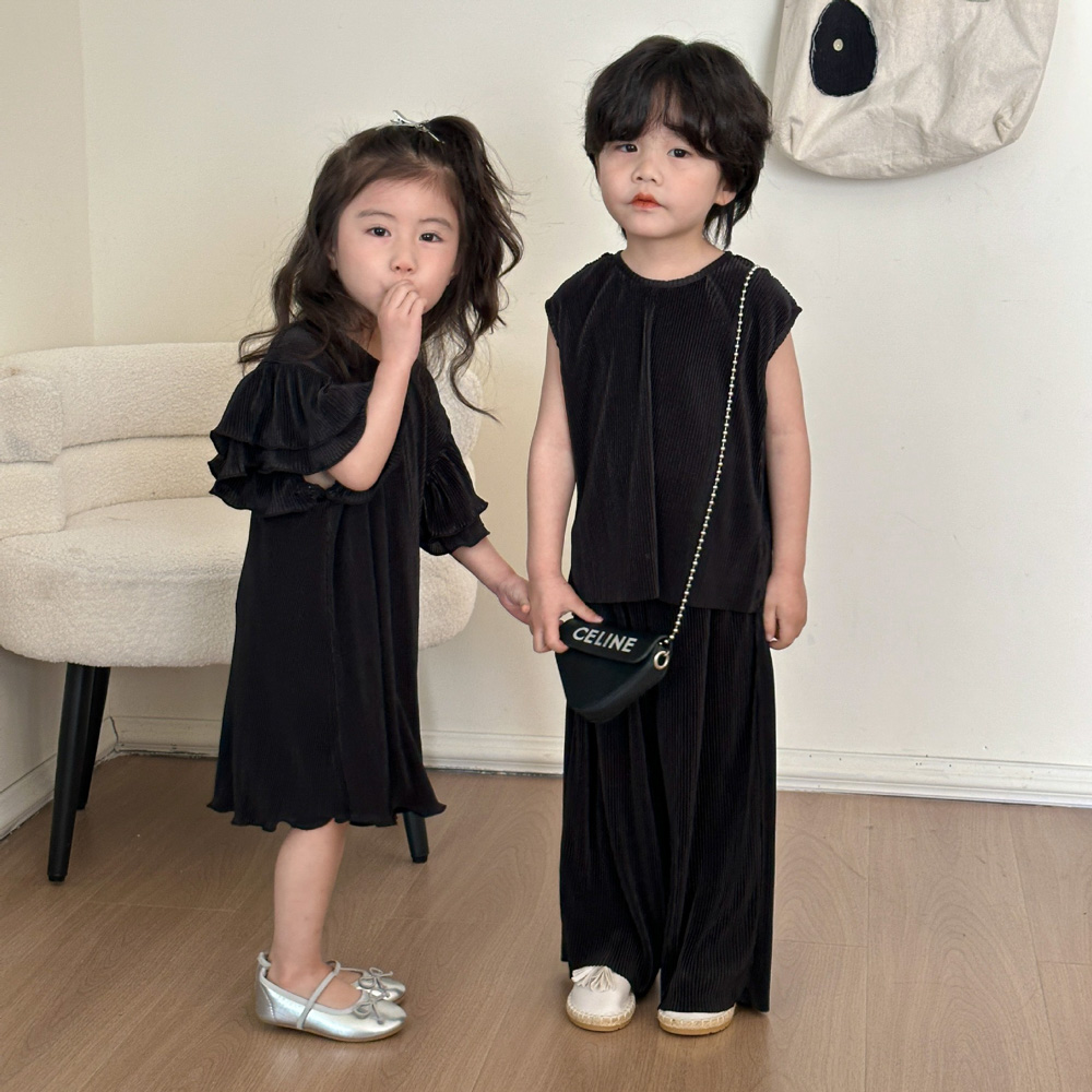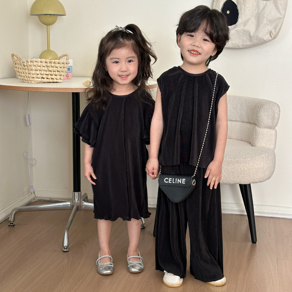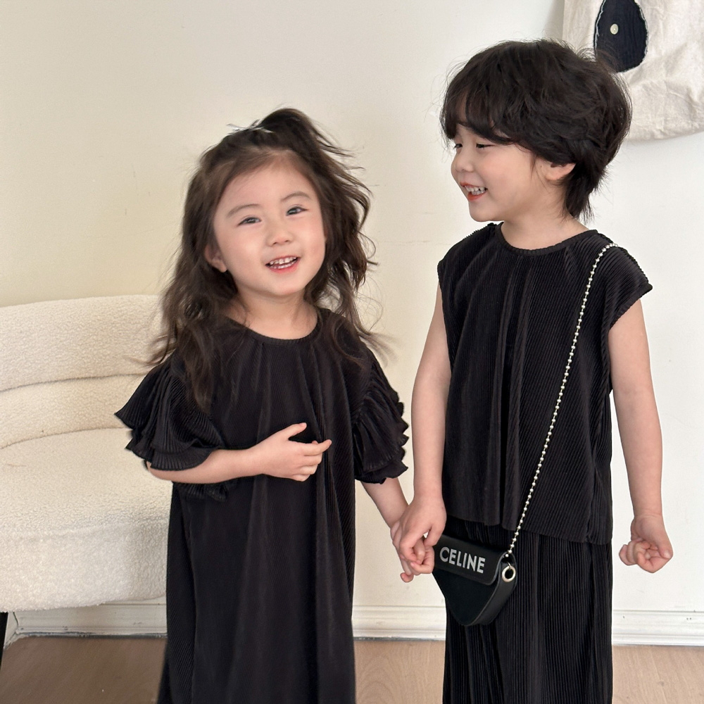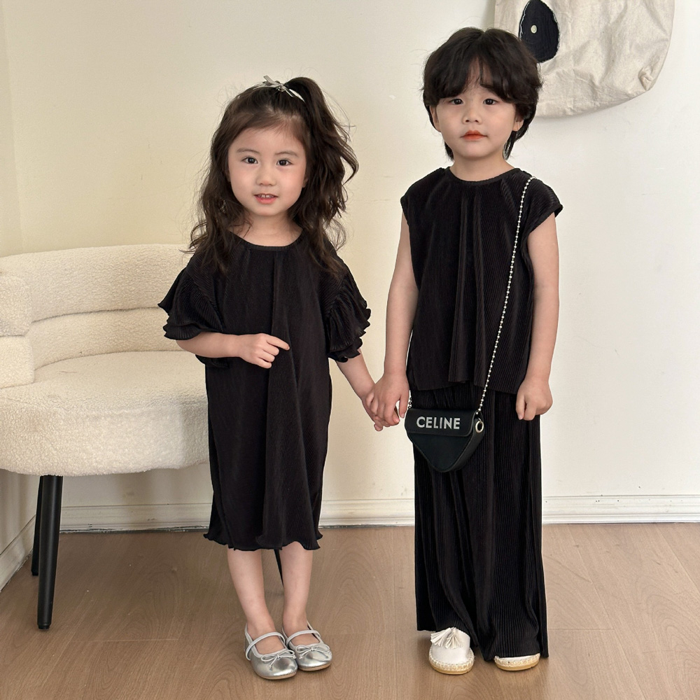 【BS124】韓版純色百褶兄妹短袖洋裝套裝(2色)