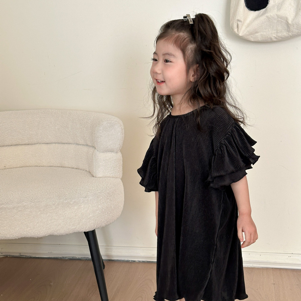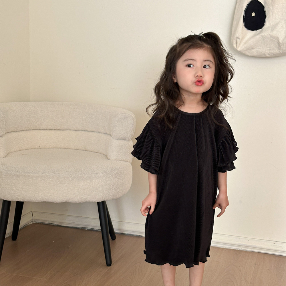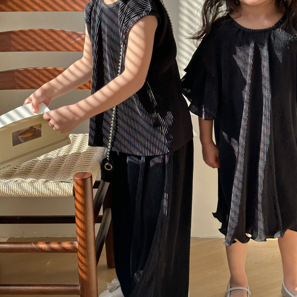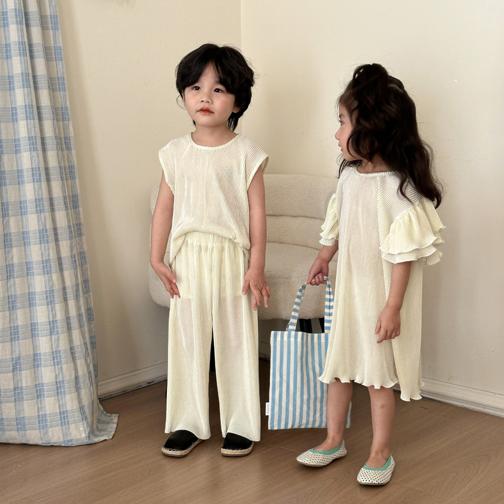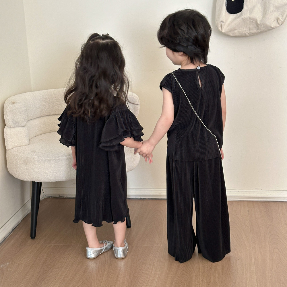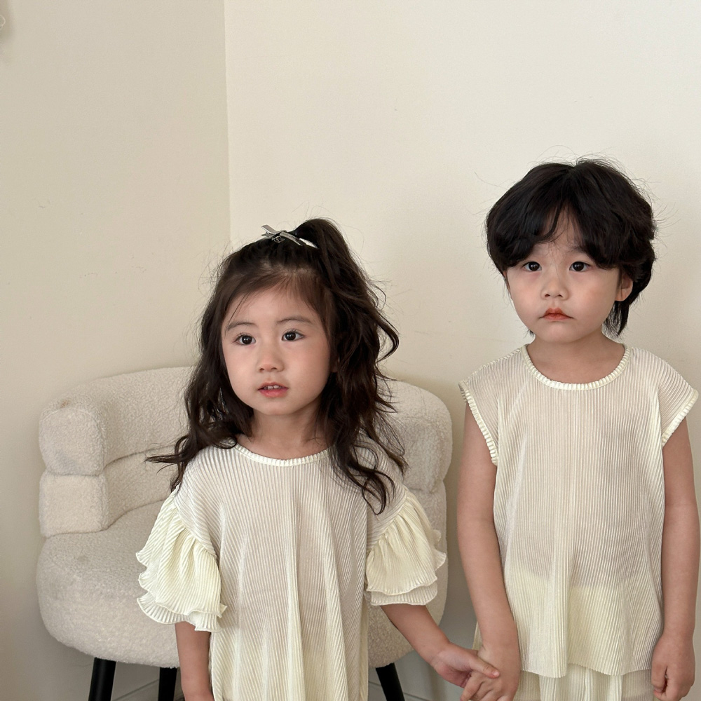 【BS124】韓版純色百褶兄妹短袖洋裝套裝(2色)