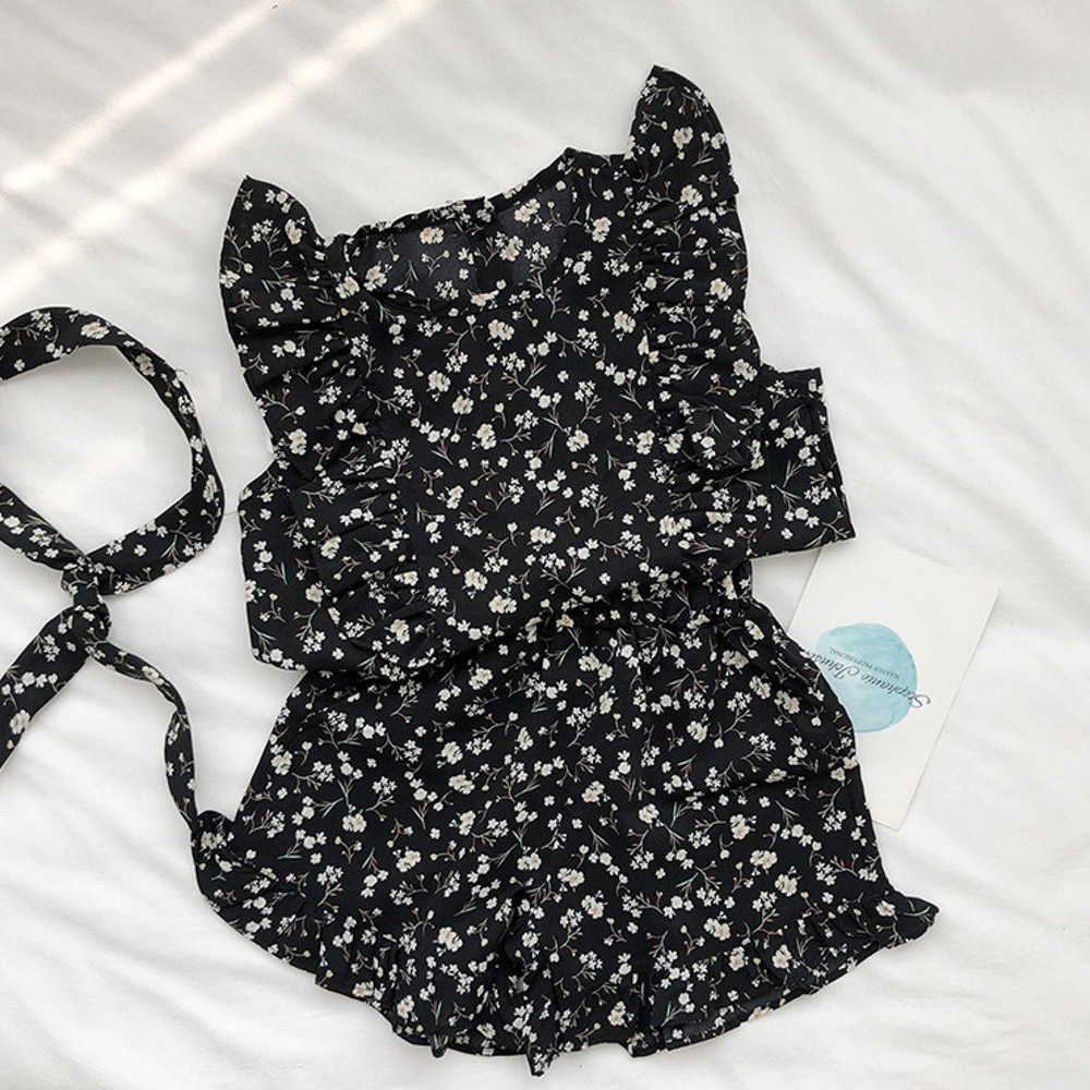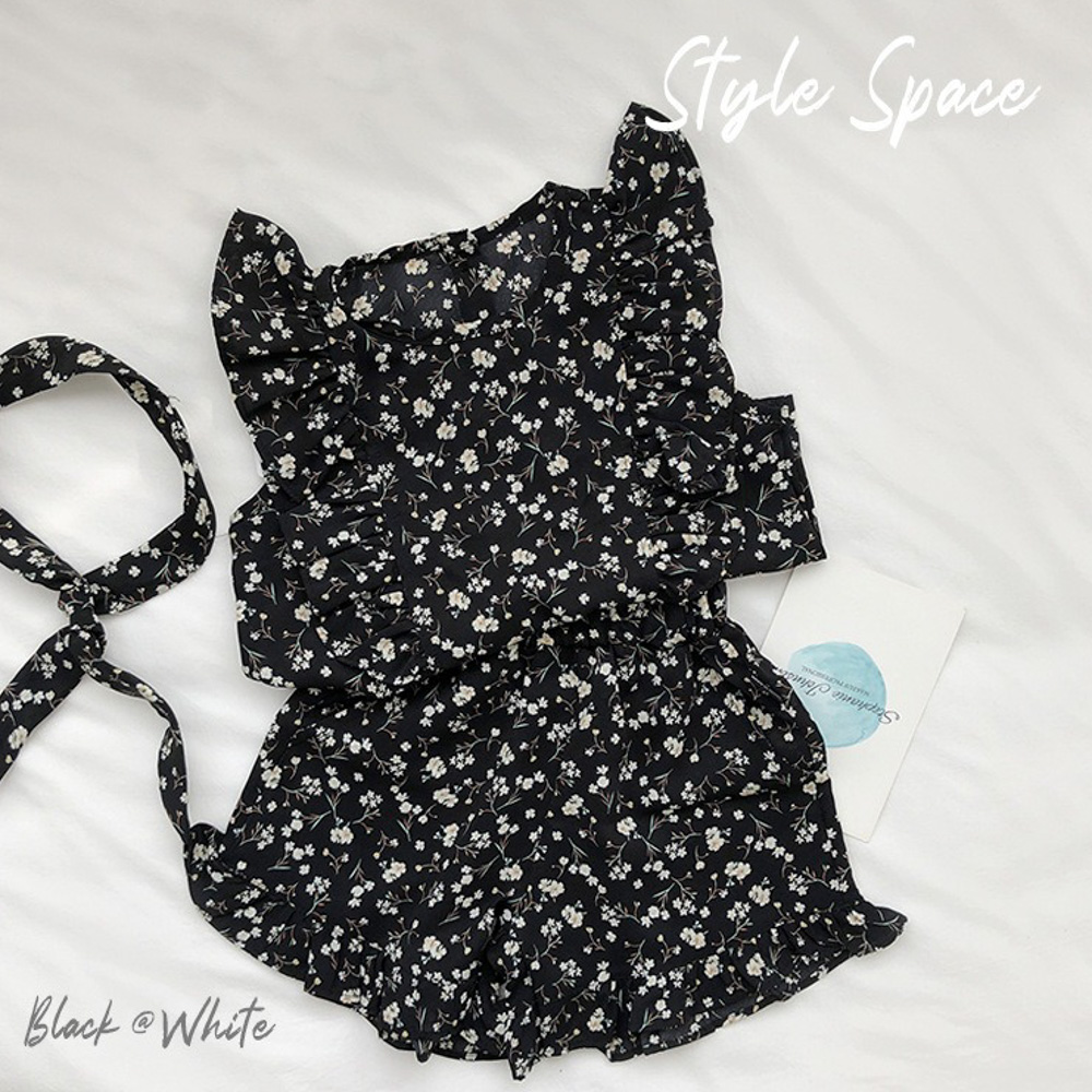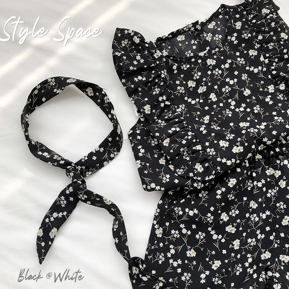 【BG762】日系黑白碎花兩件式無袖短褲套裝(送髮帶)(1色)
