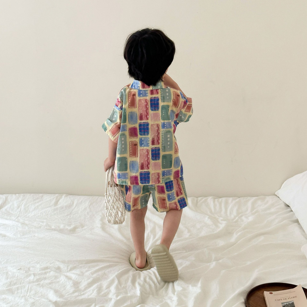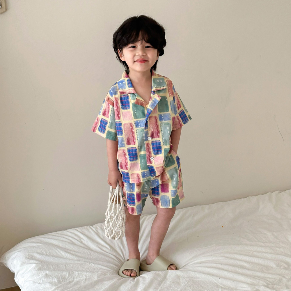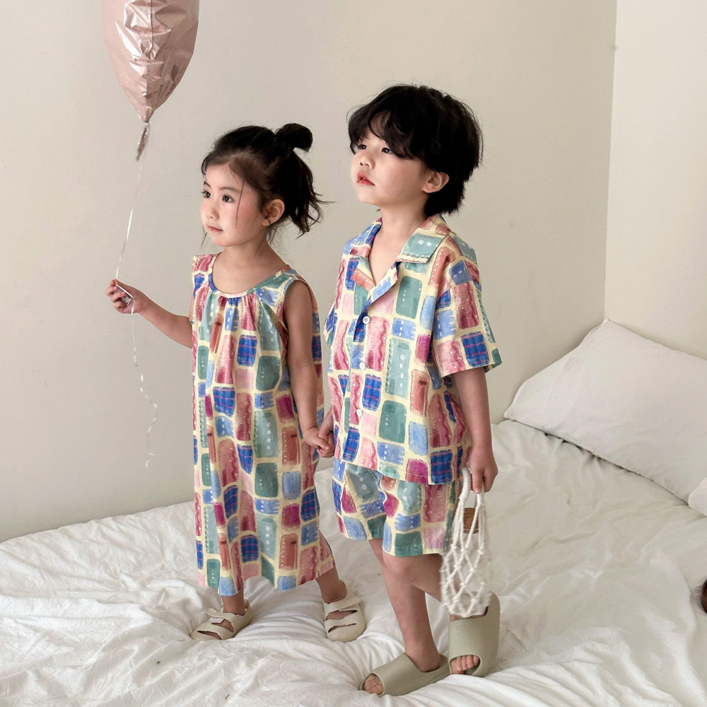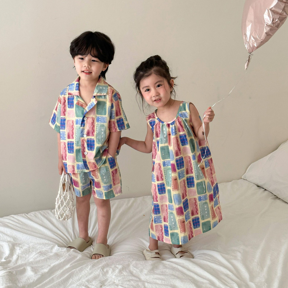 【BS132】韓版彩色方塊兄妹短袖洋裝套裝(1色)