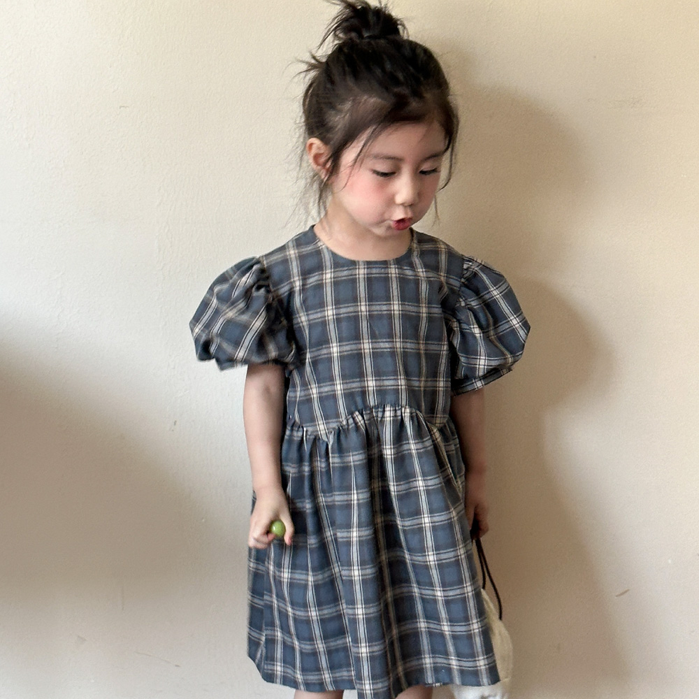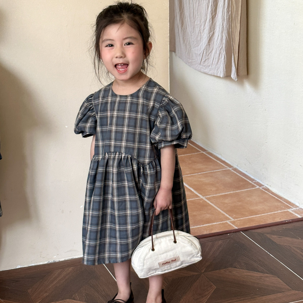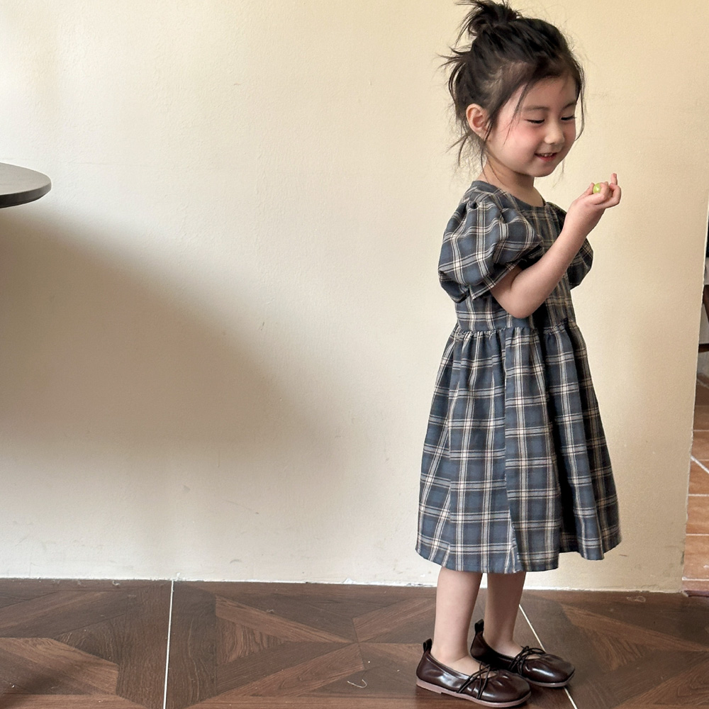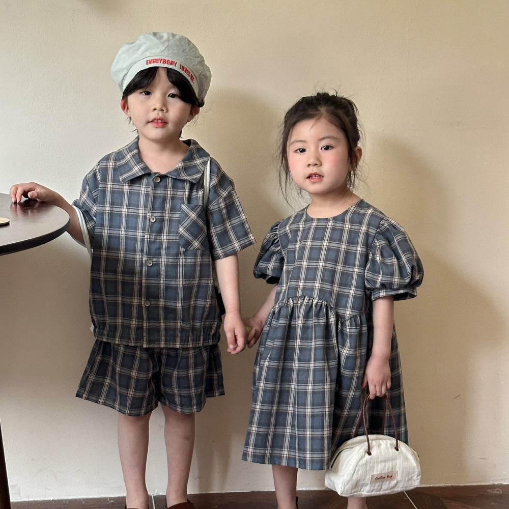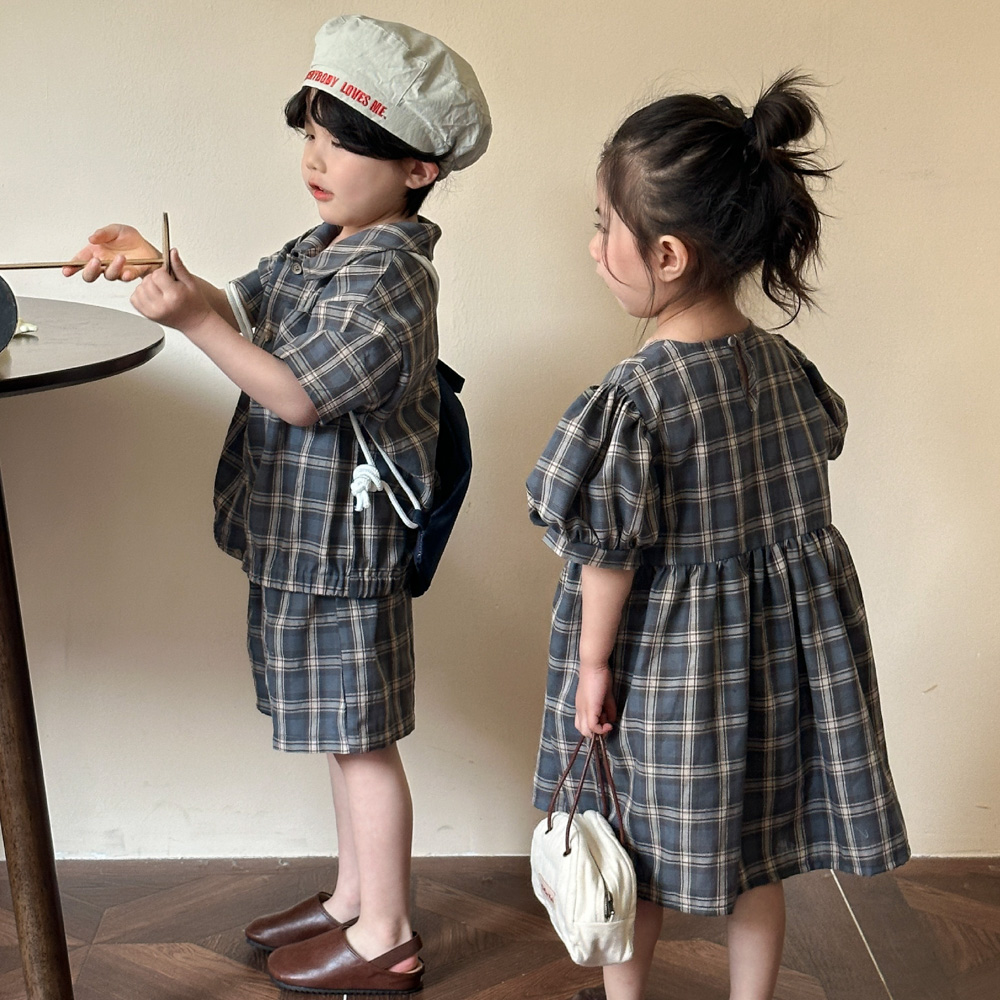 【BS135】韓版復古格紋兄妹短袖洋裝套裝(1色)