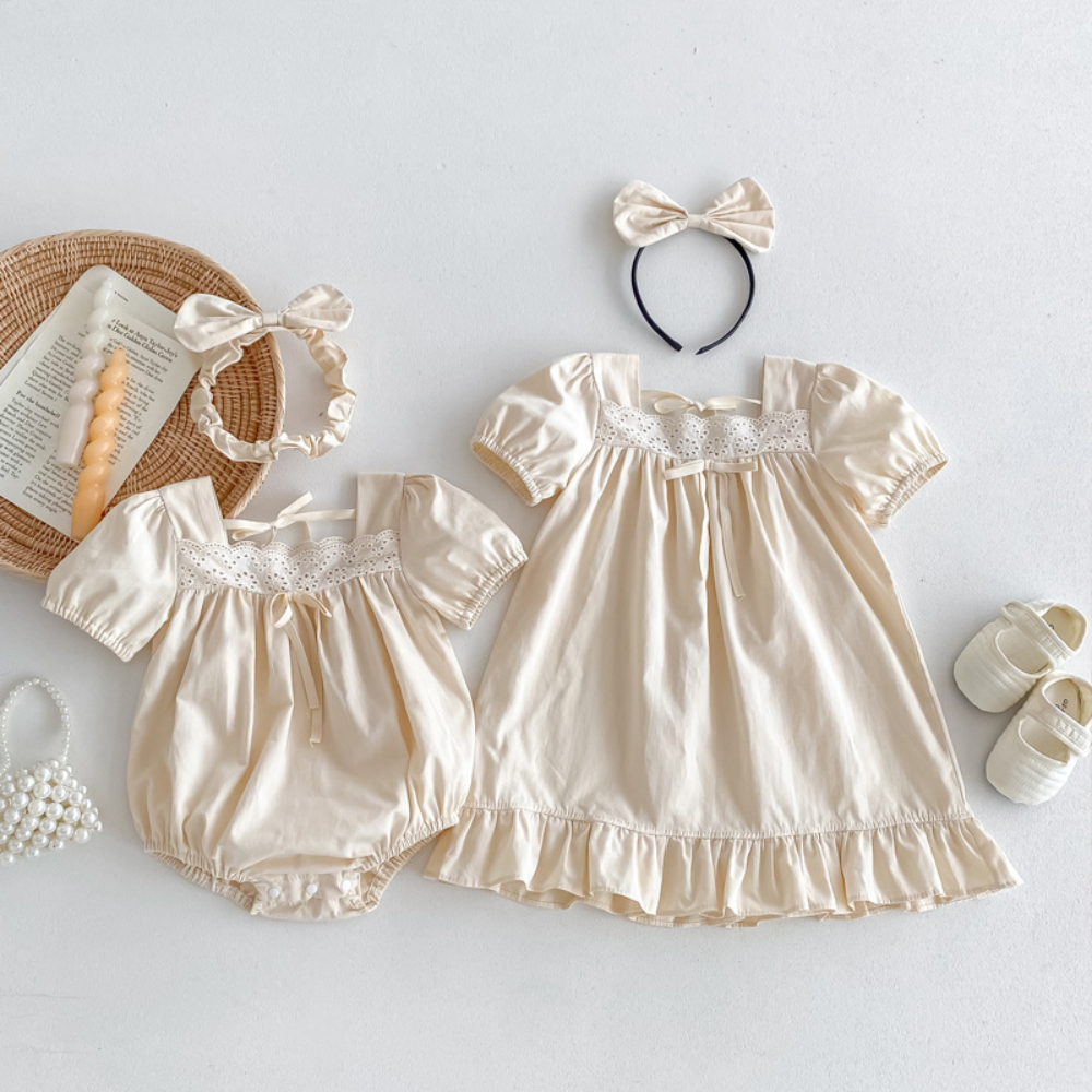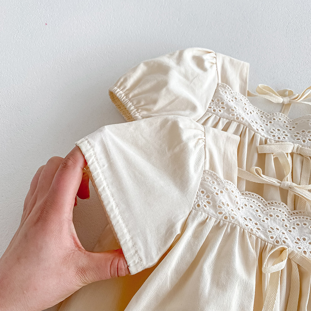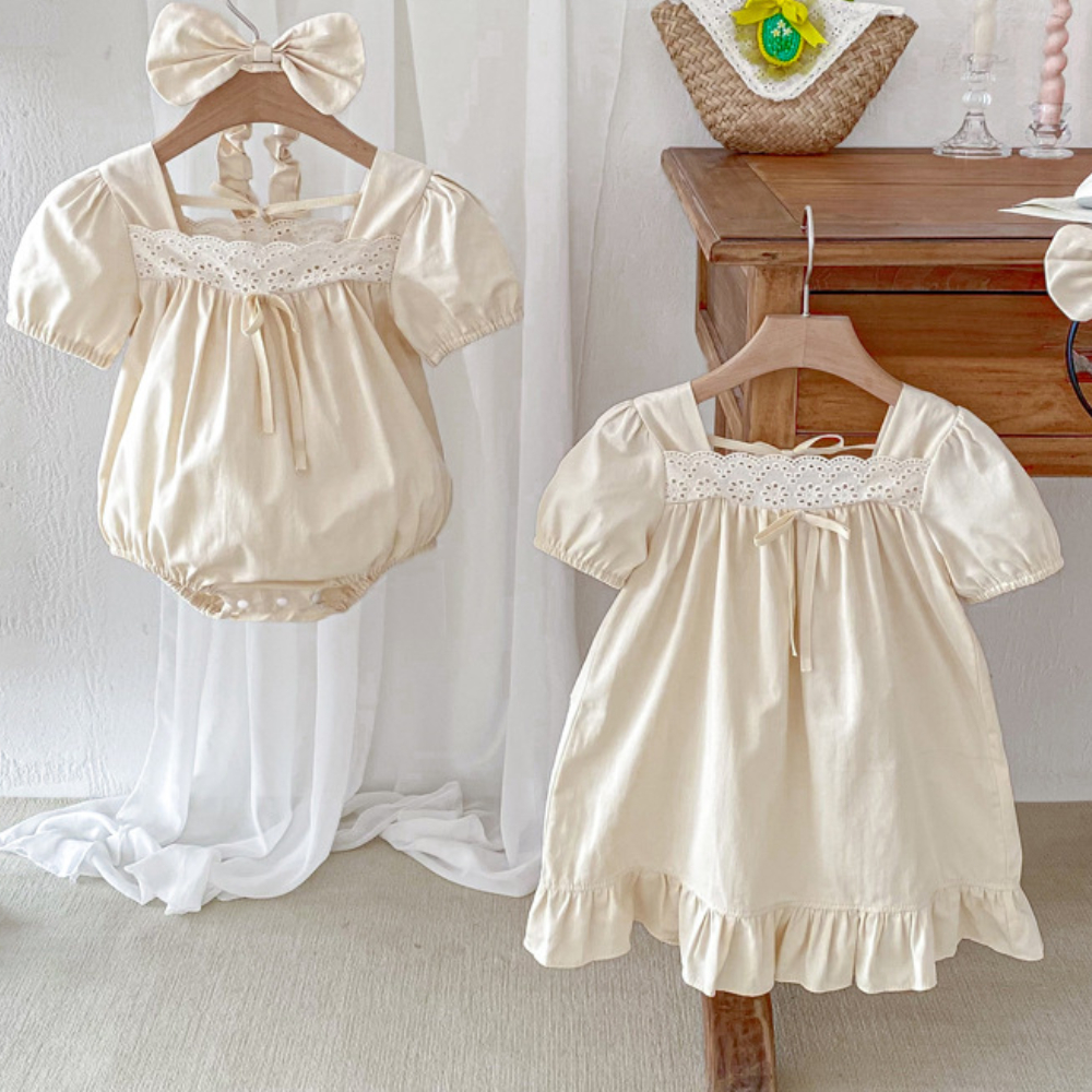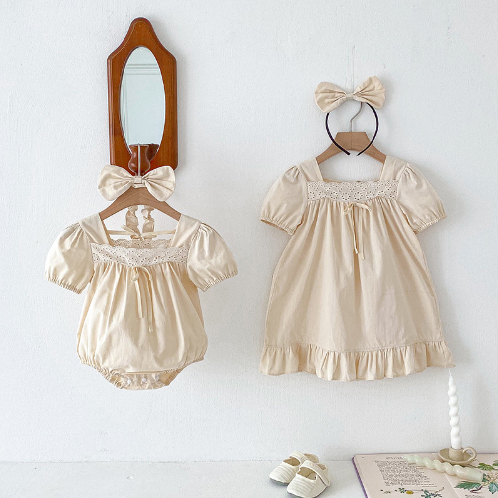 【BS157】韓版奶茶色鏤空蕾絲短袖包屁衣小洋裝(送髮箍)(1色)