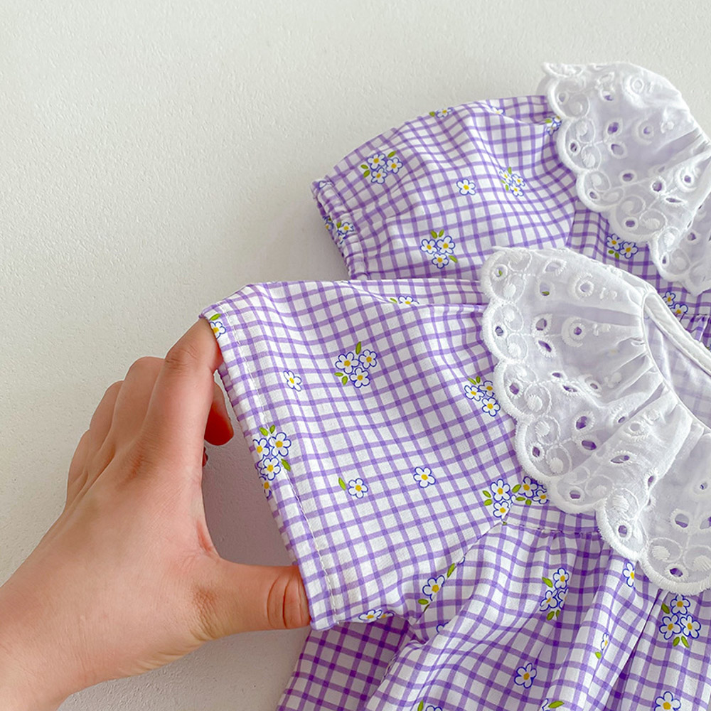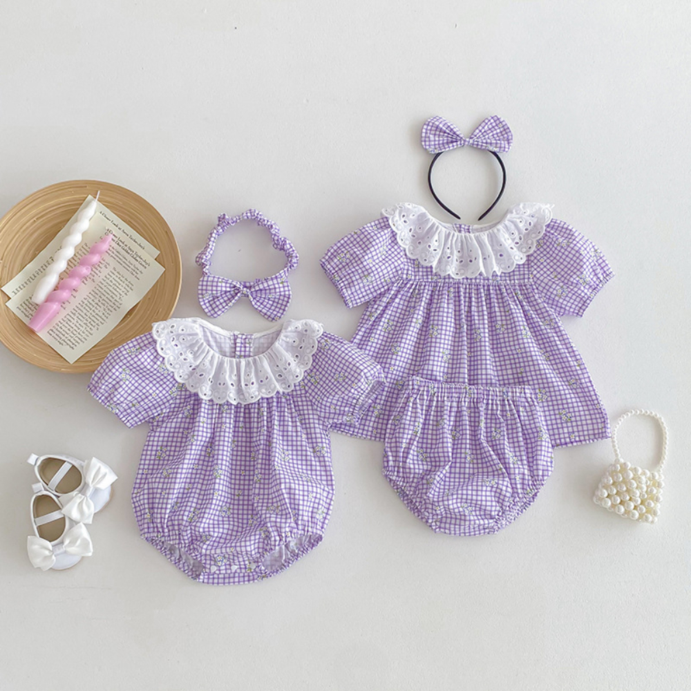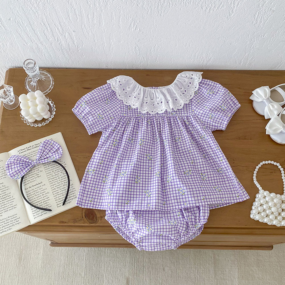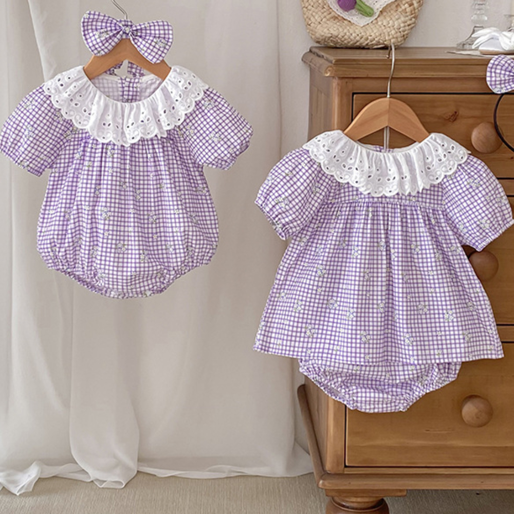 【BS164】韓版蕾絲圓領紫羅蘭格紋短袖包屁衣套裝(送髮箍)(1色)