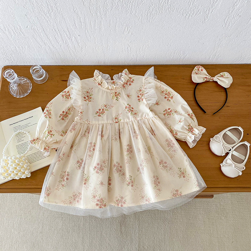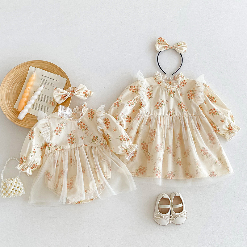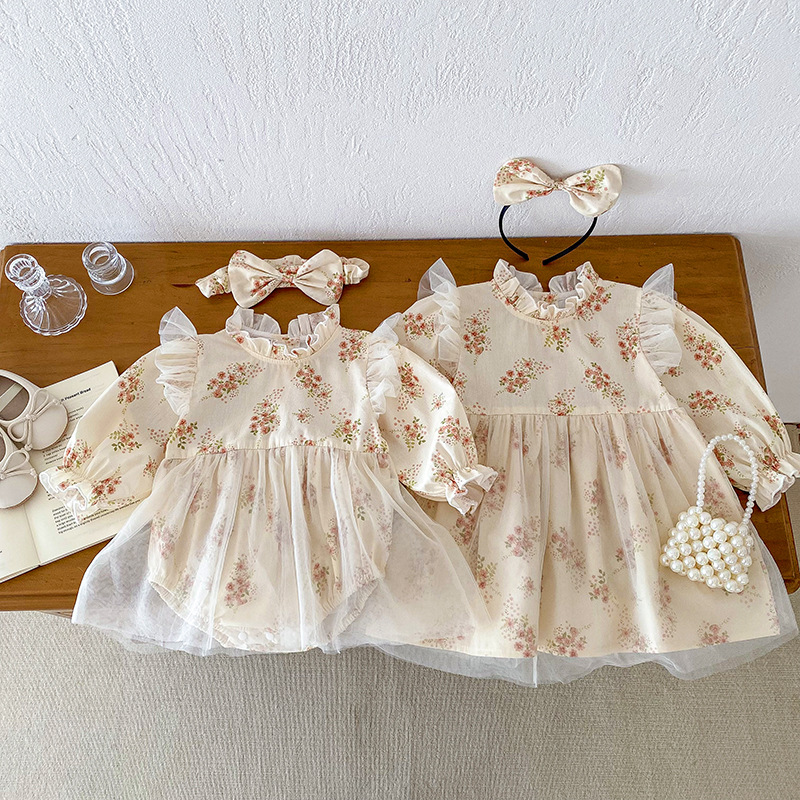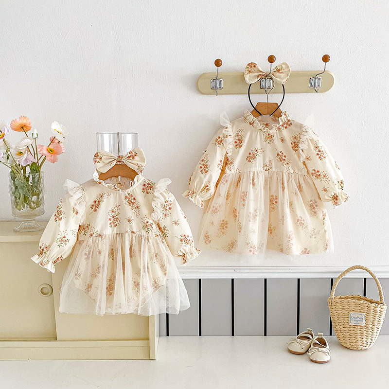 【BS220】韓版小碎花網紗長袖包屁衣小洋裝(送髮箍)(1色)