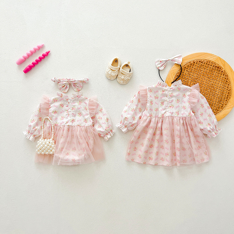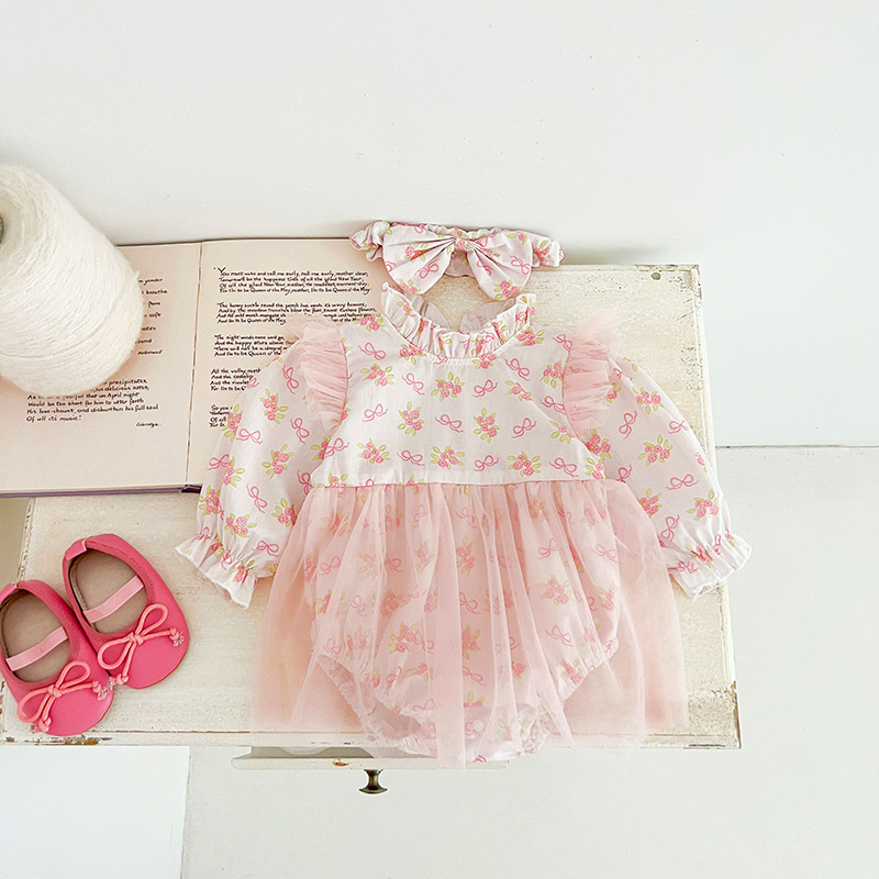 【BS221】韓版蝴蝶結小碎花網紗長袖包屁衣小洋裝(送髮箍)(1色)