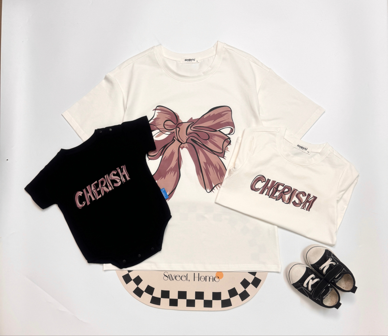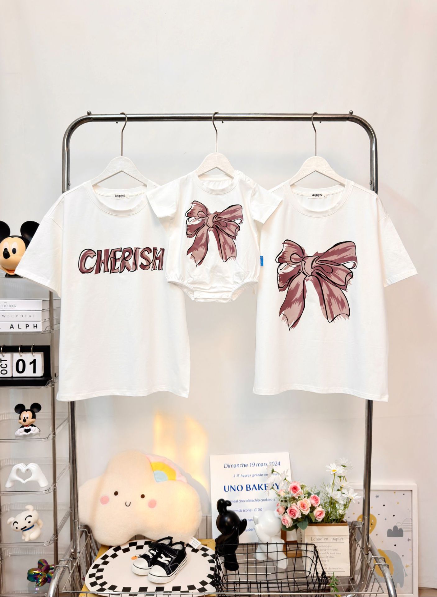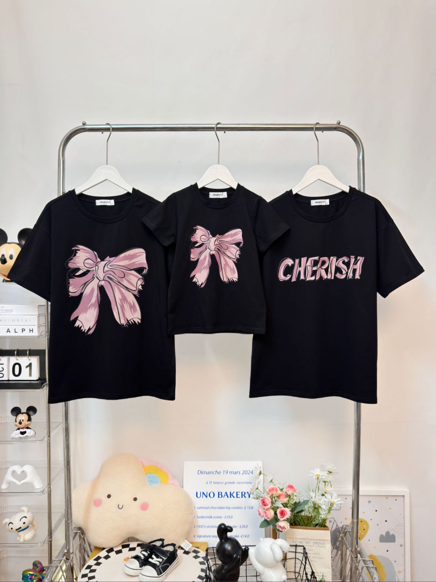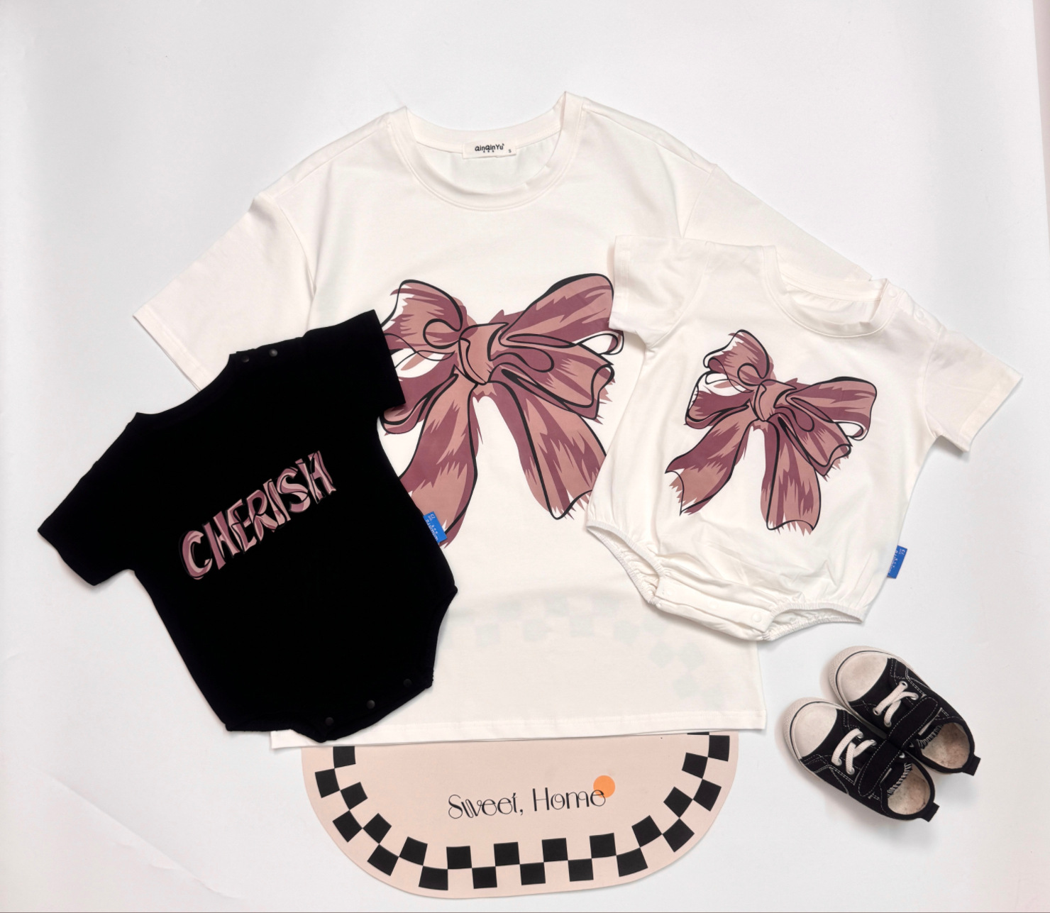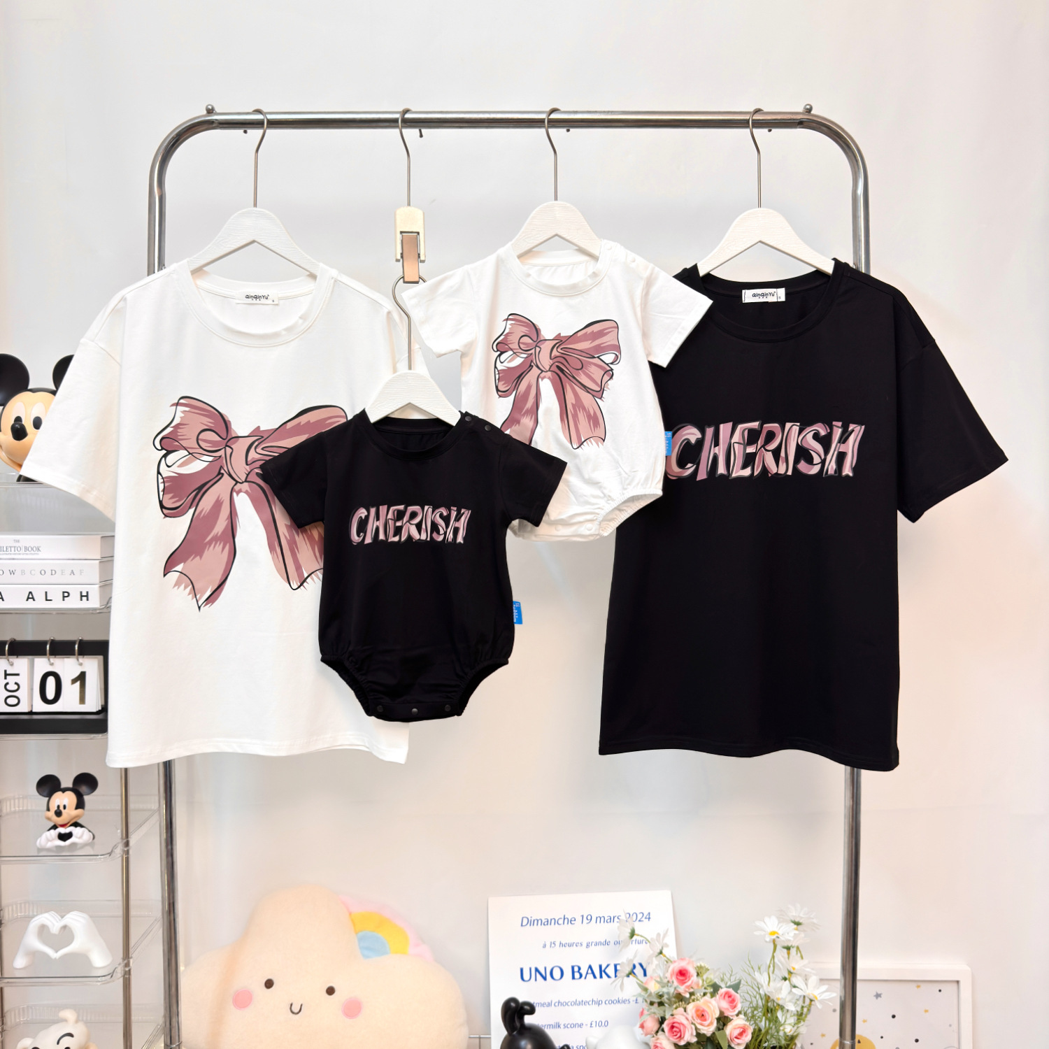 【F142】日系字母大蝴蝶結全家福親子短袖上衣(2色)
