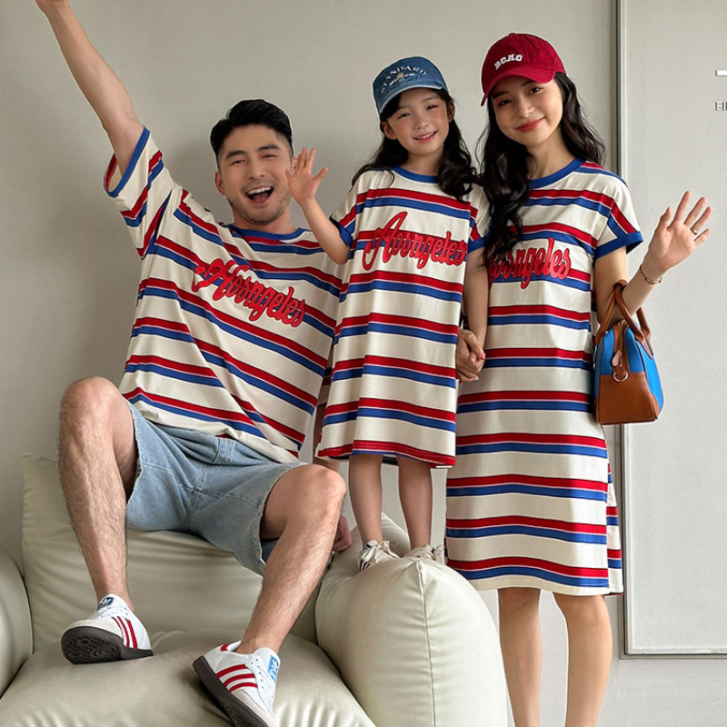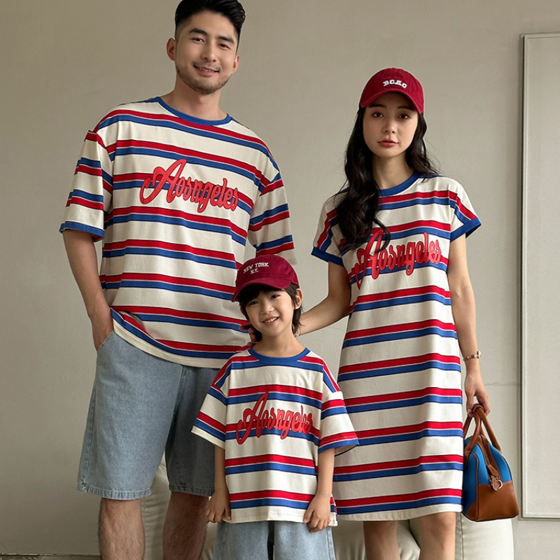 【F187】日系字母紅藍條紋全家福親子短袖上衣洋裝(1色)
