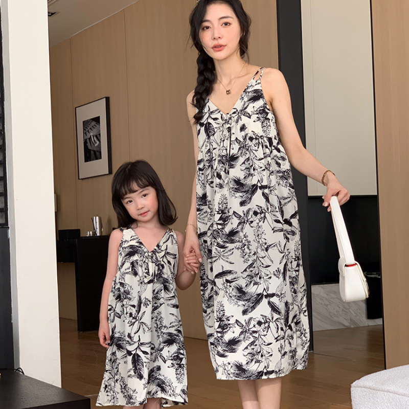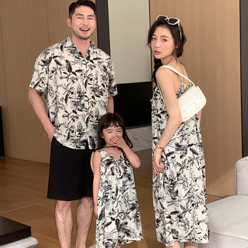 【F188】日系渡假黑白花全家福親子短袖襯衫洋裝(1色)