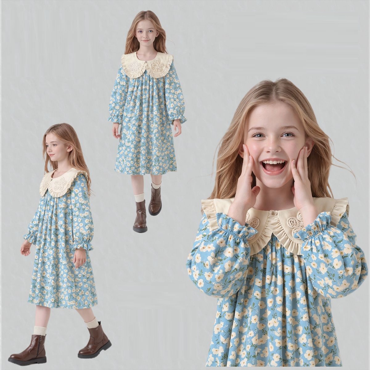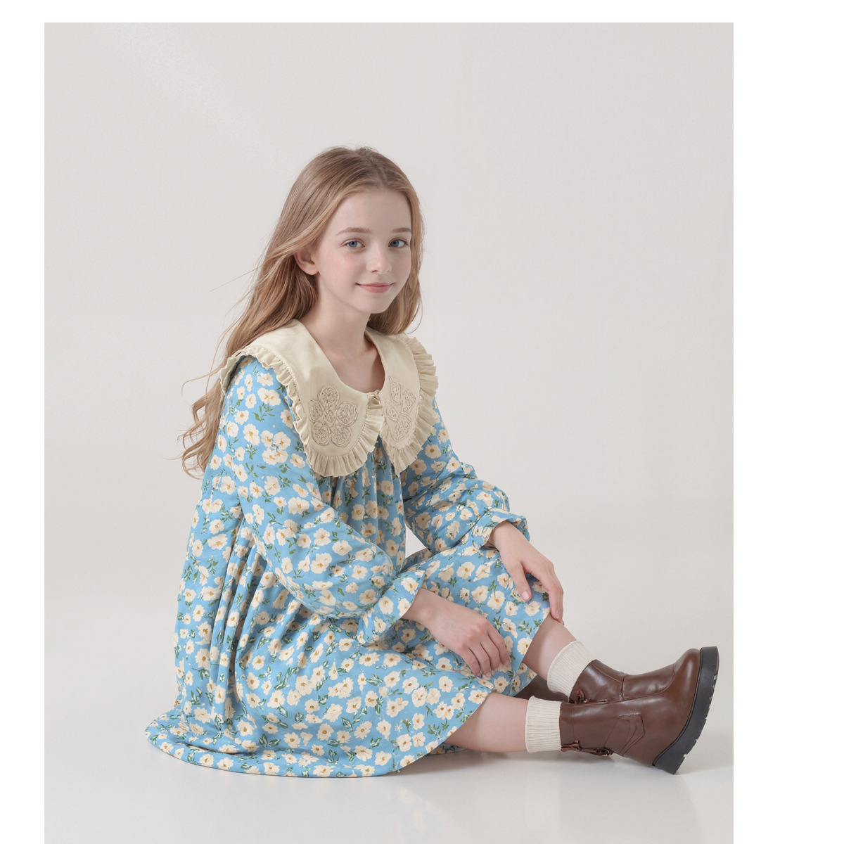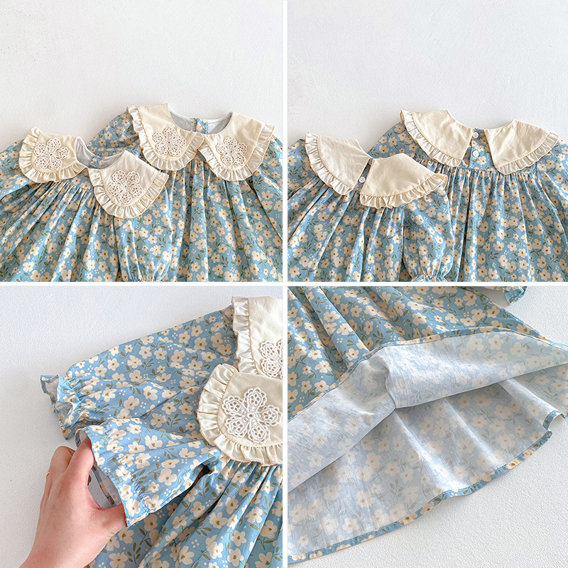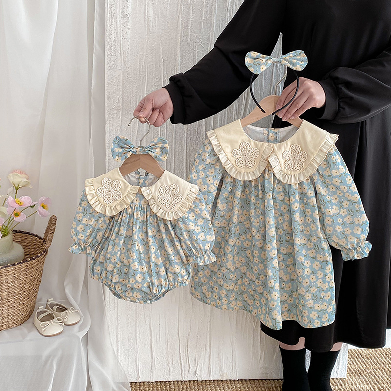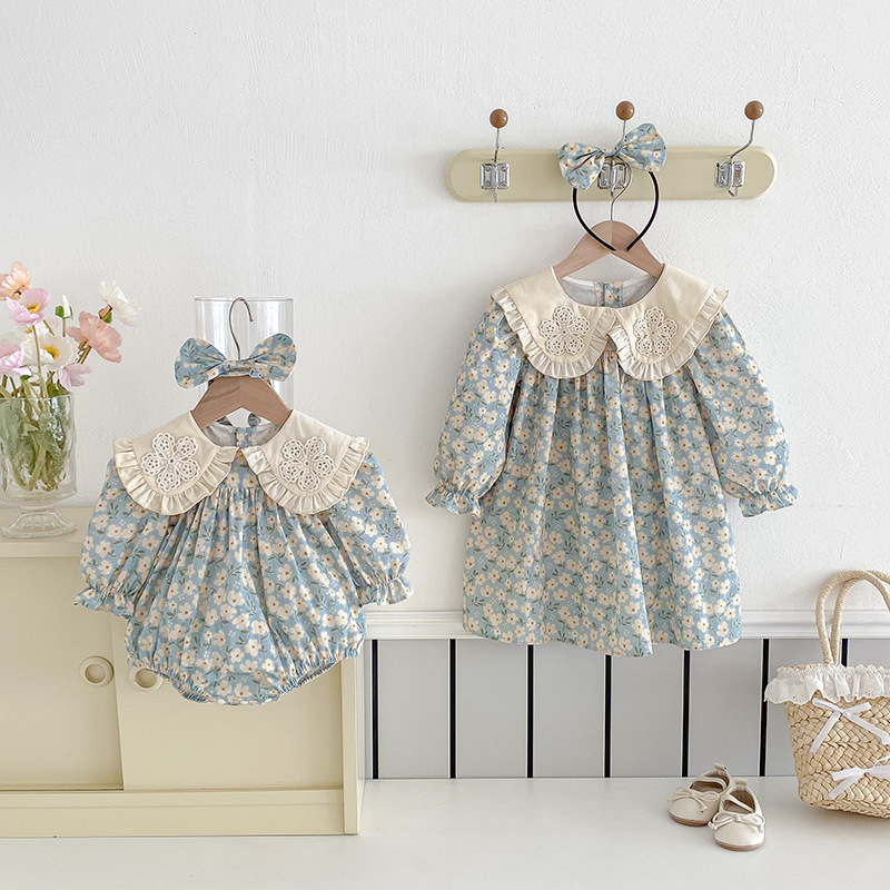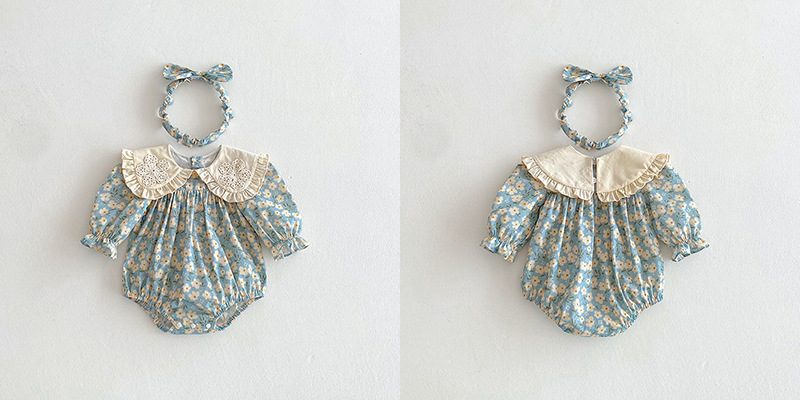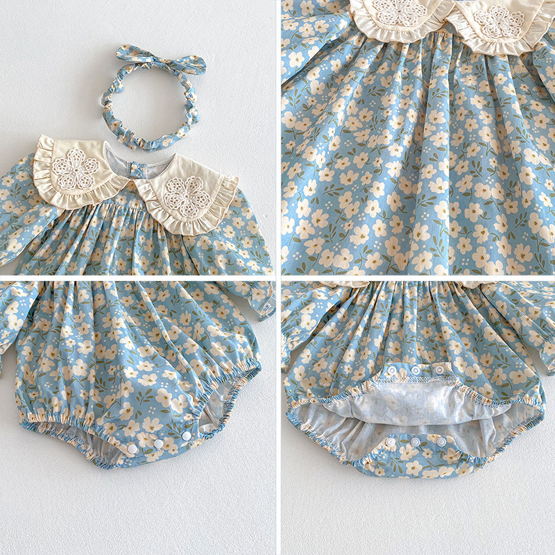 【BS283】韓版翻領蕾絲小花長袖包屁衣小洋裝(送髮箍)(1色)