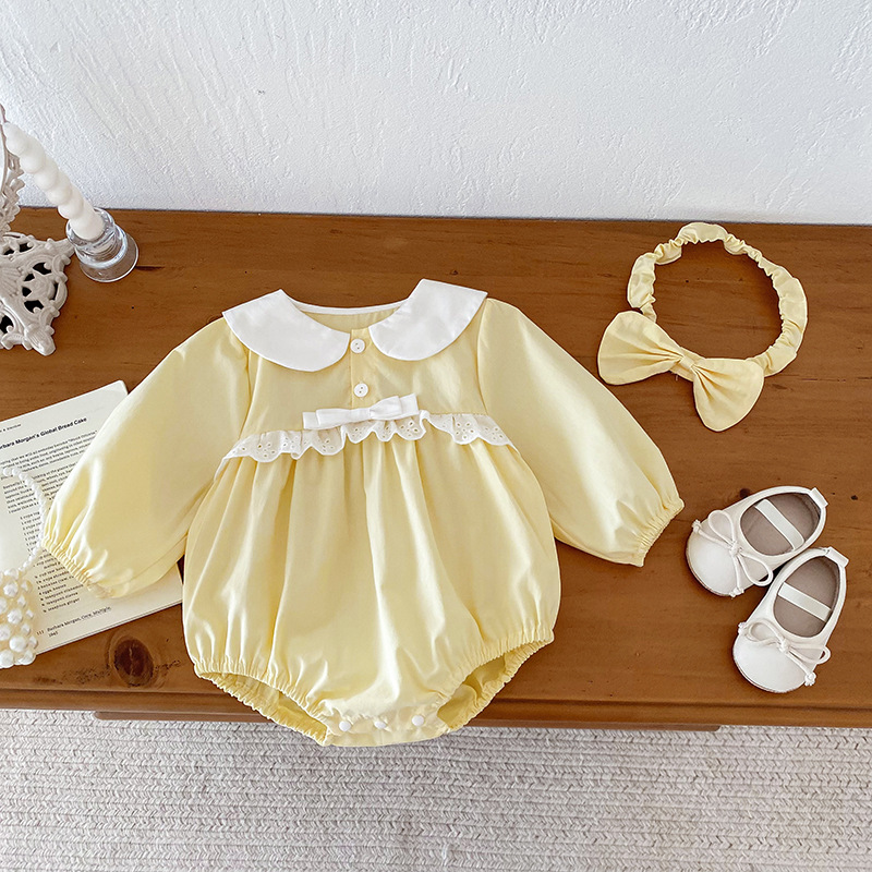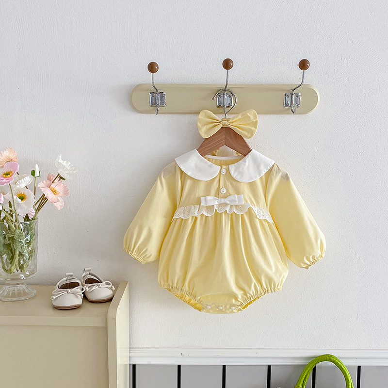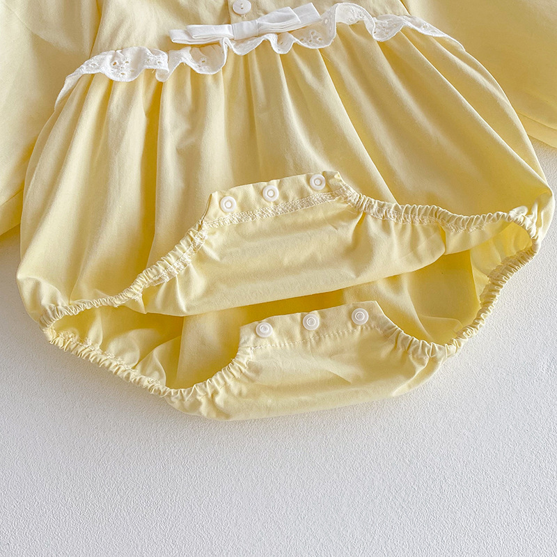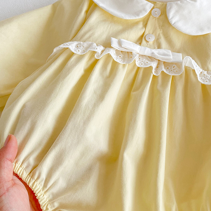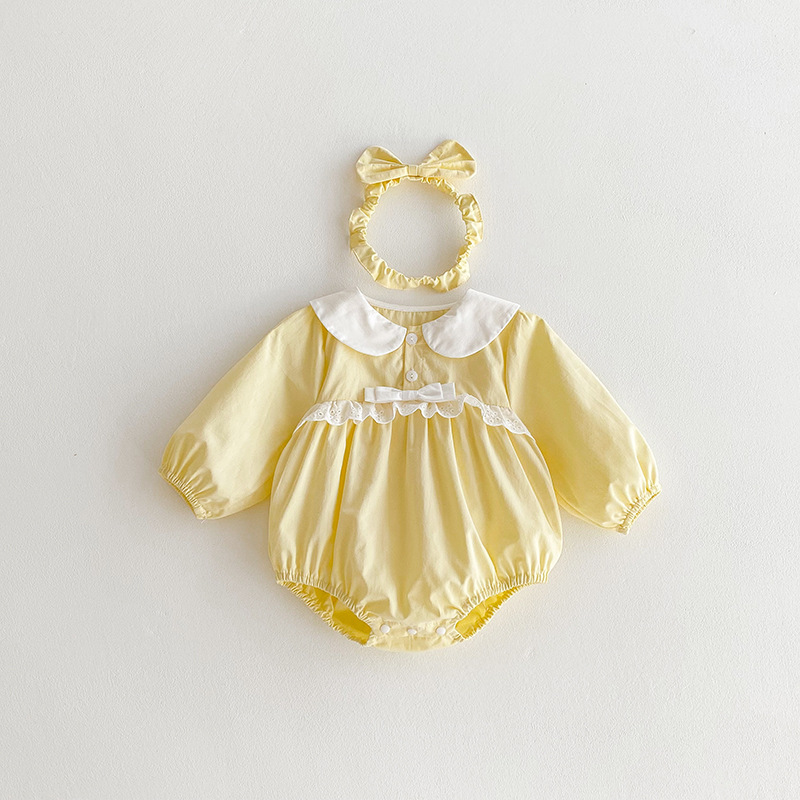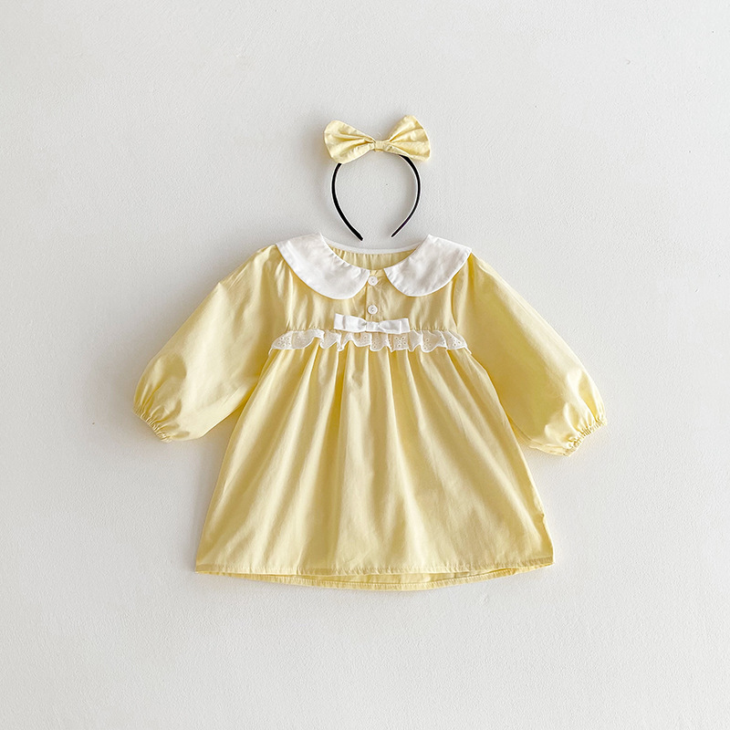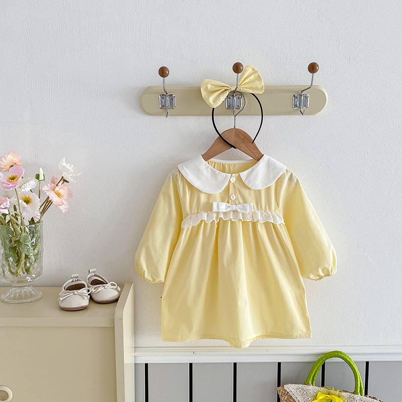 【BS292】韓版奶黃蝴蝶結花邊長袖包屁衣小洋裝(送髮箍)(1色)