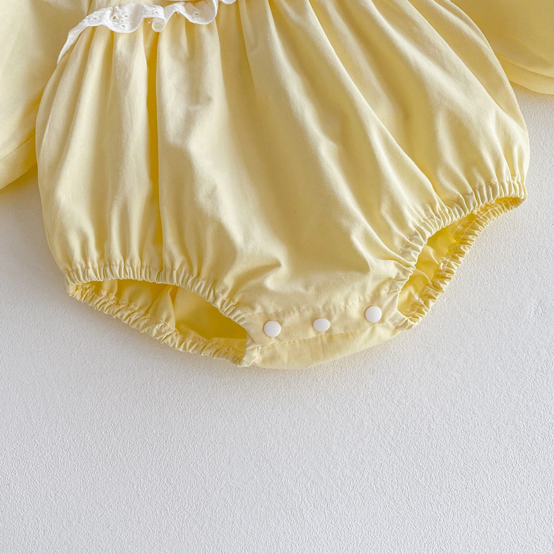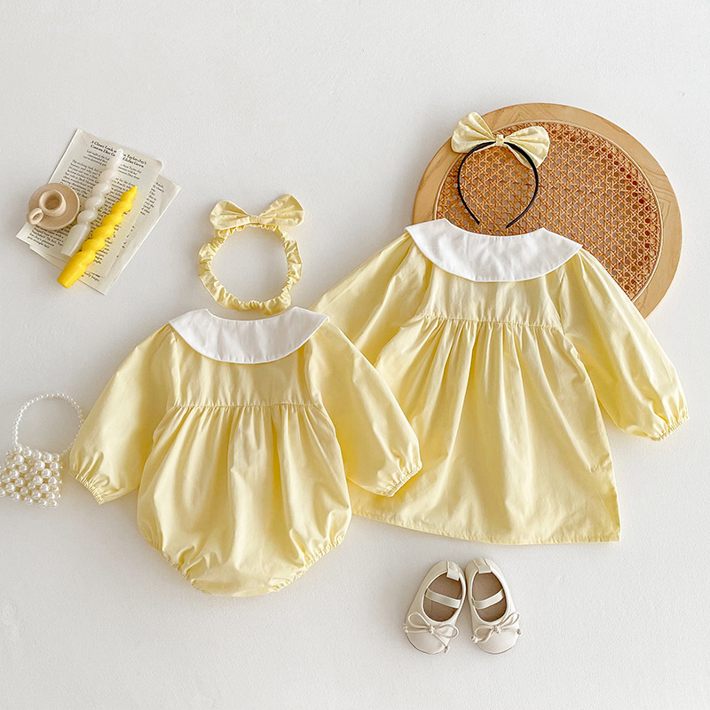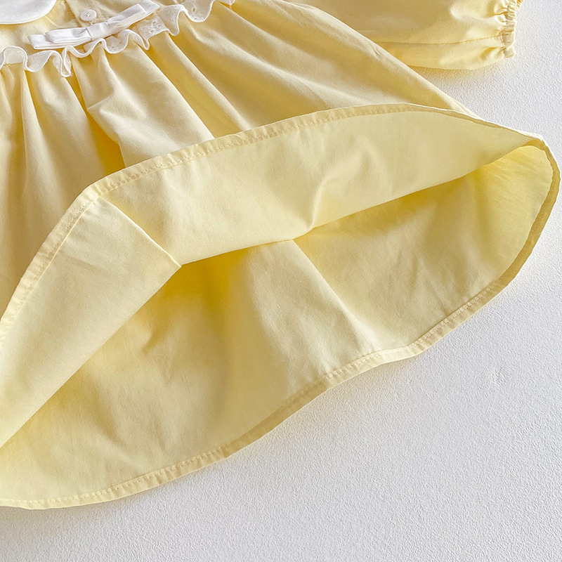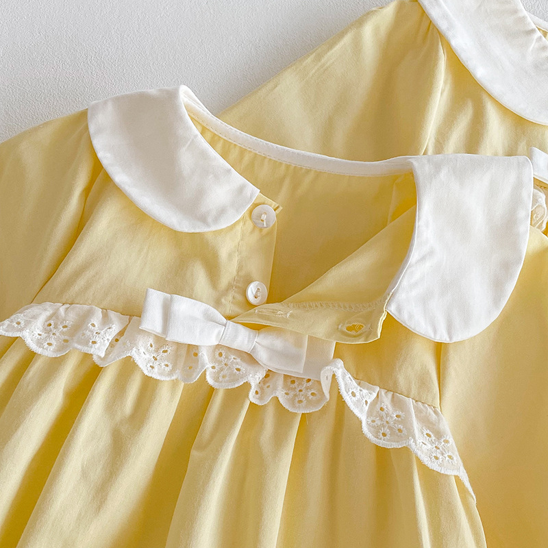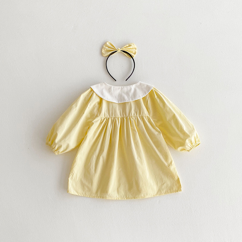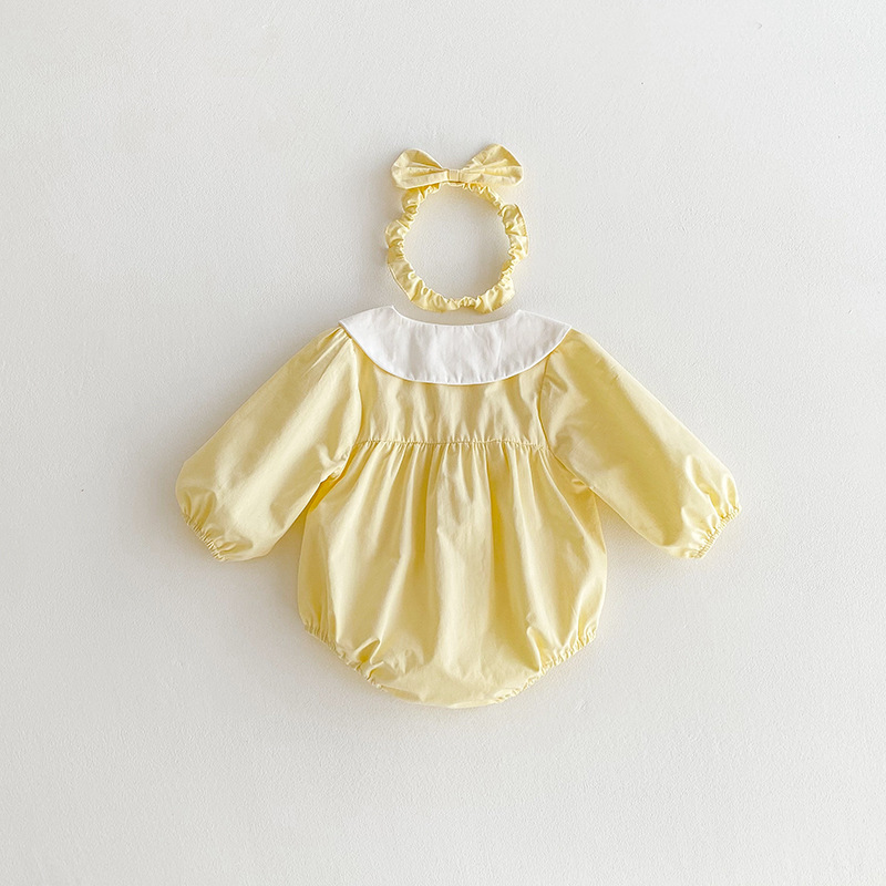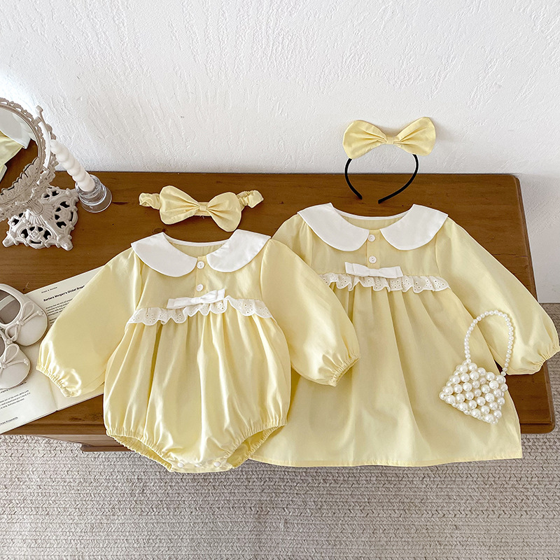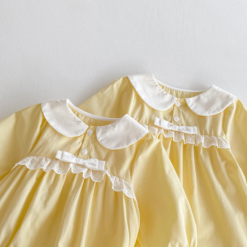 【BS292】韓版奶黃蝴蝶結花邊長袖包屁衣小洋裝(送髮箍)(1色)
