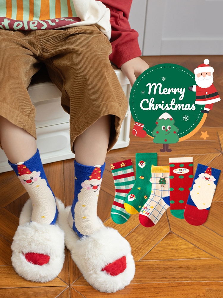 【SB093】童襪|韓版點點格紋聖誕樹中筒襪(5雙1組)