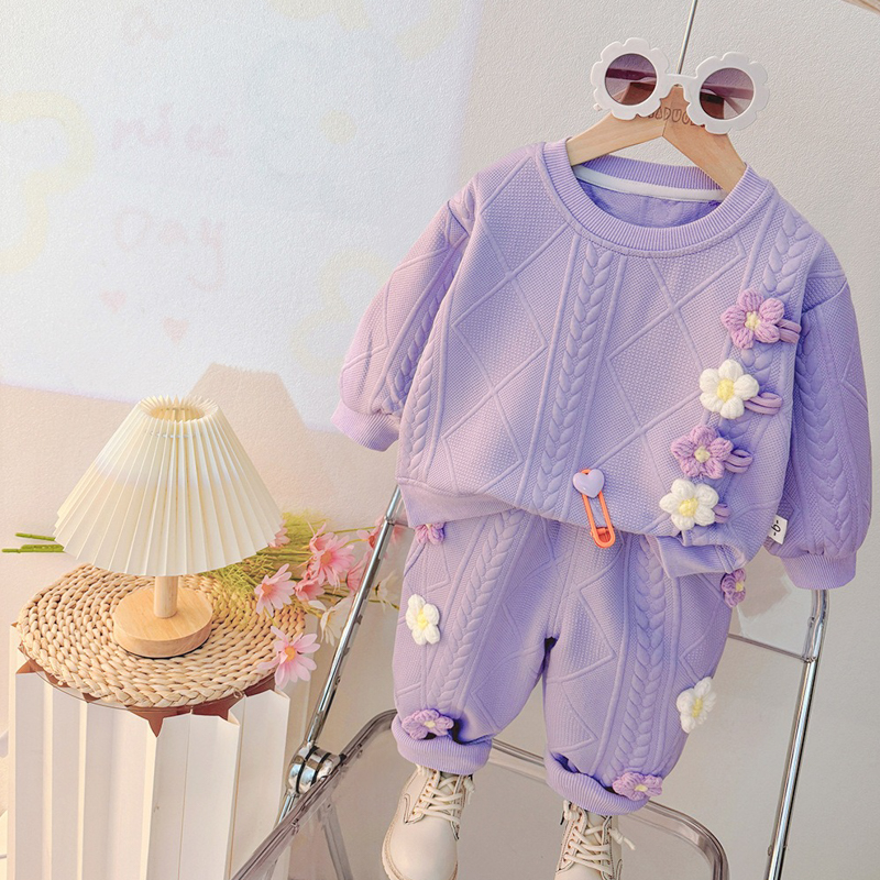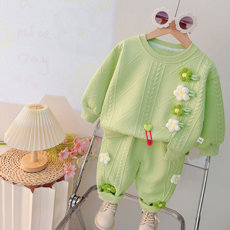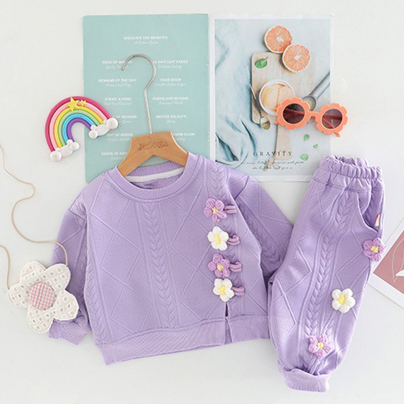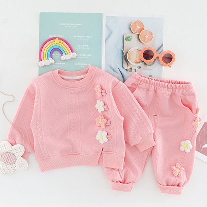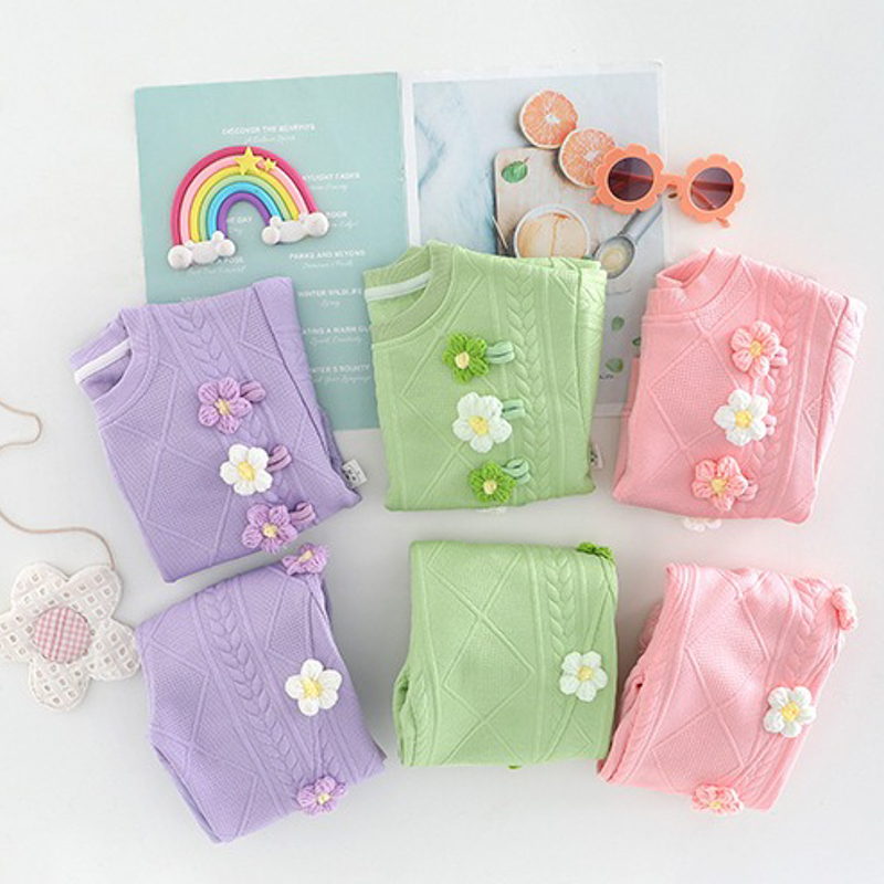 【BE195】立體三朵小花長袖長褲套裝 (3色)