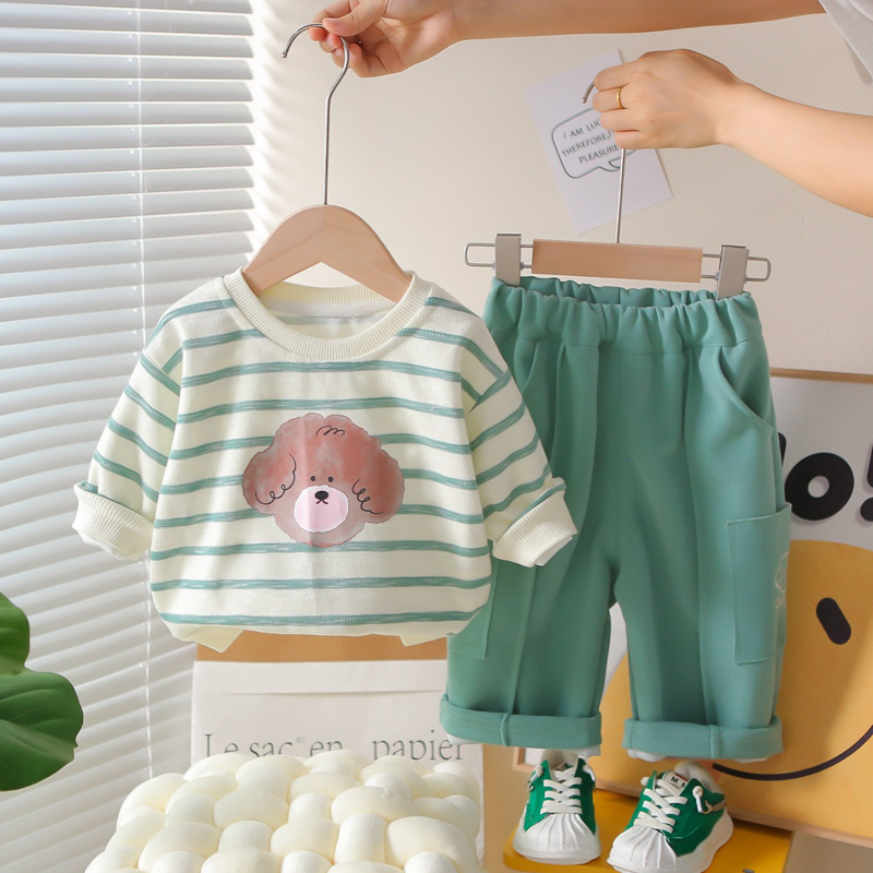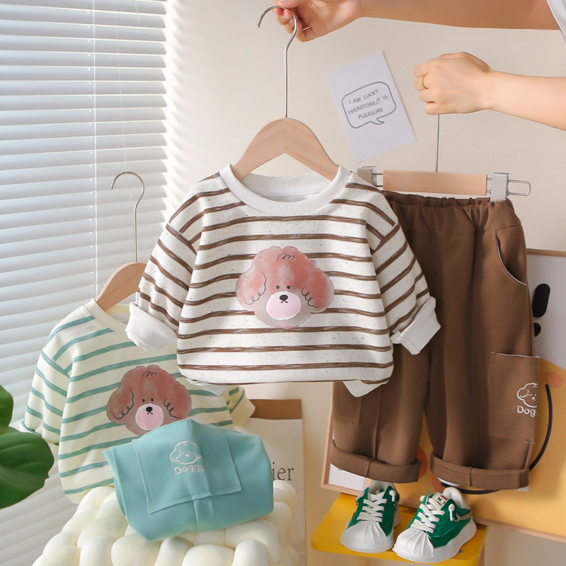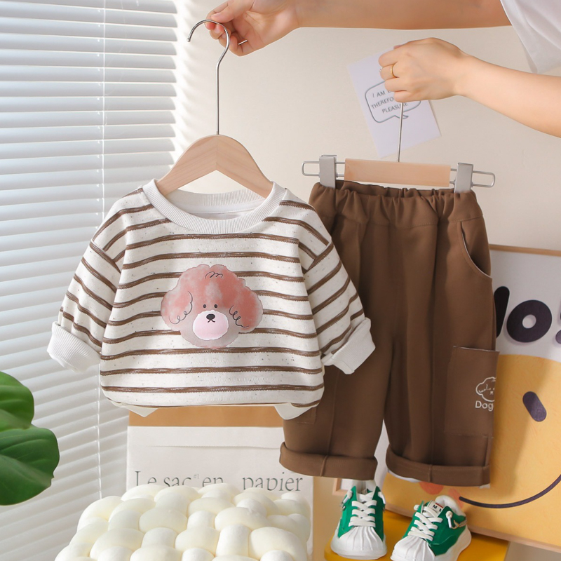 【BE229】手繪狗狗條紋長袖長褲套裝 (2色)