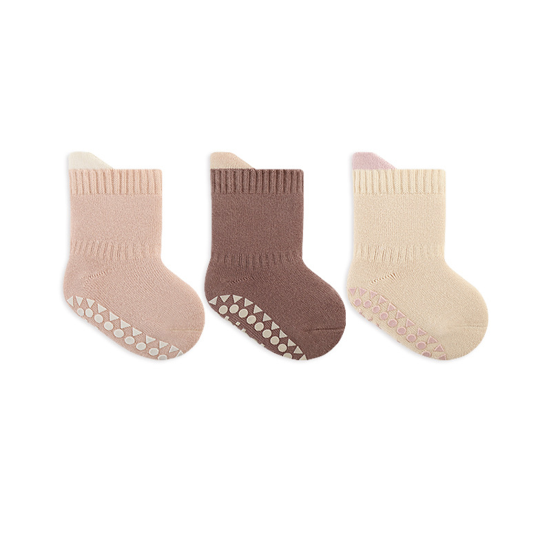 【SB218】童襪|日系HI BABAY粉咖純色加厚防滑中筒襪(3雙1組)