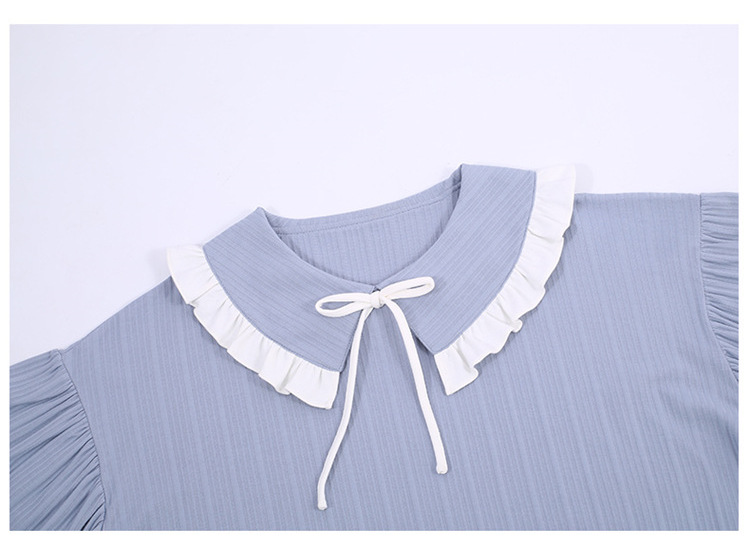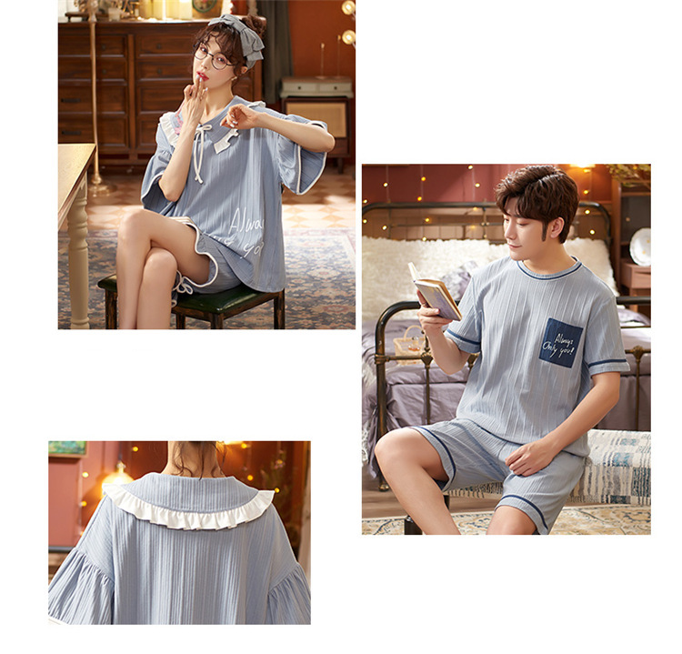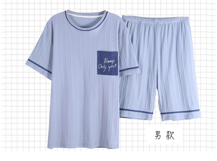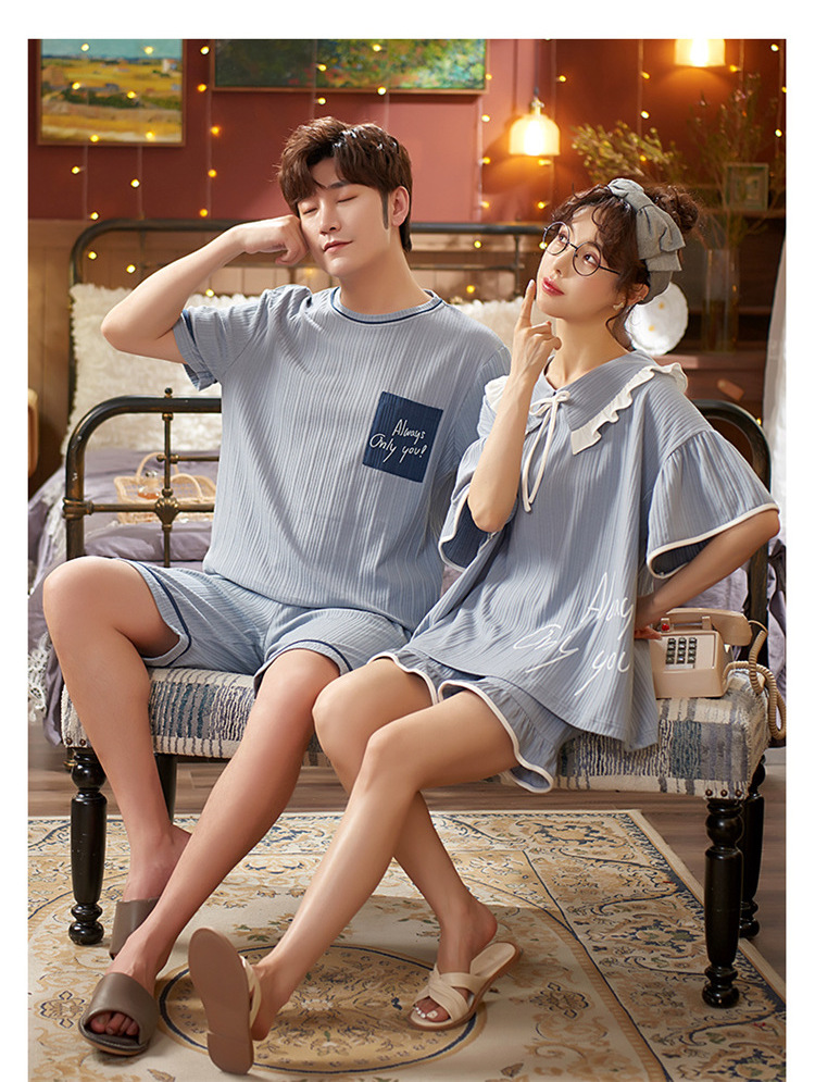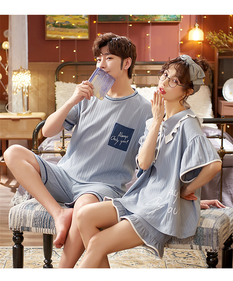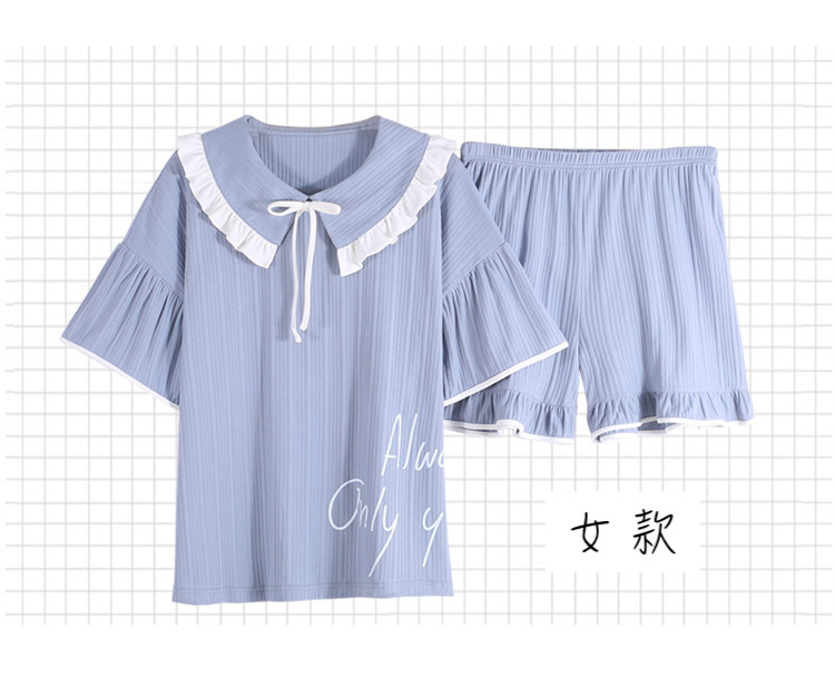 【H037】日系水藍字母寬鬆成套睡衣褲(情侶款)(短袖/短褲)