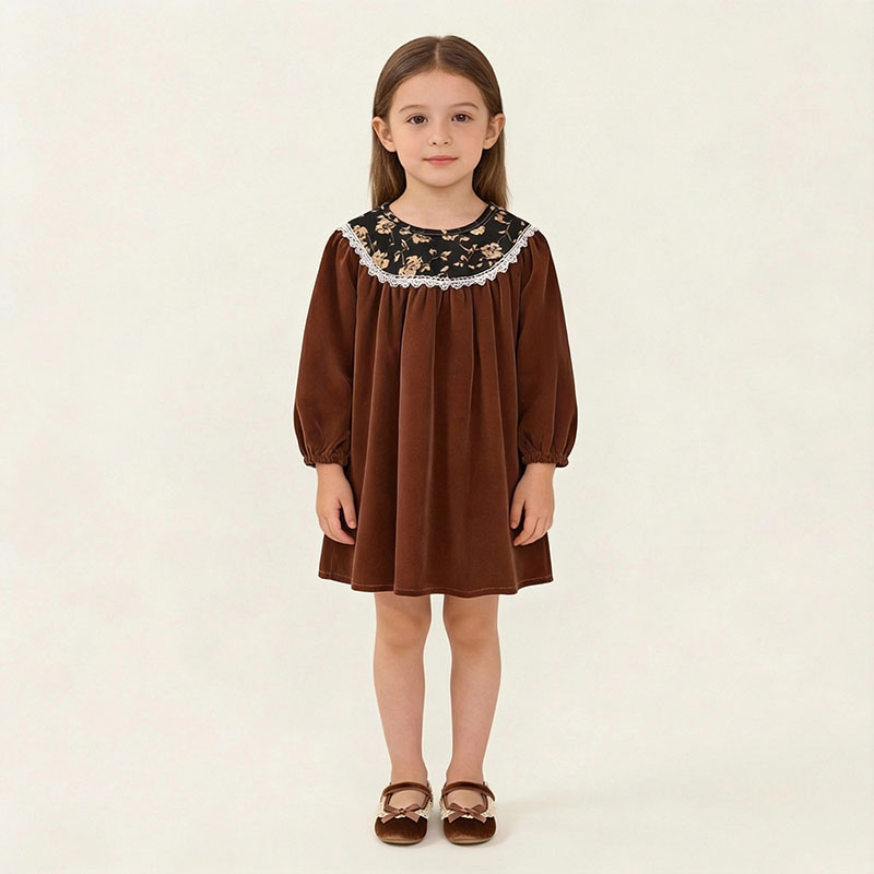 【BG935】法式復古蕾絲花邊抓絨長袖洋裝(2色)