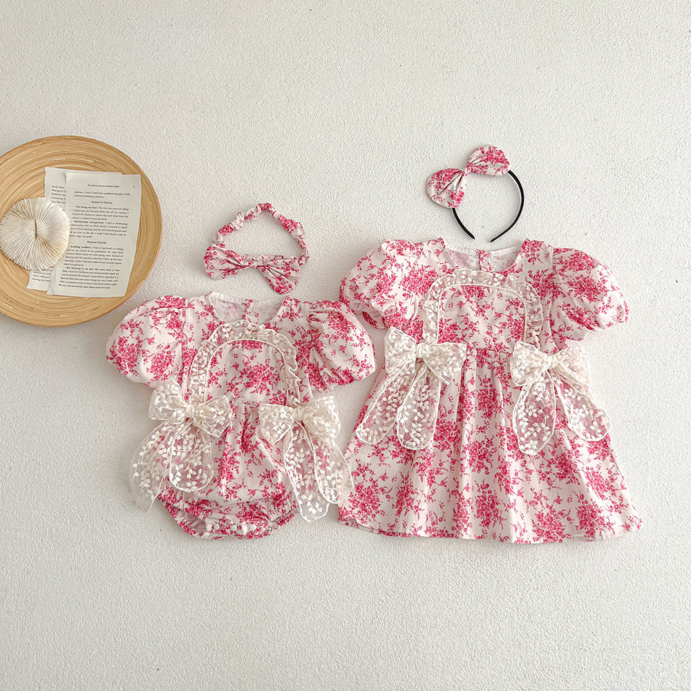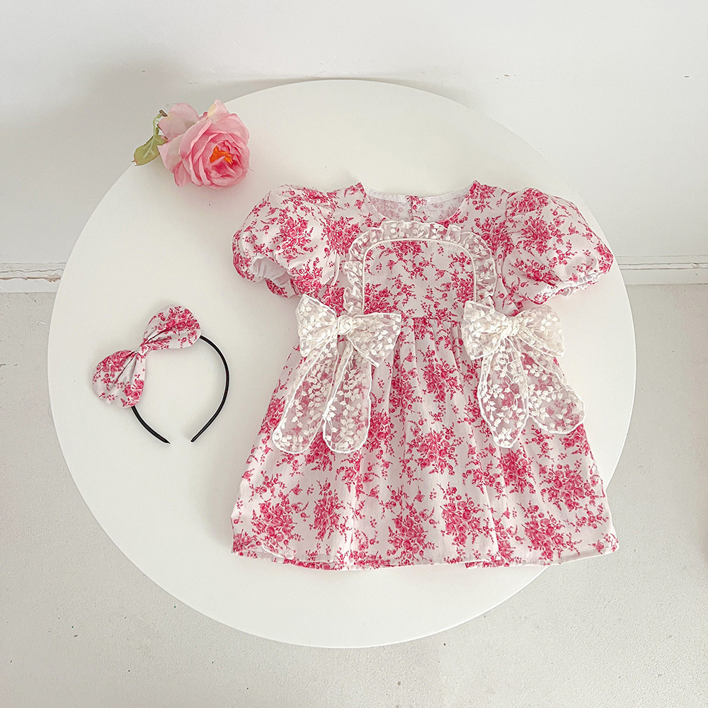 【BSG062】韓版蕾絲雙蝴蝶結碎花短袖洋裝(送髮箍)(1色)