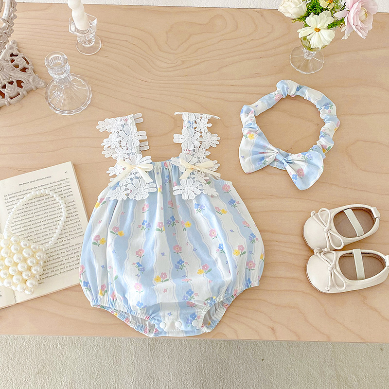 【BA1005】日雜粉藍直條雕花背心包屁衣(附髮帶)(1色)