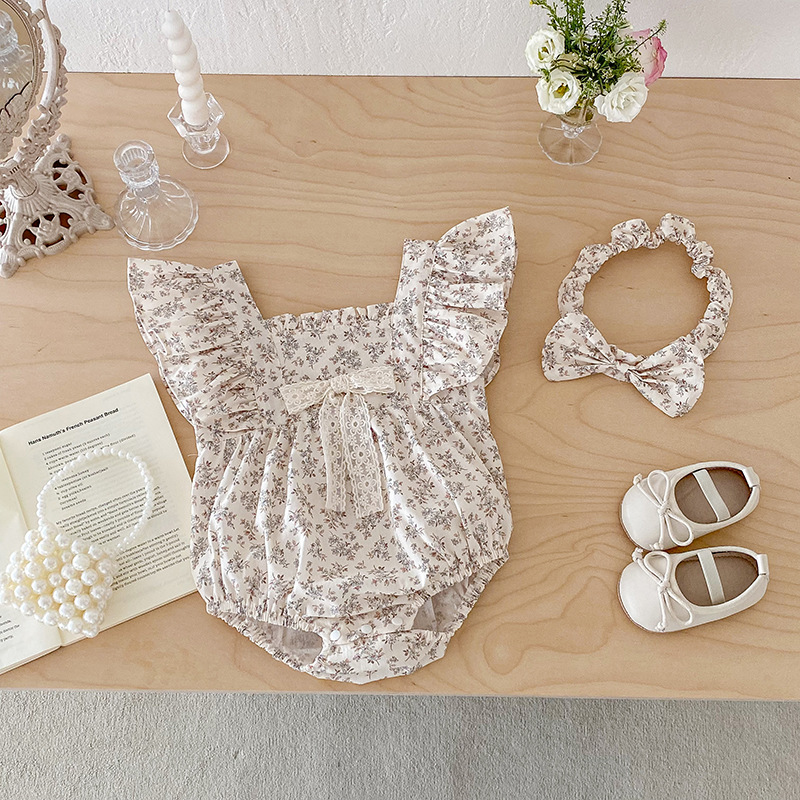 【BA1008】日雜碎花蝴蝶結小飛袖包屁衣(附髮帶)(1色)