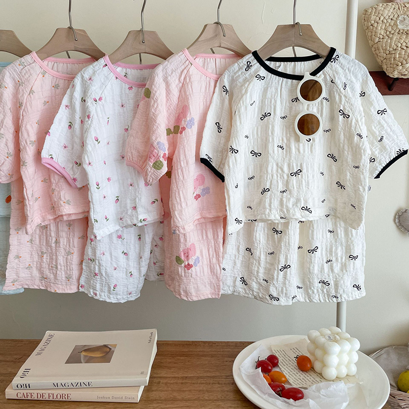 【HB048】日系夏日粉色花朵薄款成套睡衣(5分袖/5分褲)(1色)