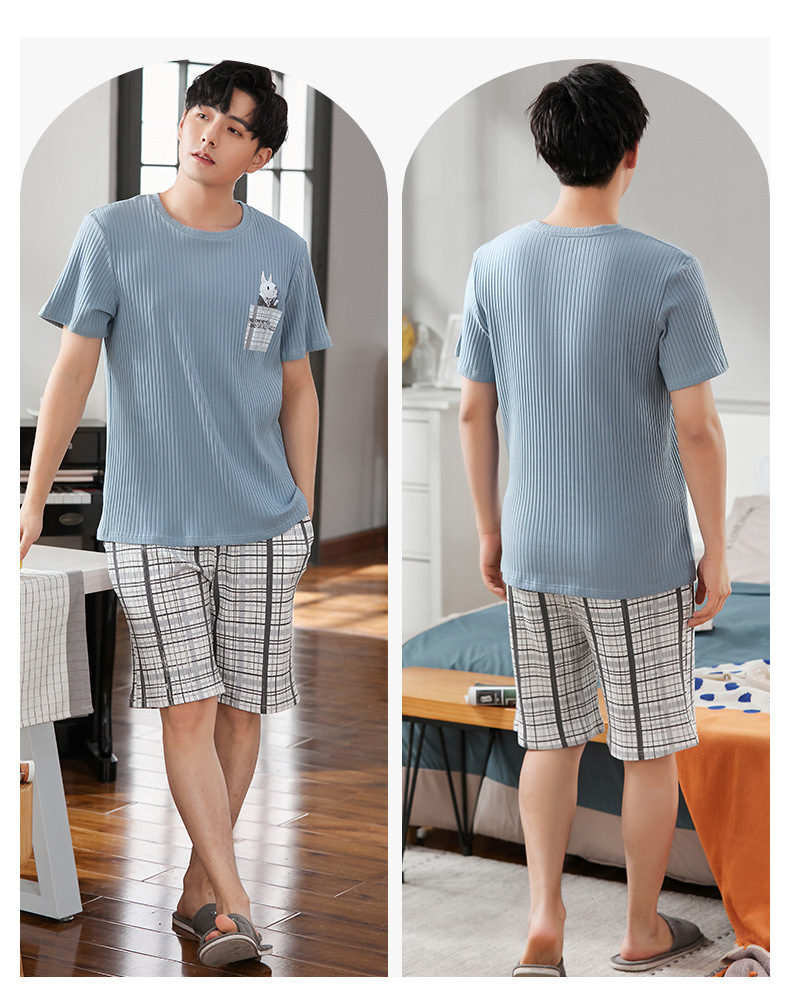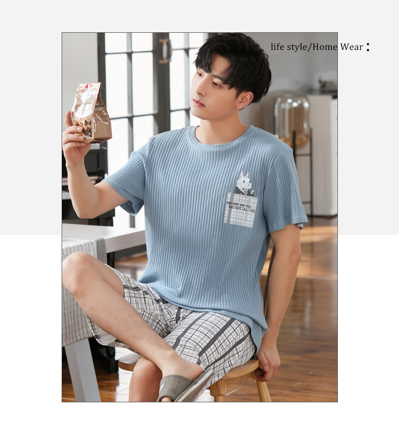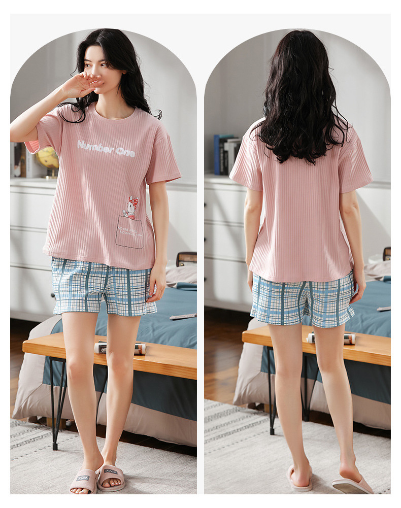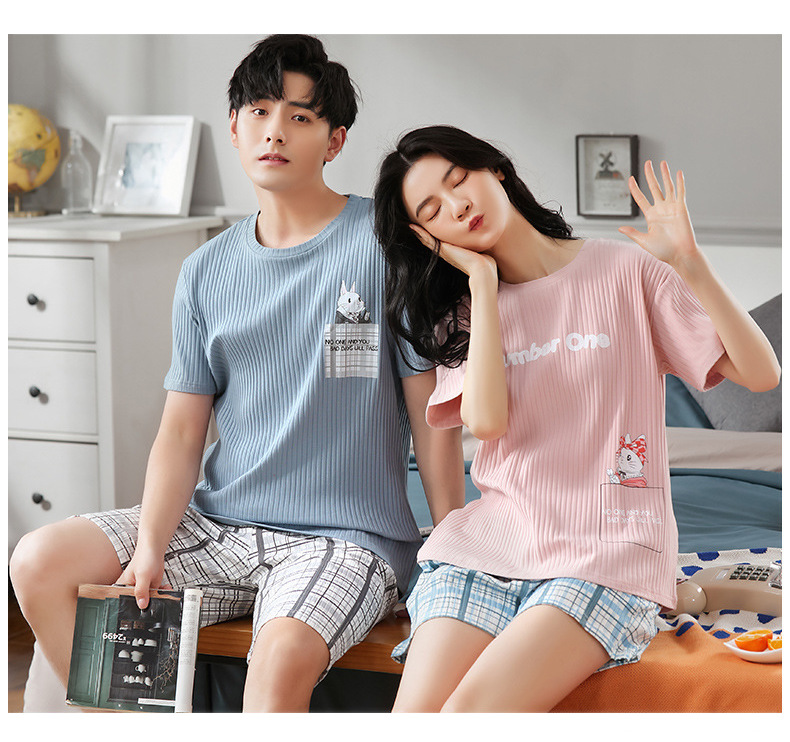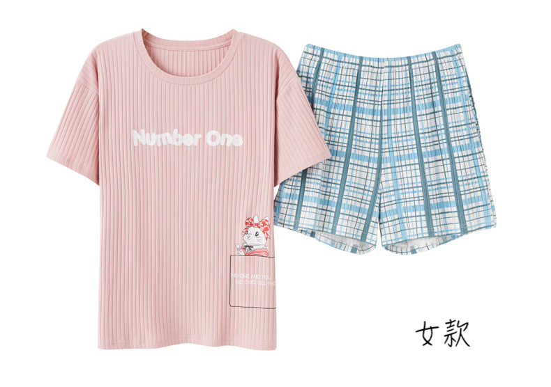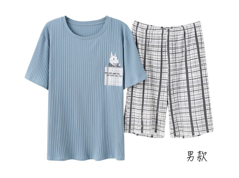 【H165】日系格子兔寬鬆成套睡衣褲(情侶款)(短袖/短褲)