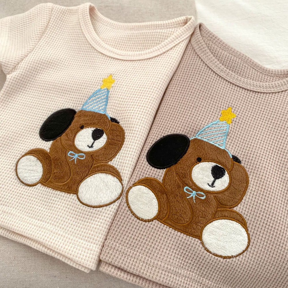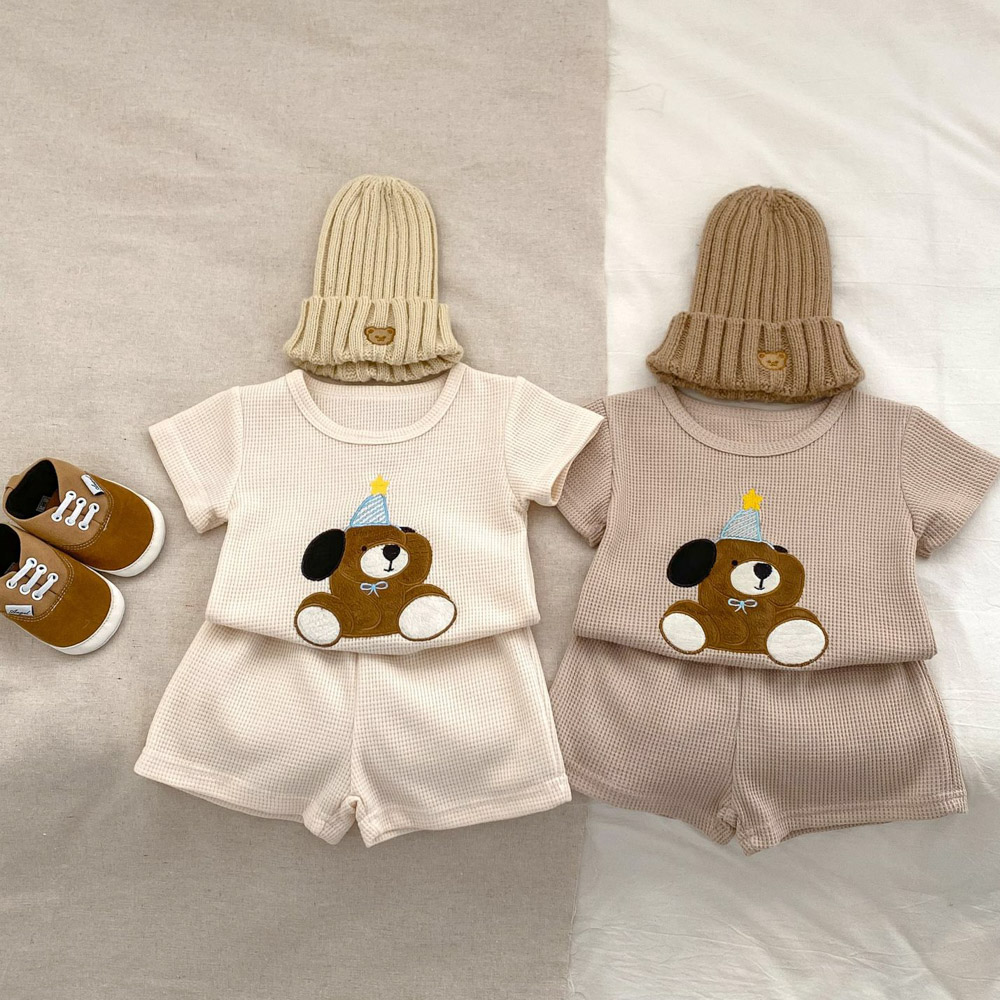 【BE021】日系刺繡生日狗華夫格紋兩件式短袖短褲套裝(2色)