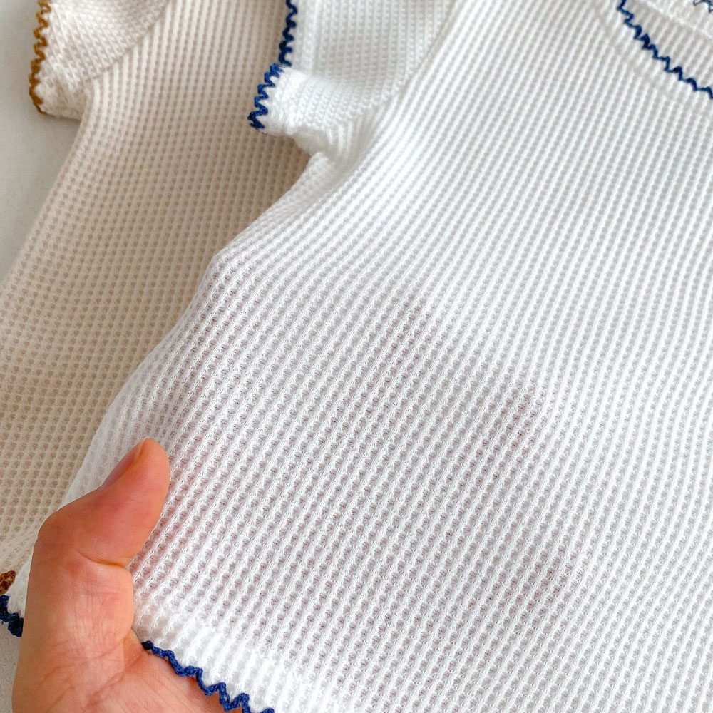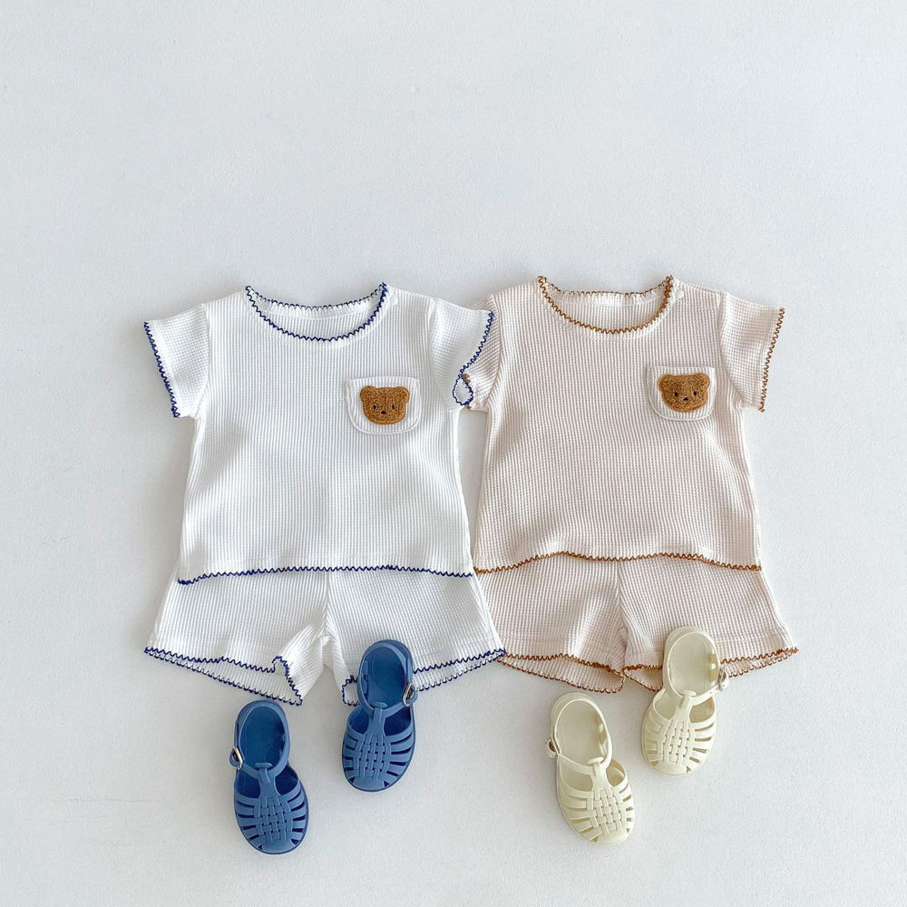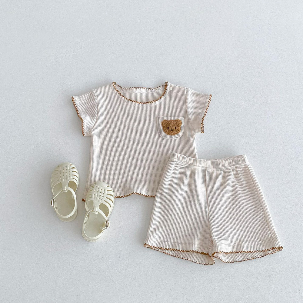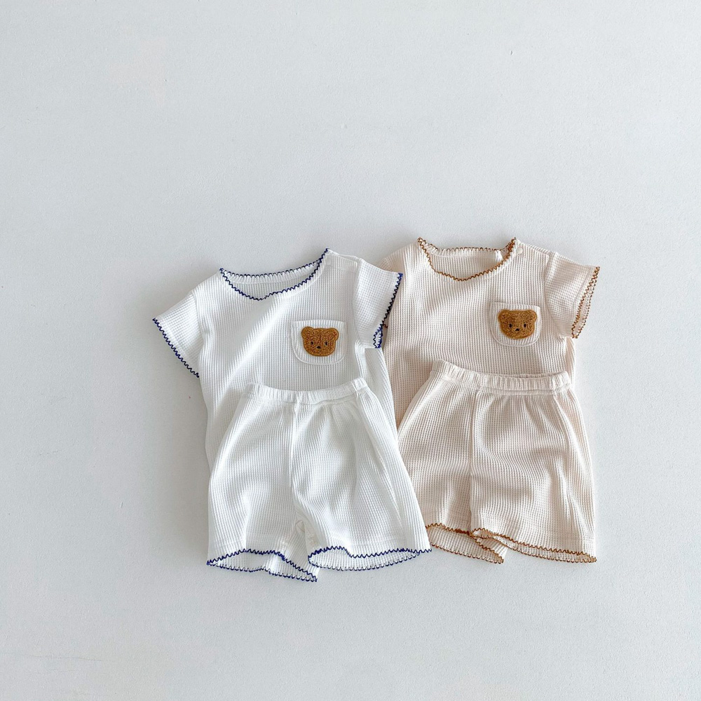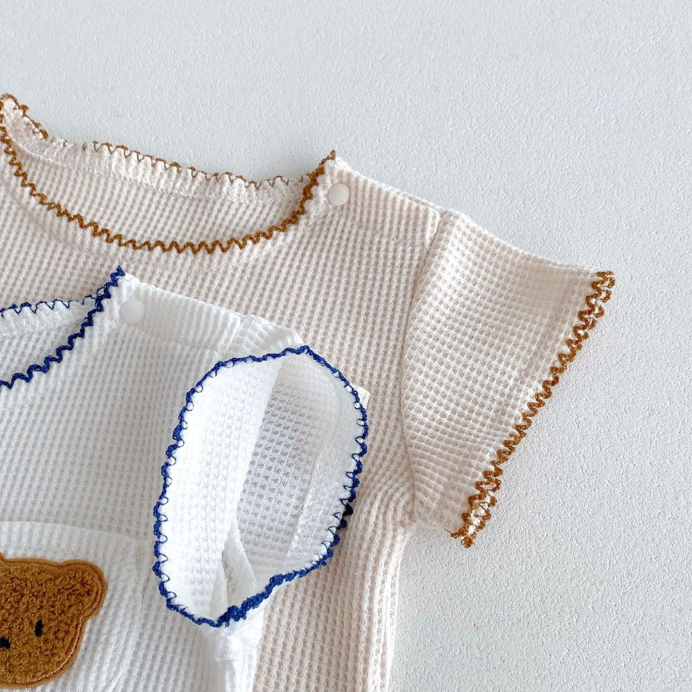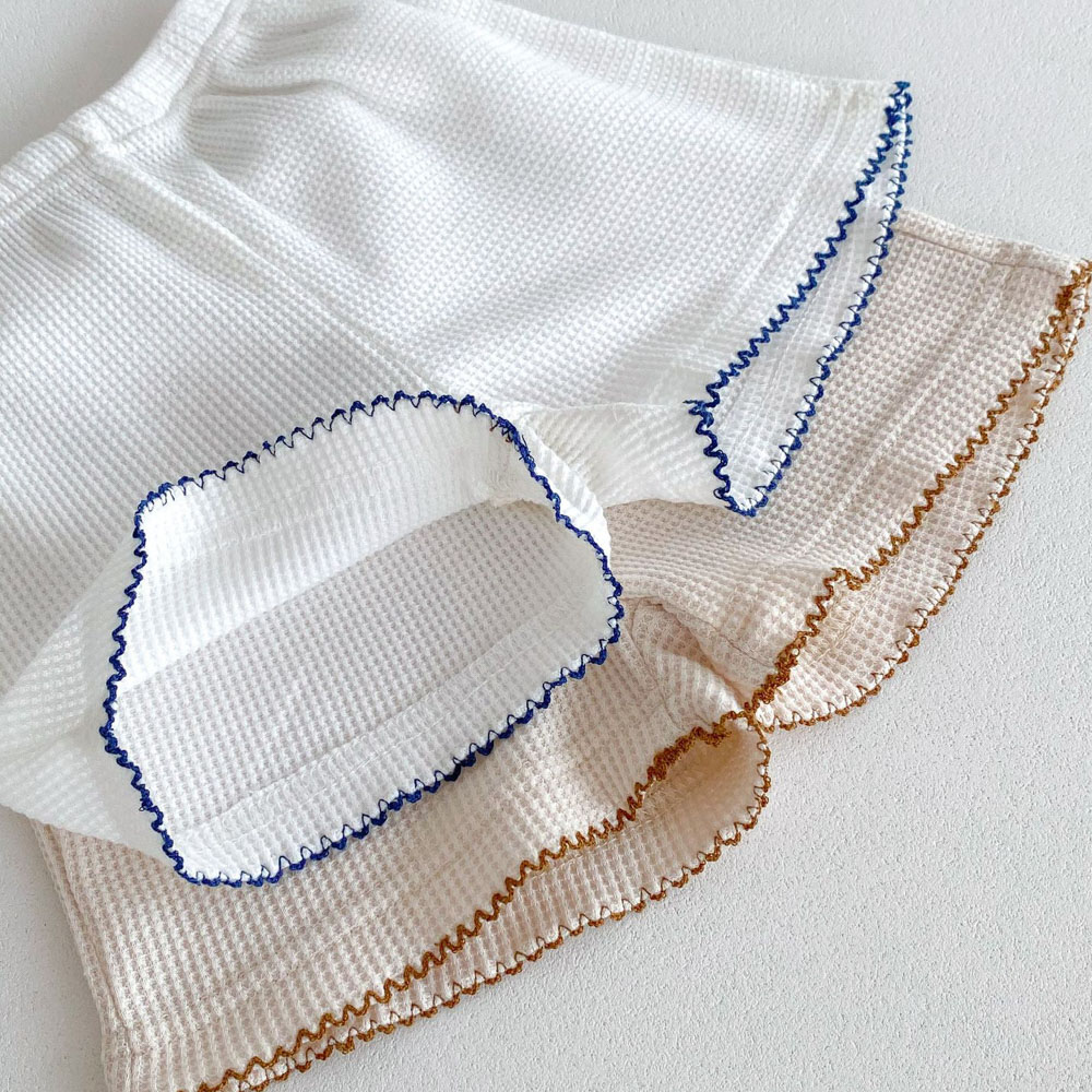 【BE012】日系撞色滾邊口袋熊華夫格紋兩件式短袖短褲套裝(2色)