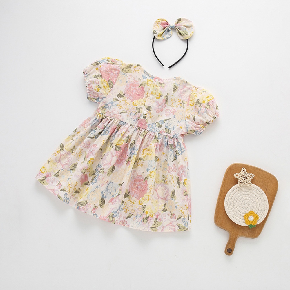【BS058】韓版水彩玫瑰花短袖包屁衣小洋裝(送髮箍)(1色)