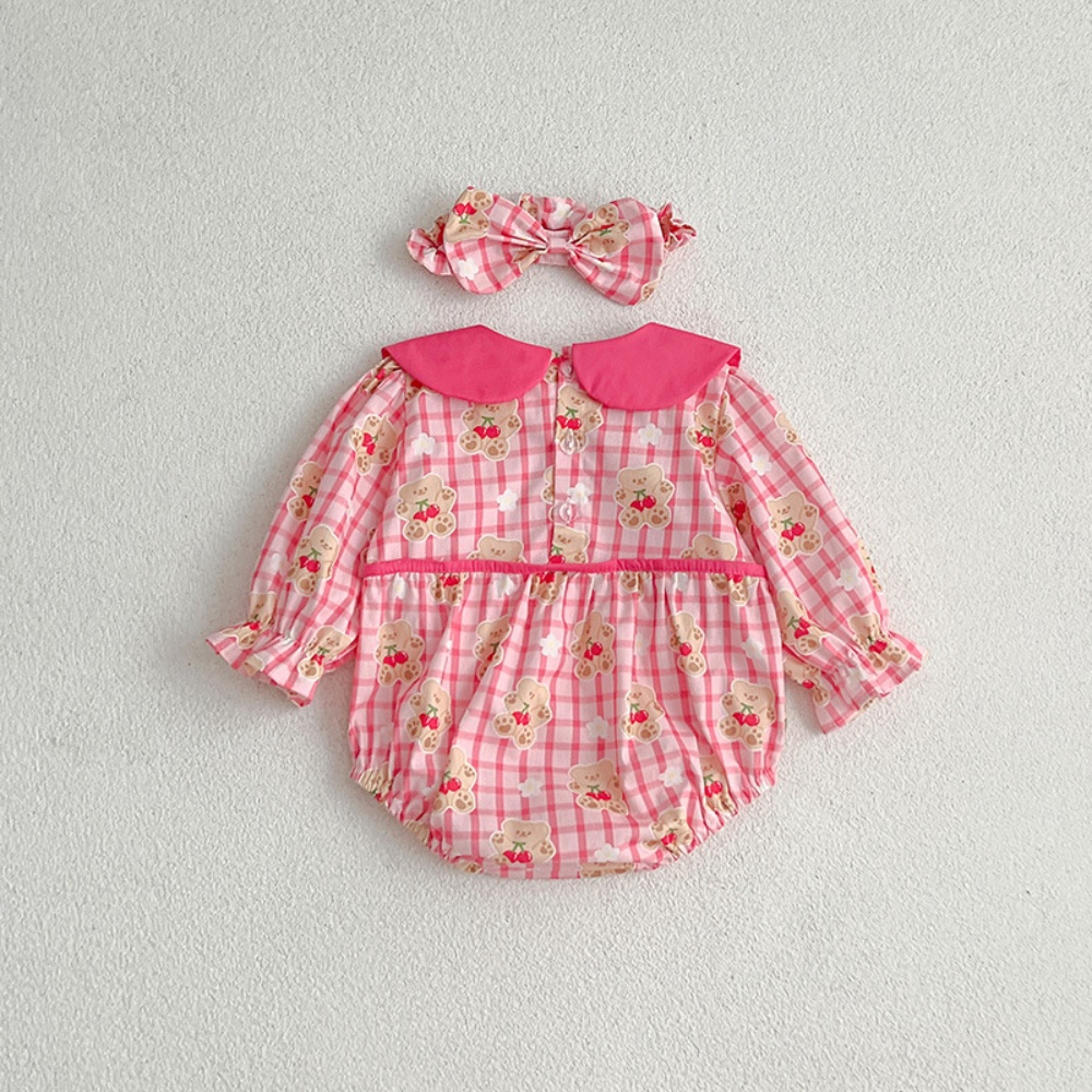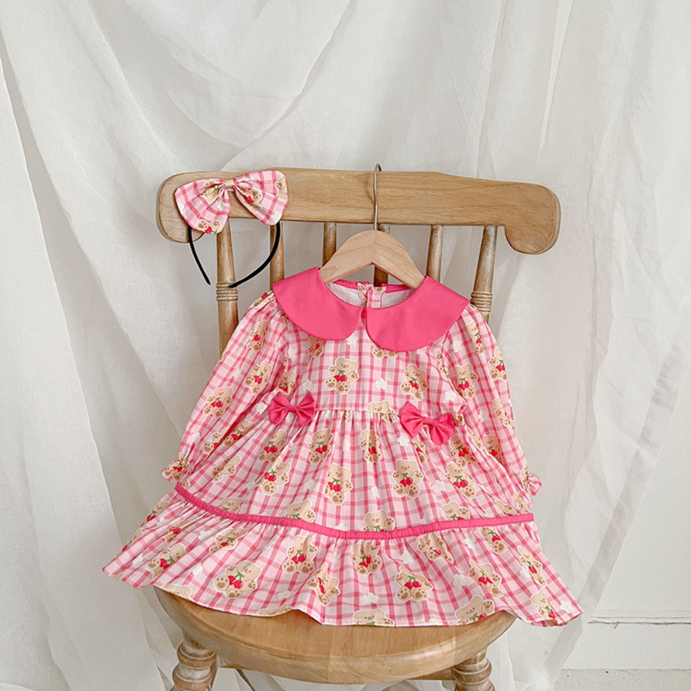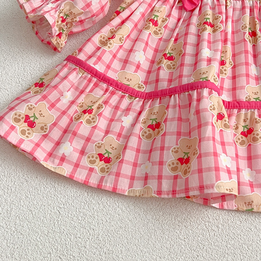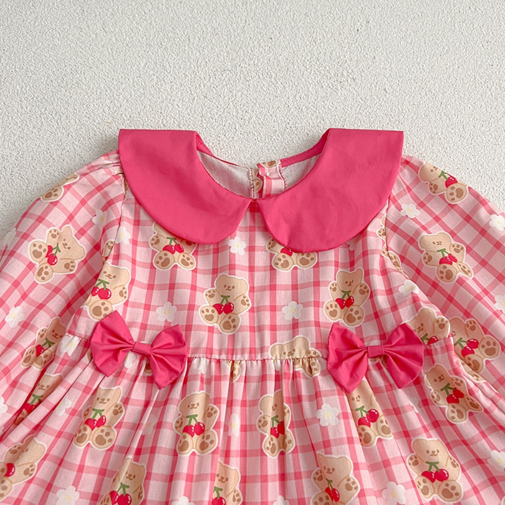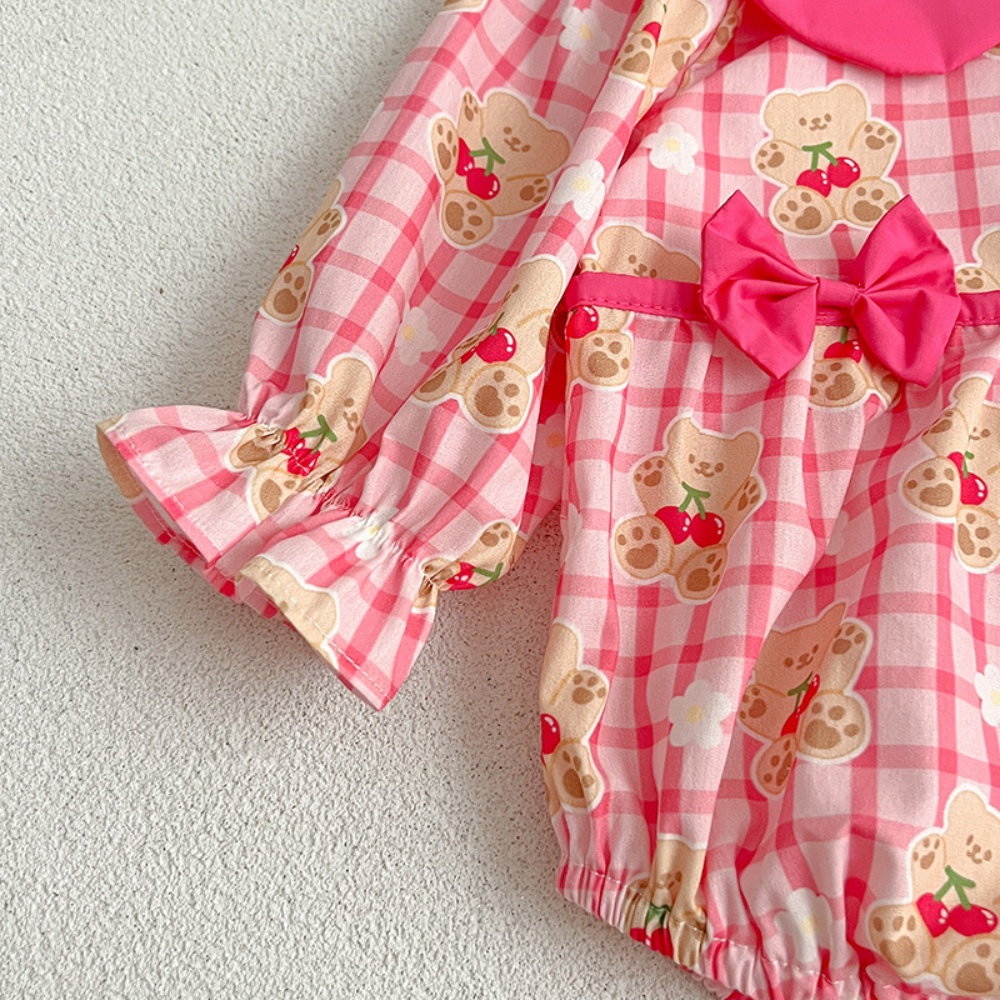 【BS079】韓版格紋櫻桃熊長袖包屁衣小洋裝(送髮箍)(1色)