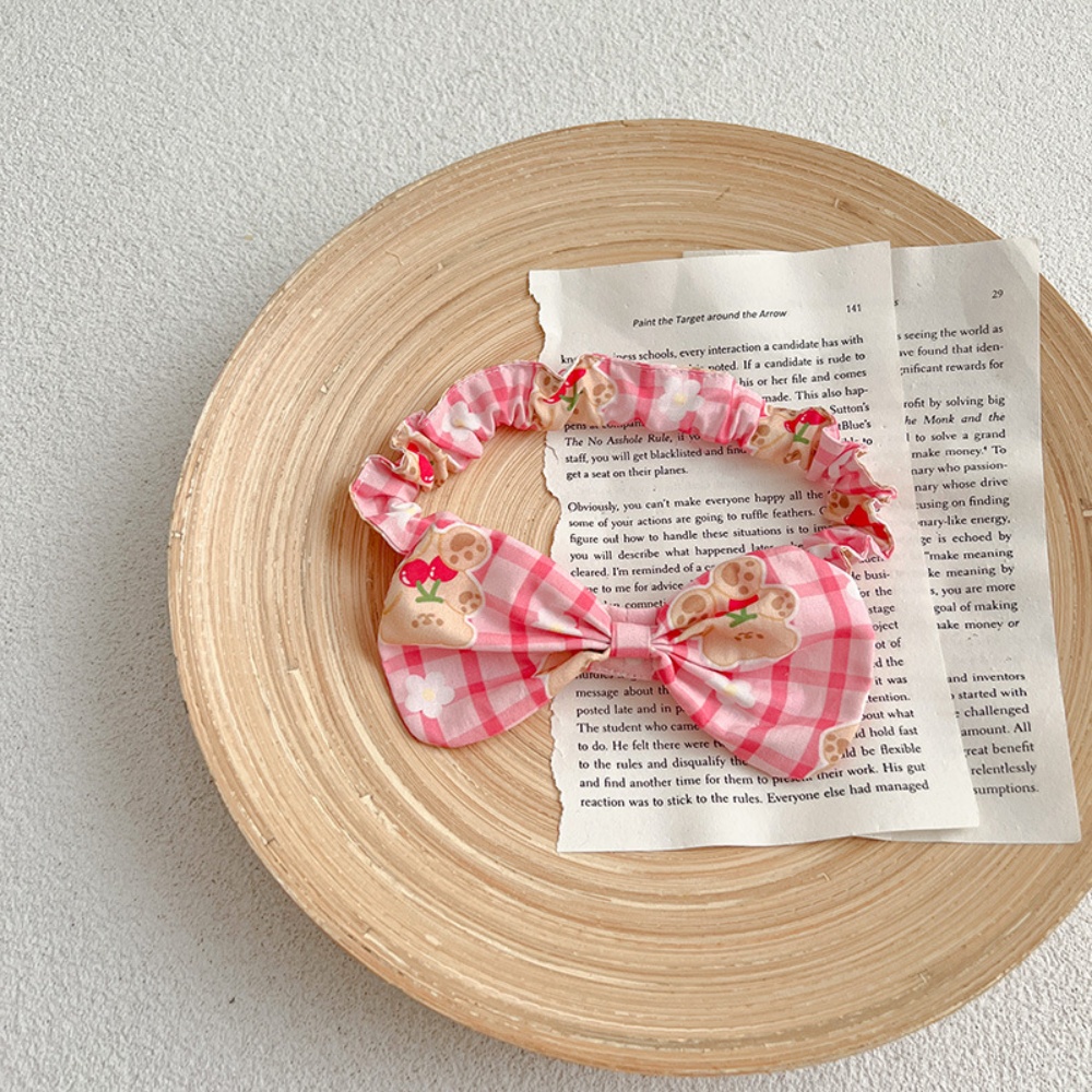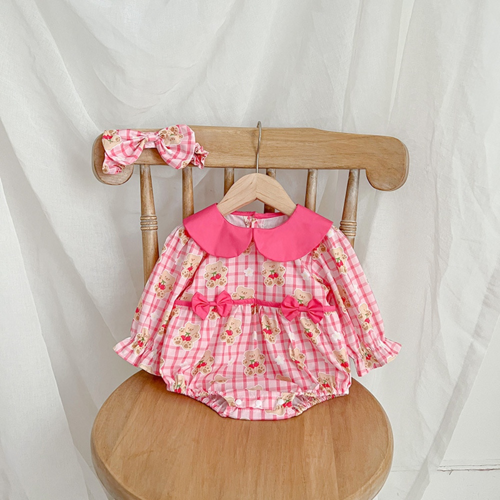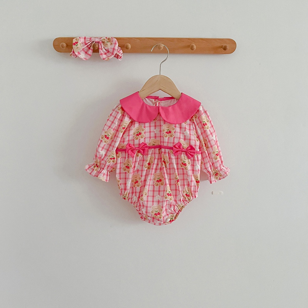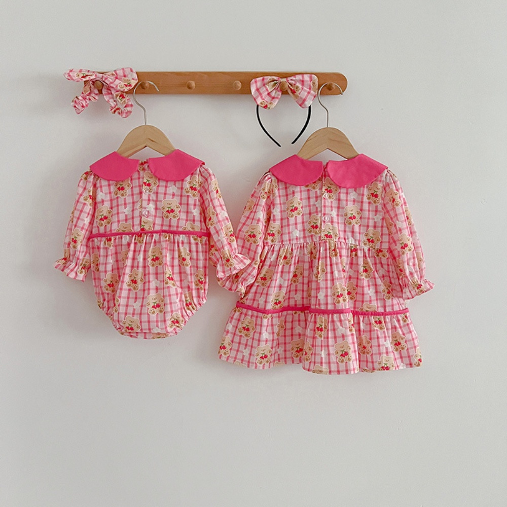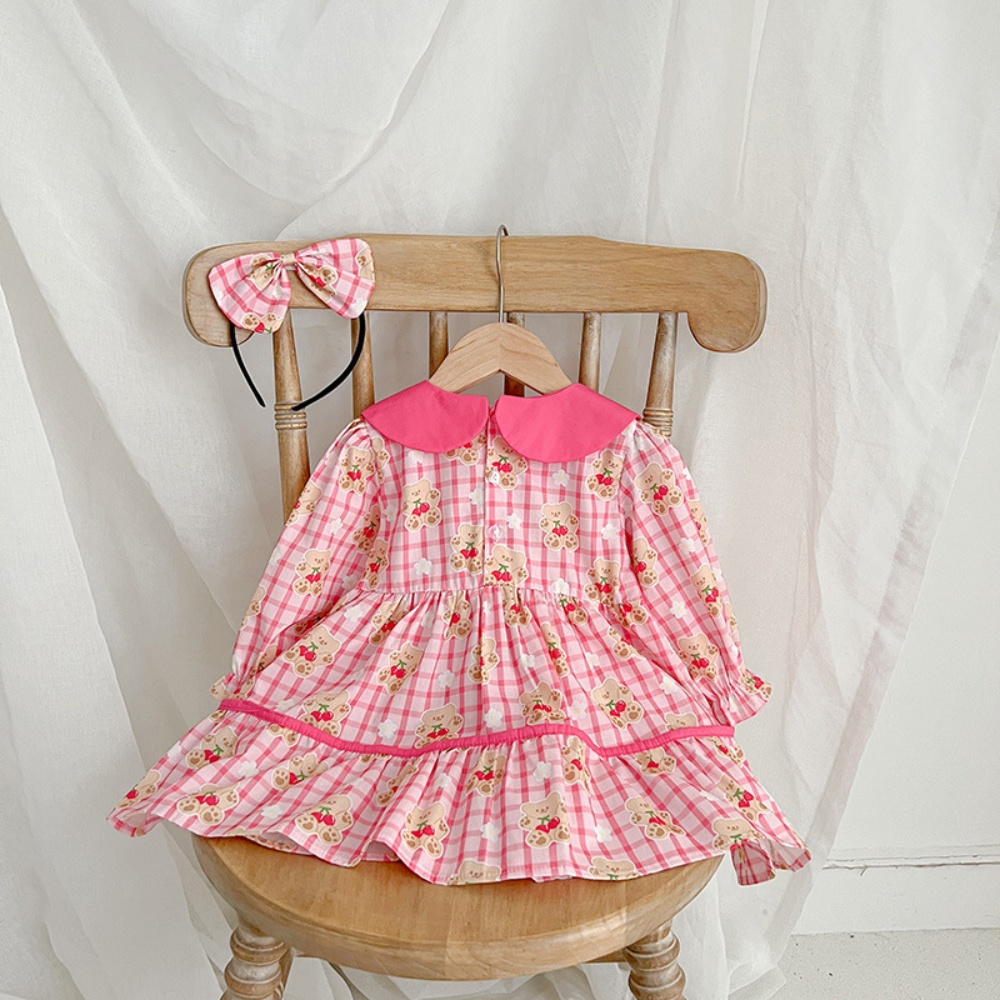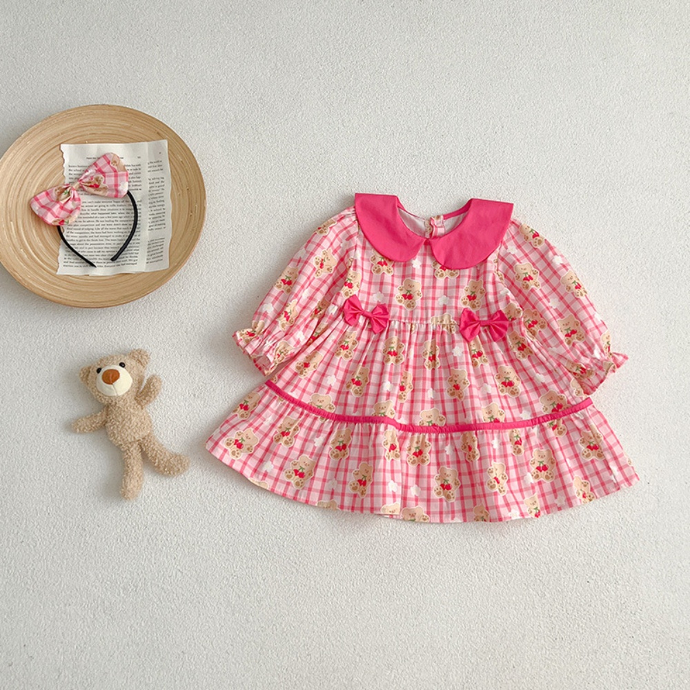 【BS079】韓版格紋櫻桃熊長袖包屁衣小洋裝(送髮箍)(1色)