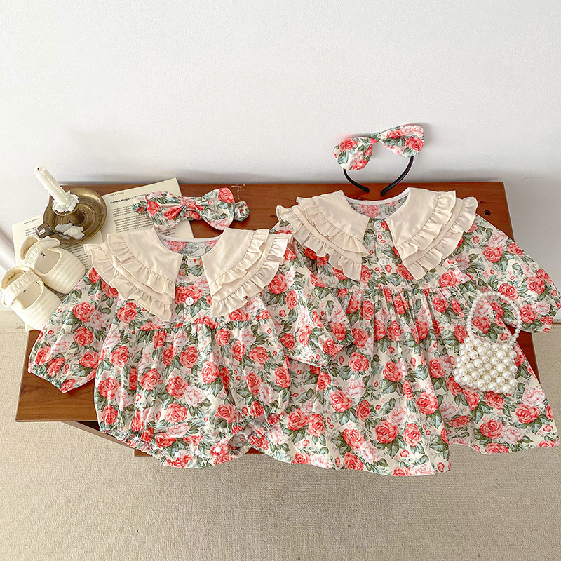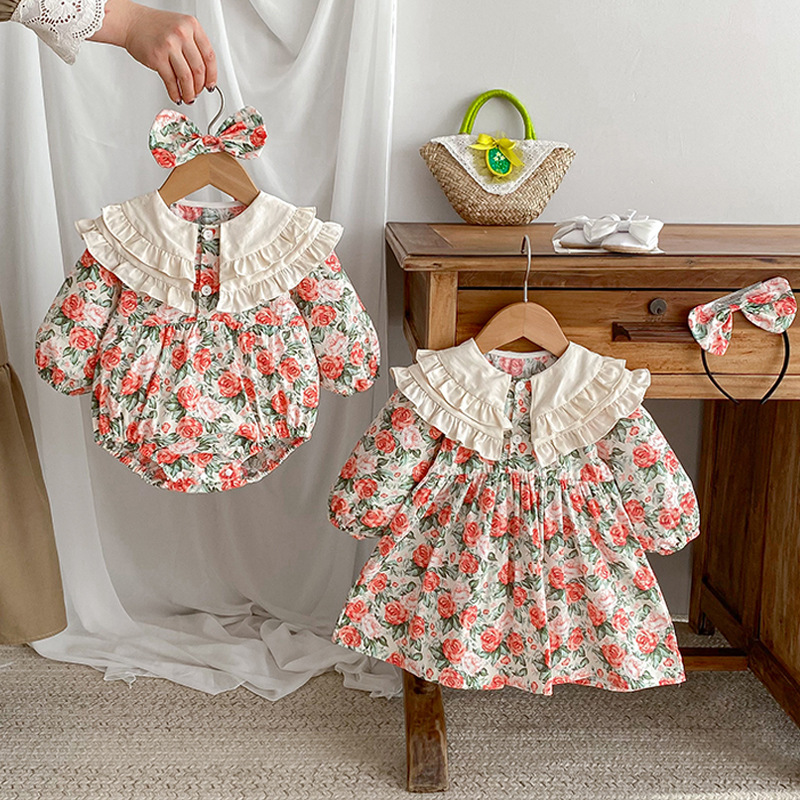 【BS225】韓版尖領玫瑰花長袖包屁衣小洋裝(送髮箍)(1色)