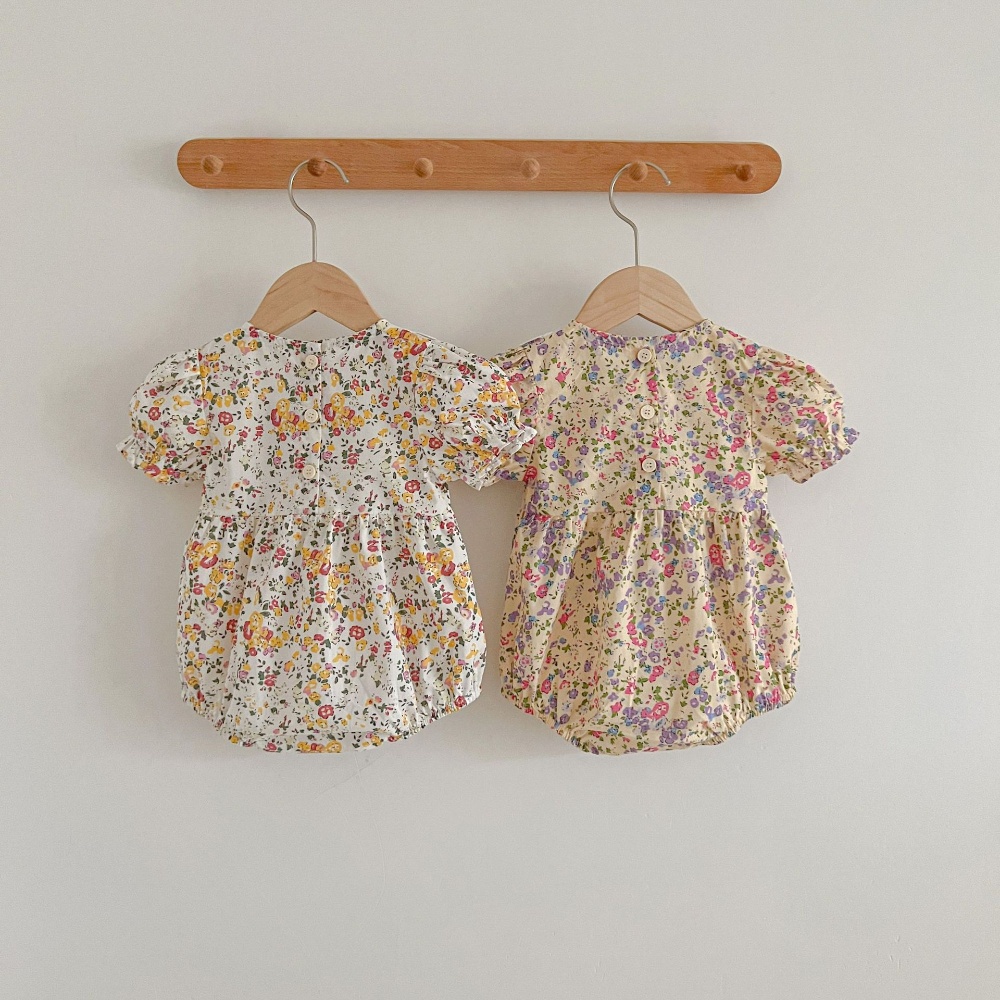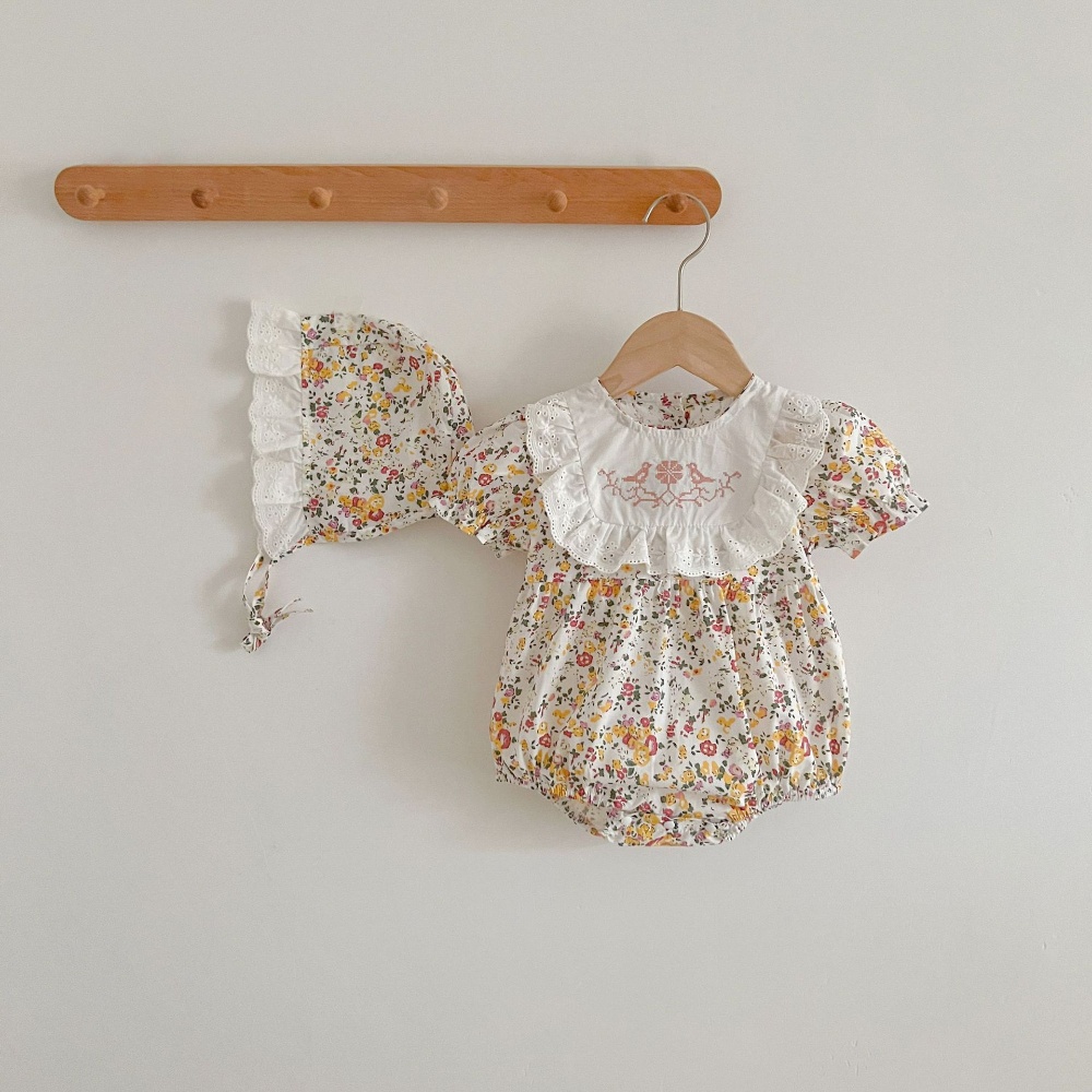 【BA442】韓版圓領刺繡小鳥碎花短袖包屁衣(送遮陽帽)(2色)