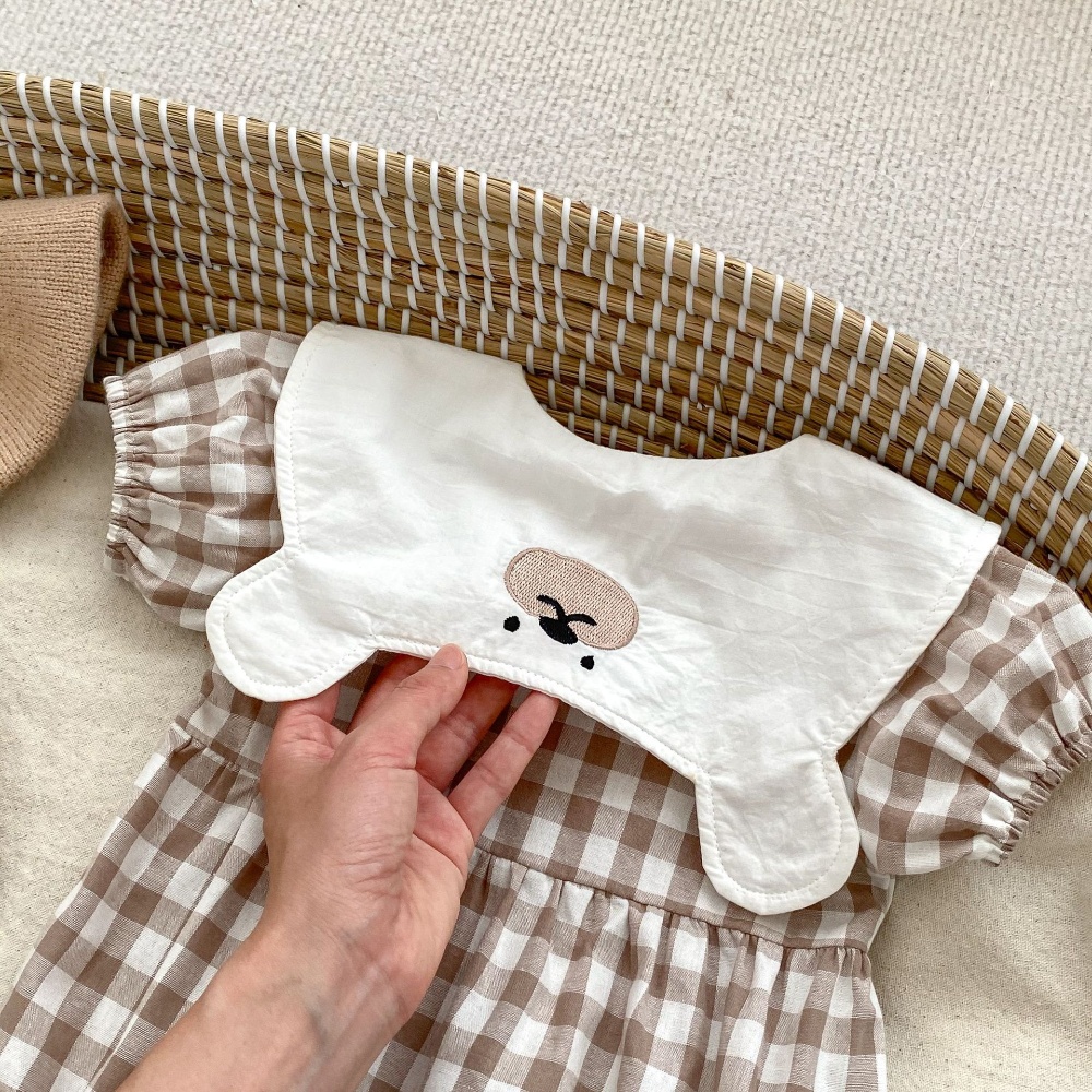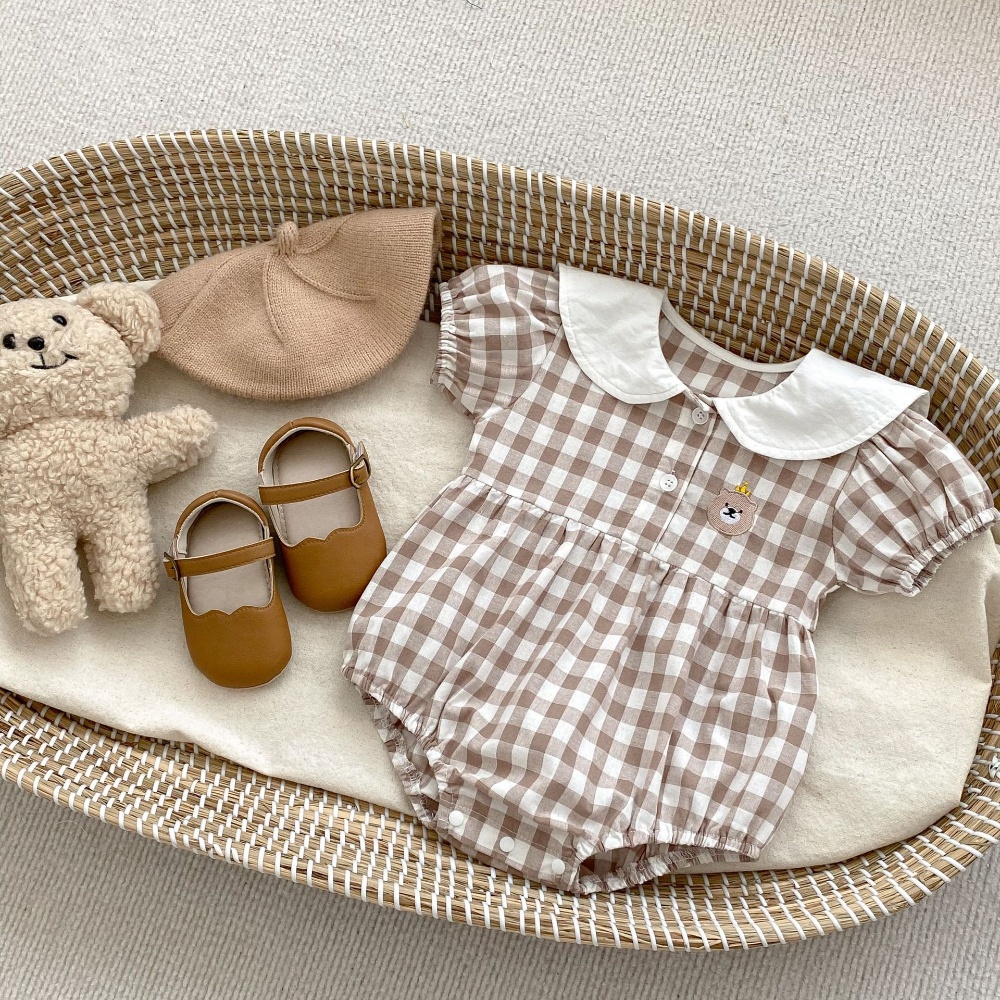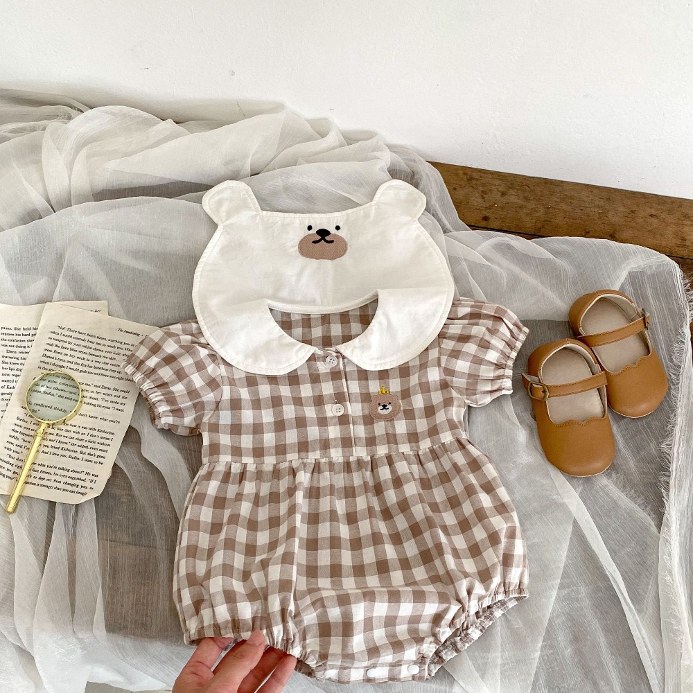 【BA360】韓版翻領刺繡熊格紋短袖包屁衣(1色)
