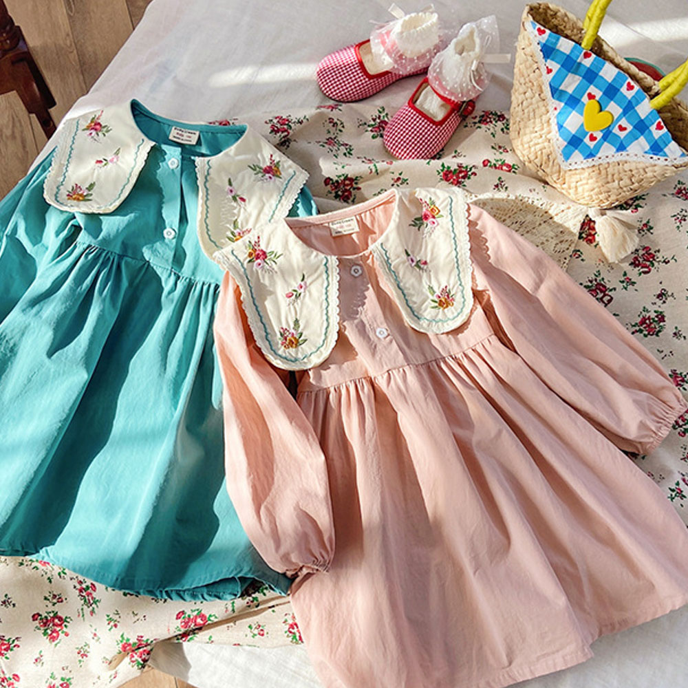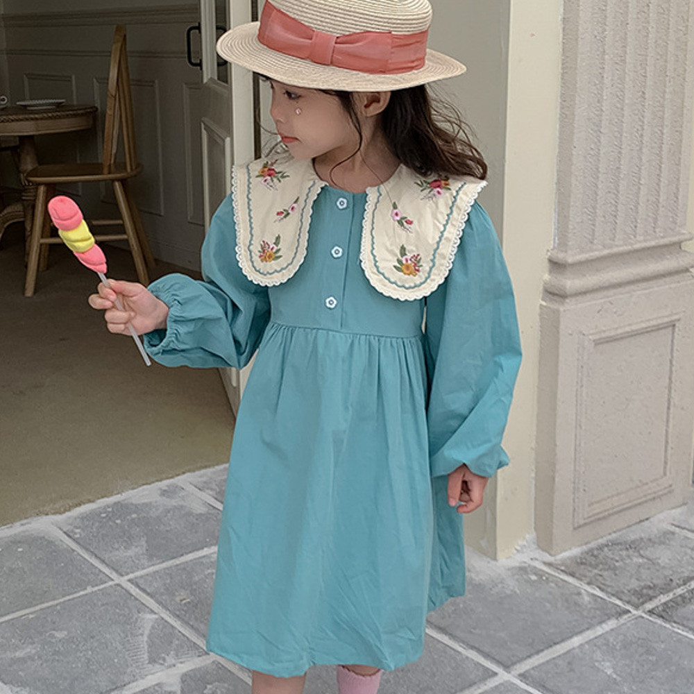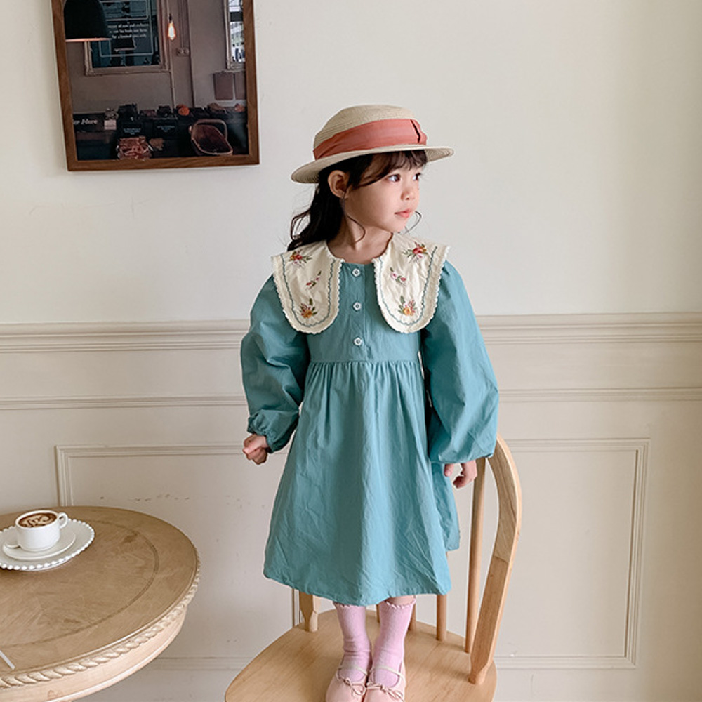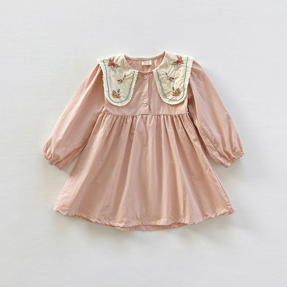 【BG558】法式小清新翻領刺繡花長袖澎澎洋裝(2色)