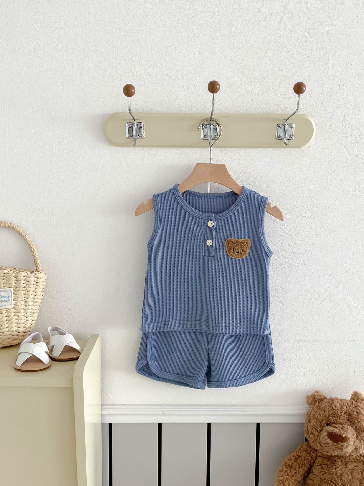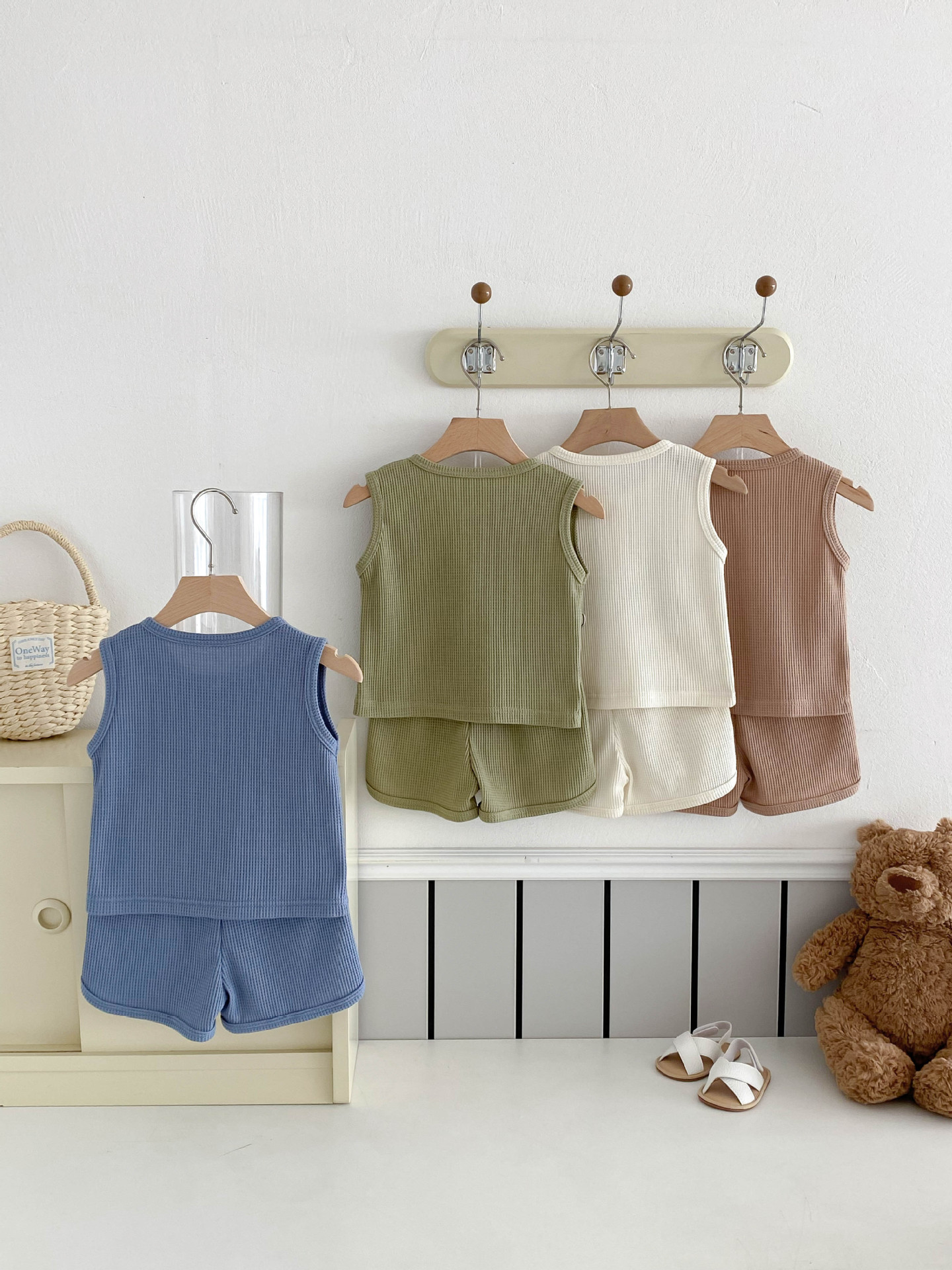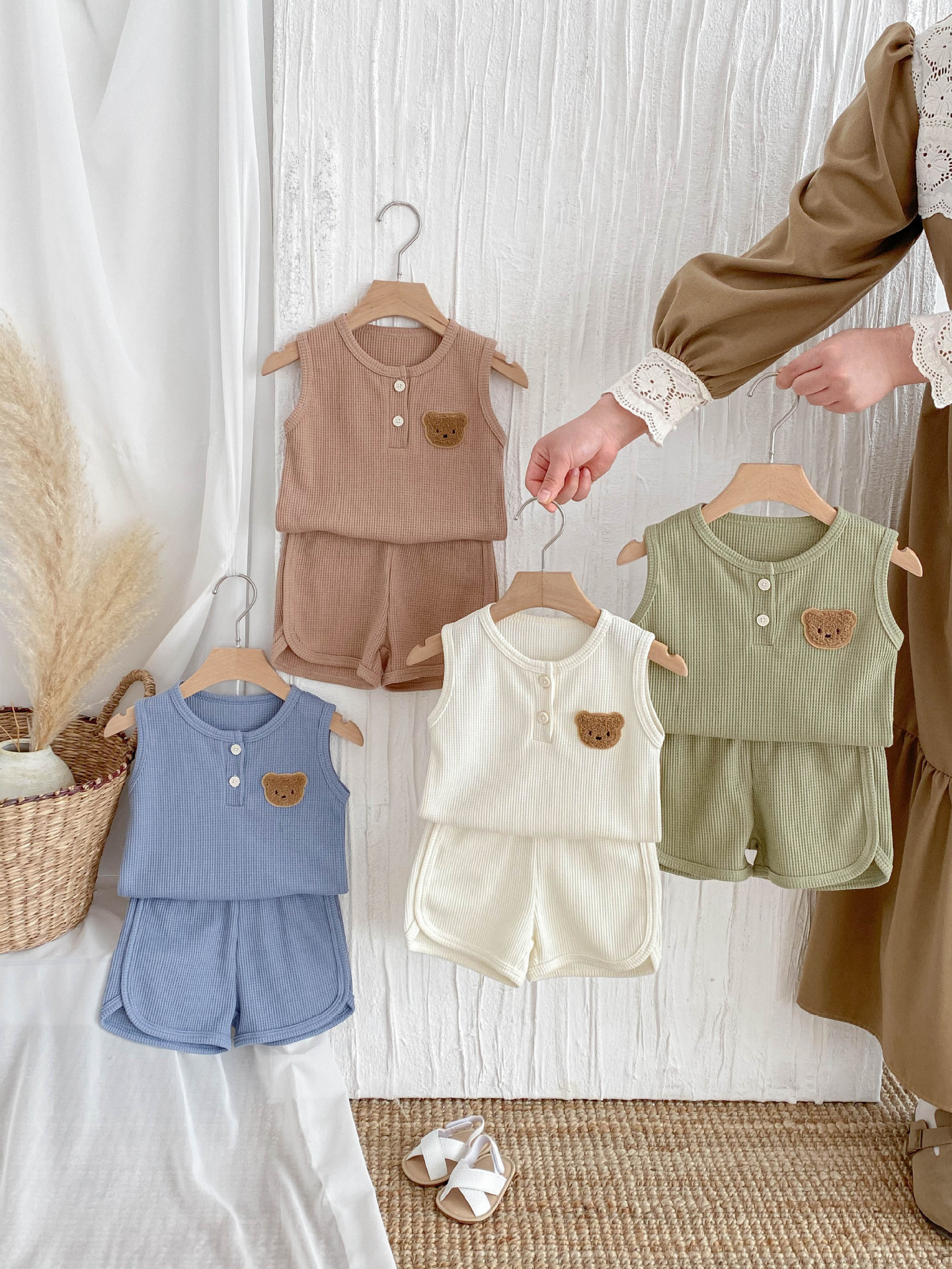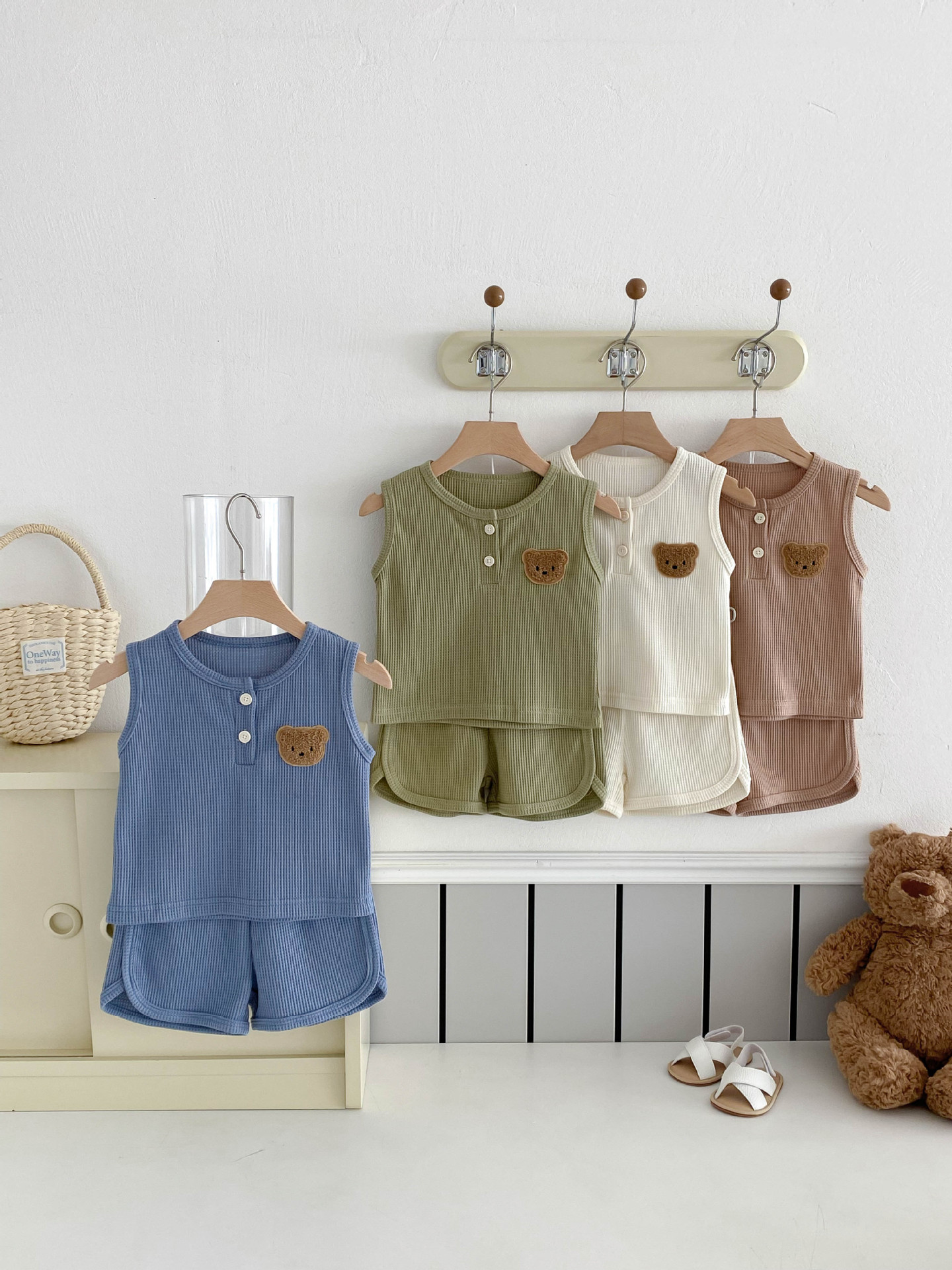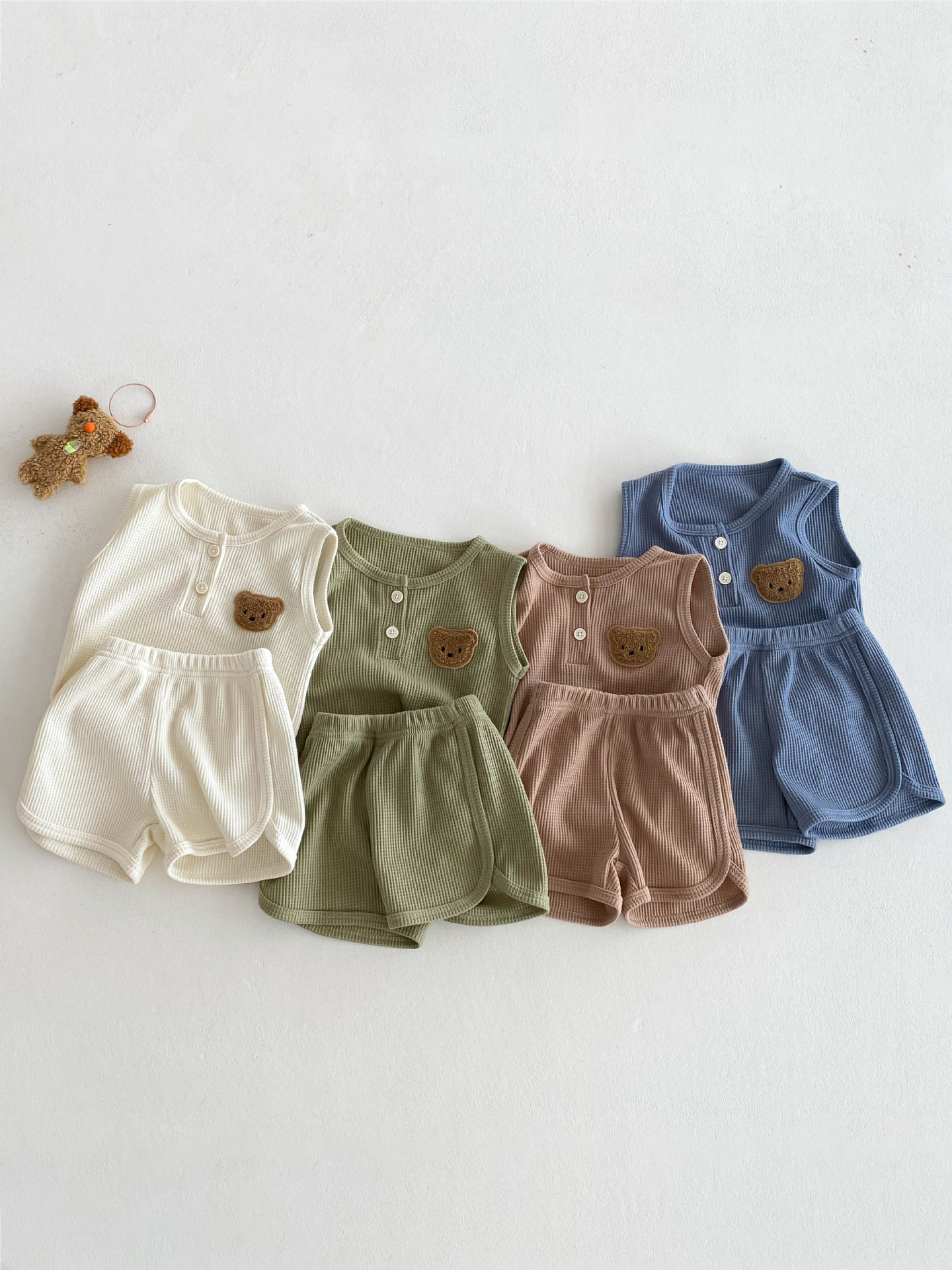 【BE105】日系華夫格紋大頭熊無袖短褲套裝(4色)