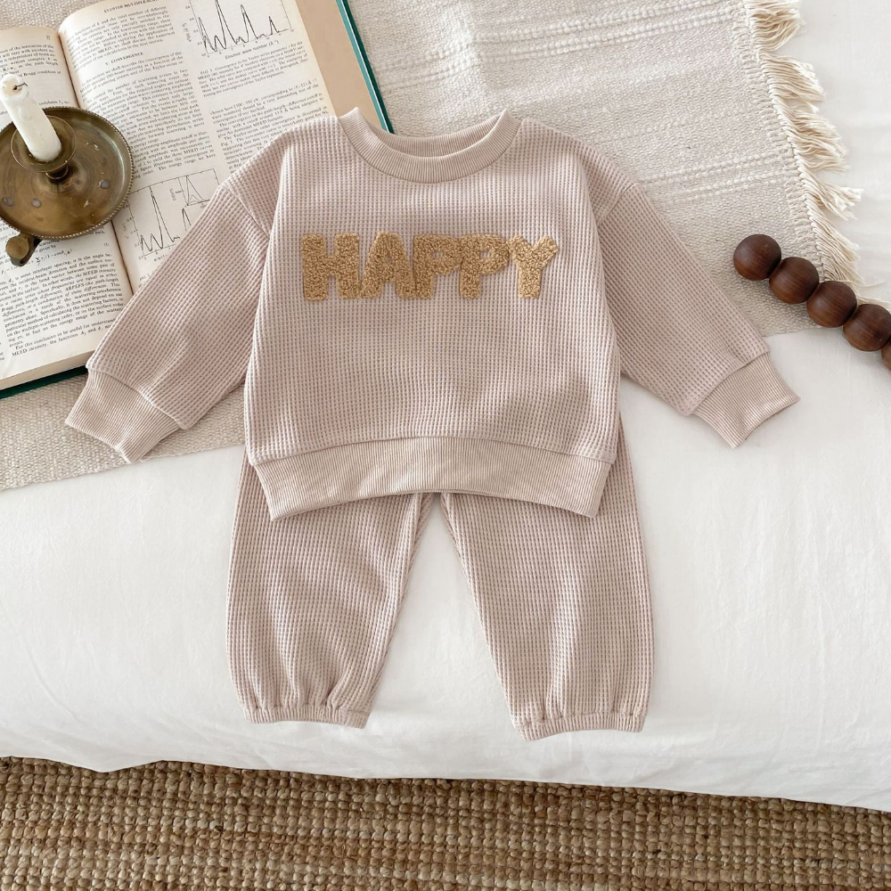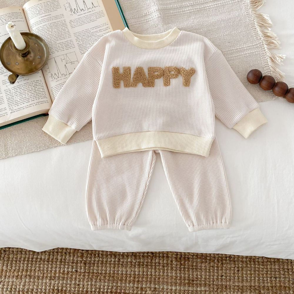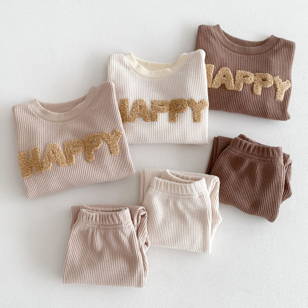 【BE084】日系華夫格紋開心字母長袖長褲套裝(3色)