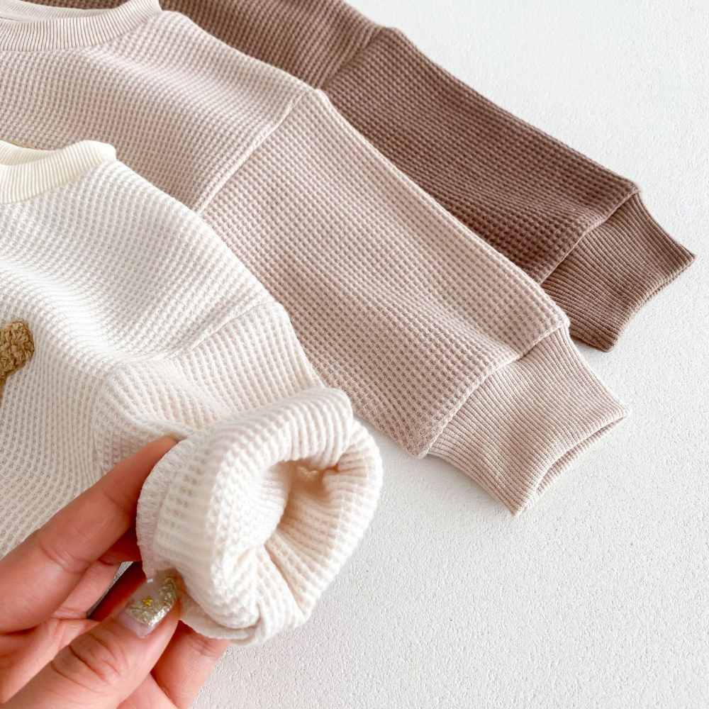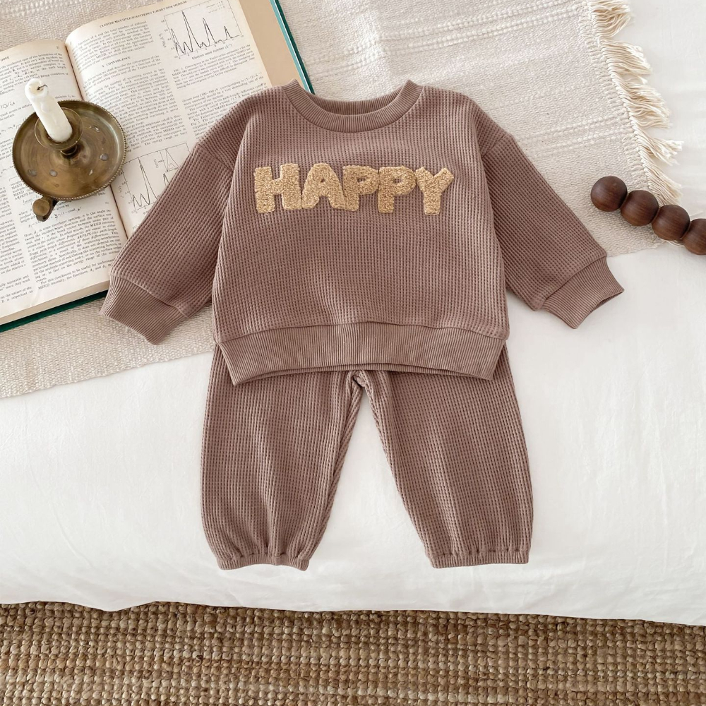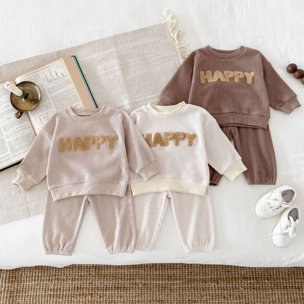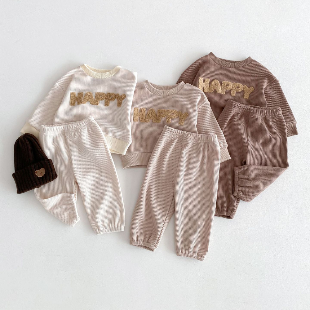 【BE084】日系華夫格紋開心字母長袖長褲套裝(3色)