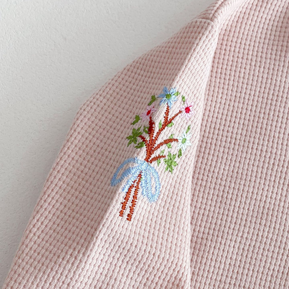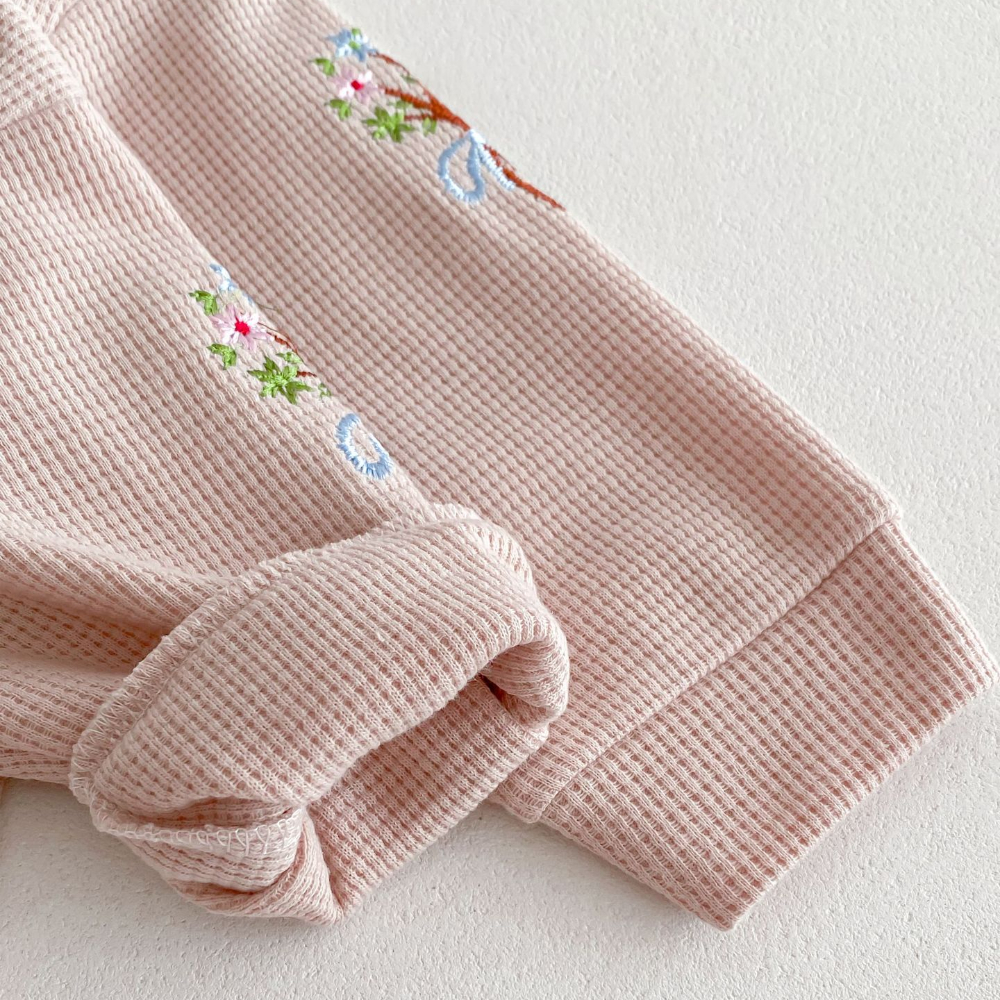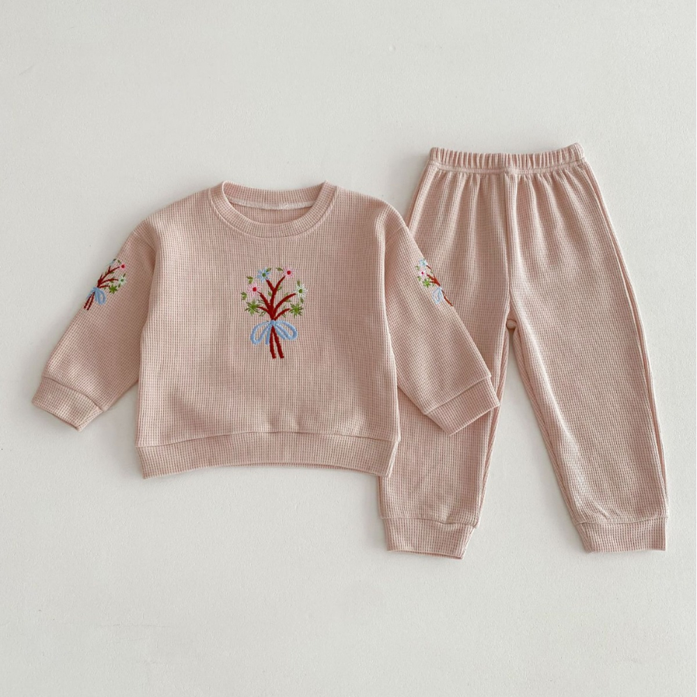 【BE086】日系華夫格紋刺繡花長袖長褲套裝(1色)
