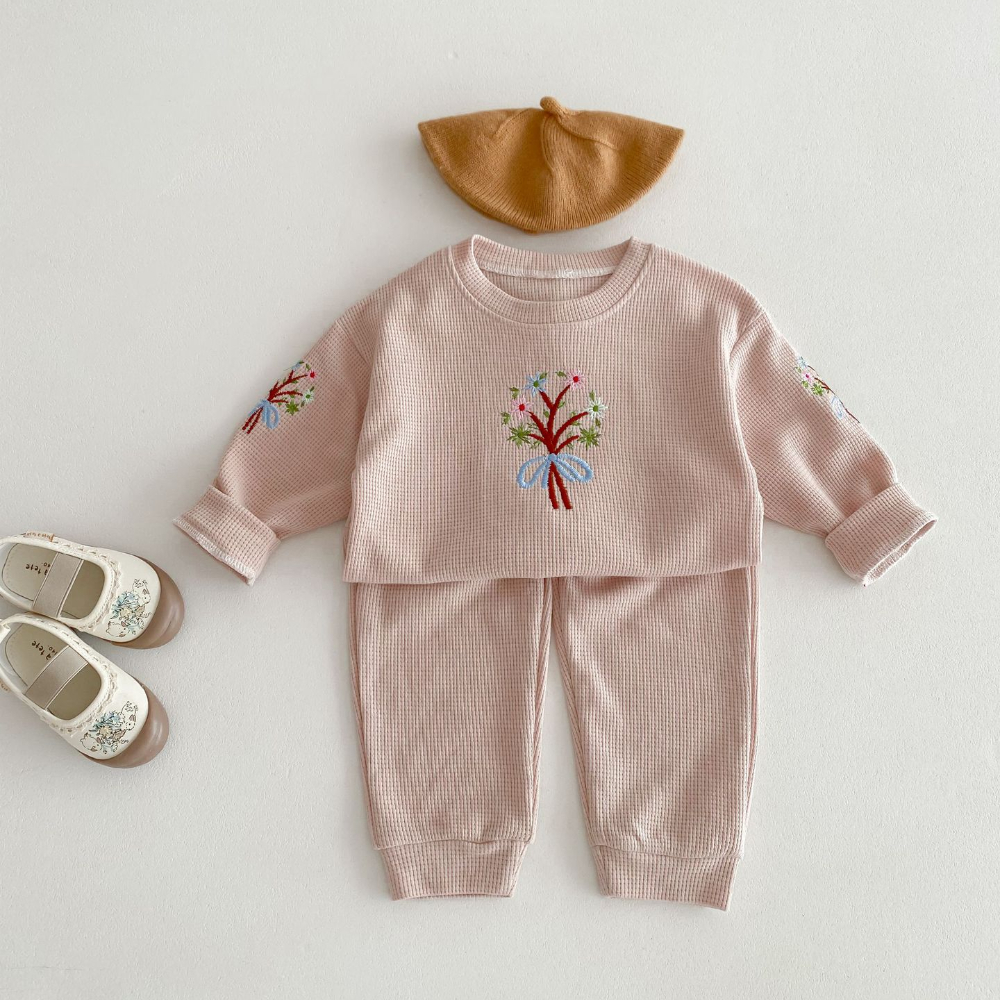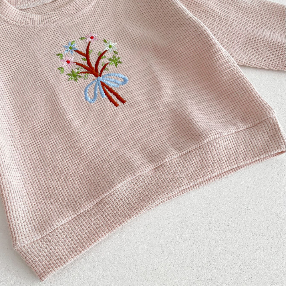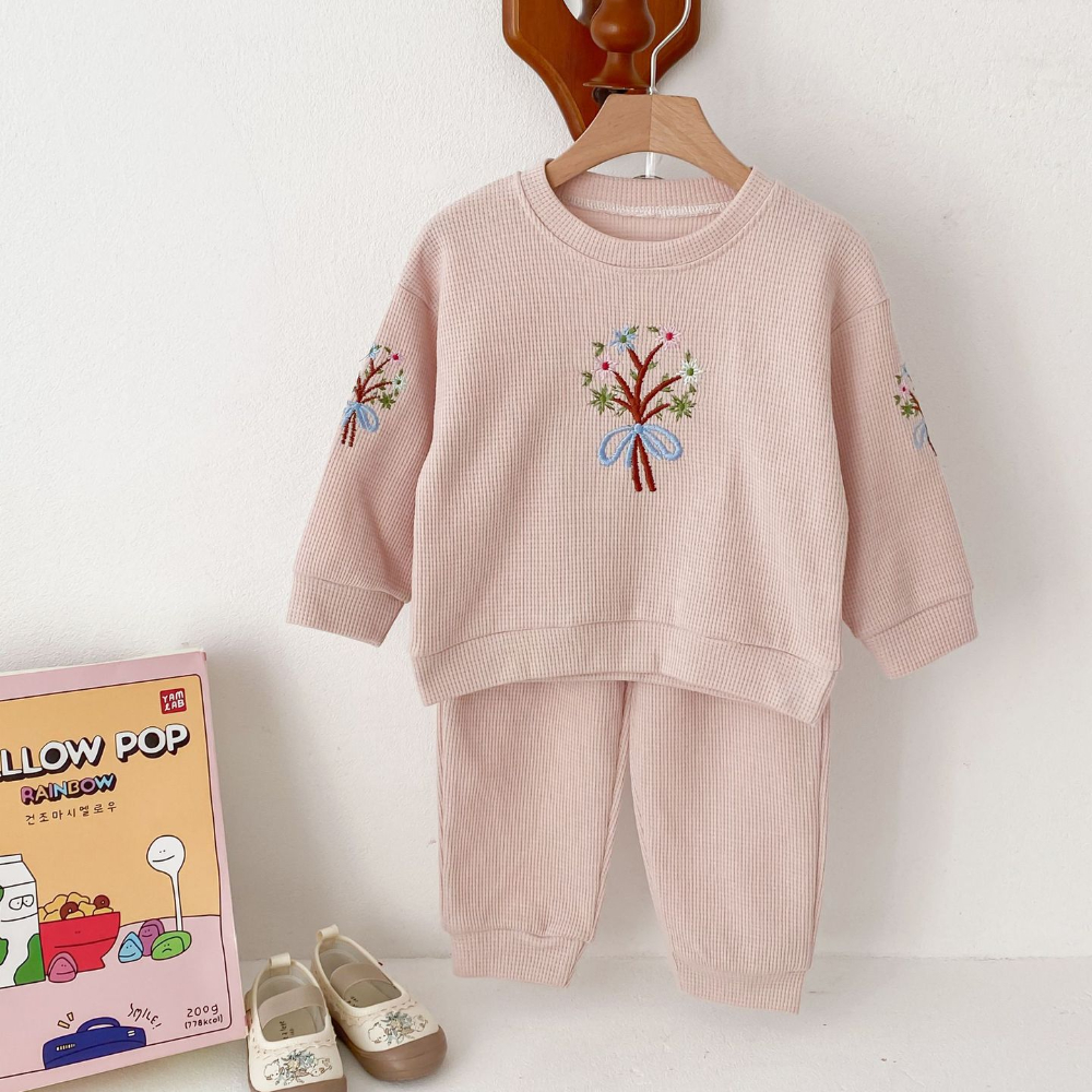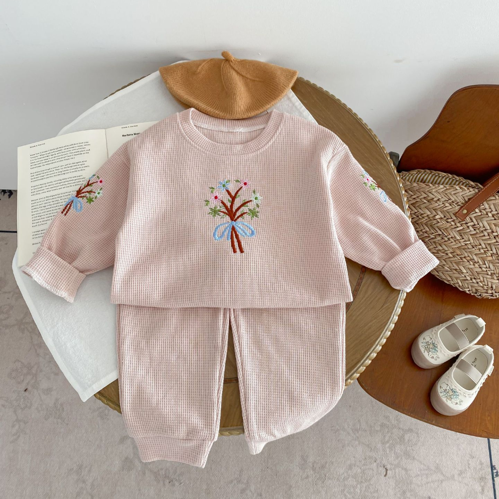 【BE086】日系華夫格紋刺繡花長袖長褲套裝(1色)