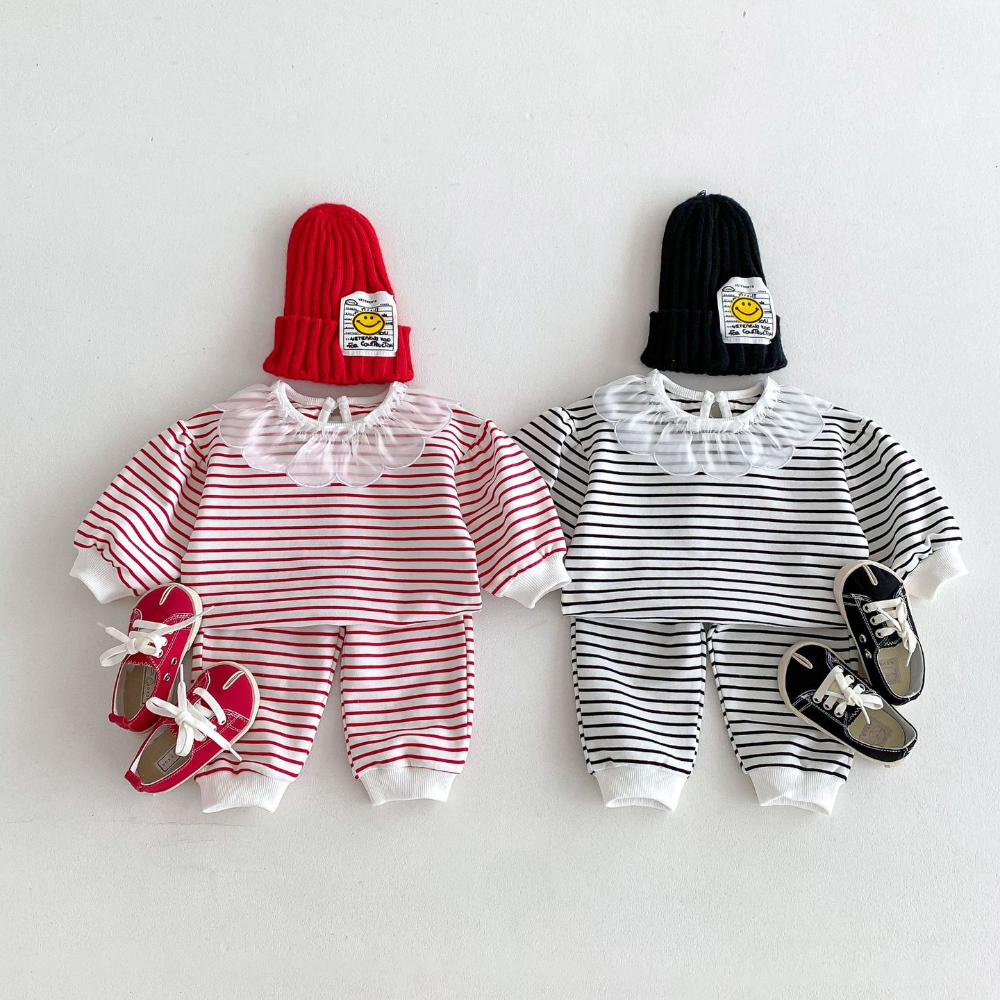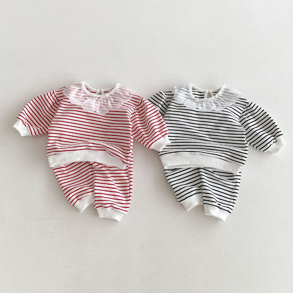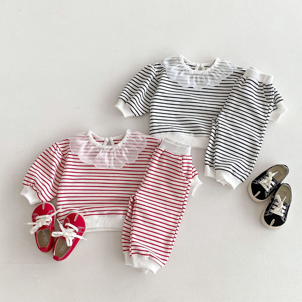 【BE089】日系花瓣領條紋長袖長褲套裝(2色)