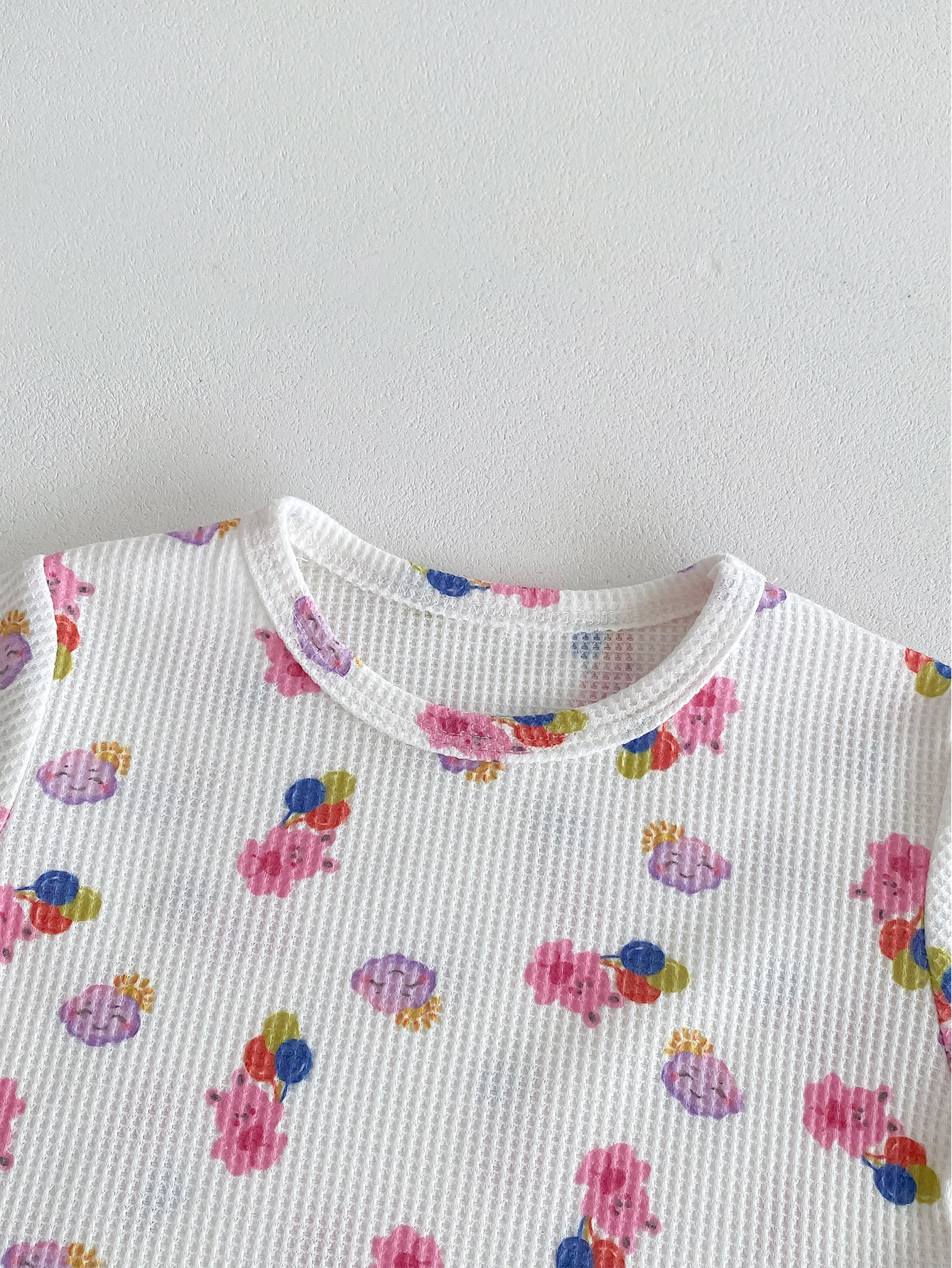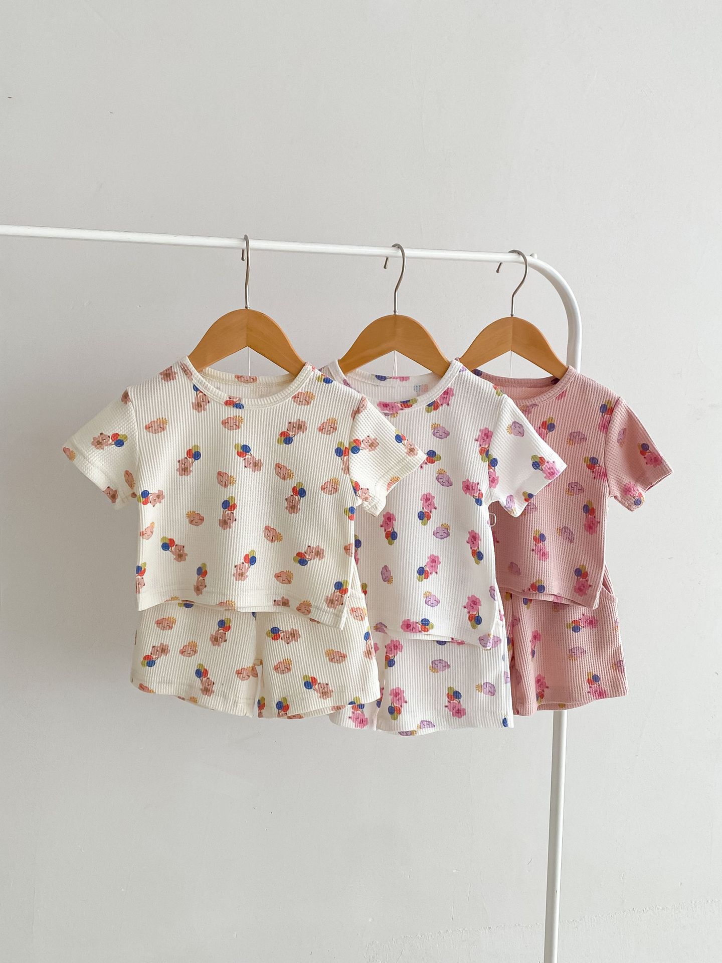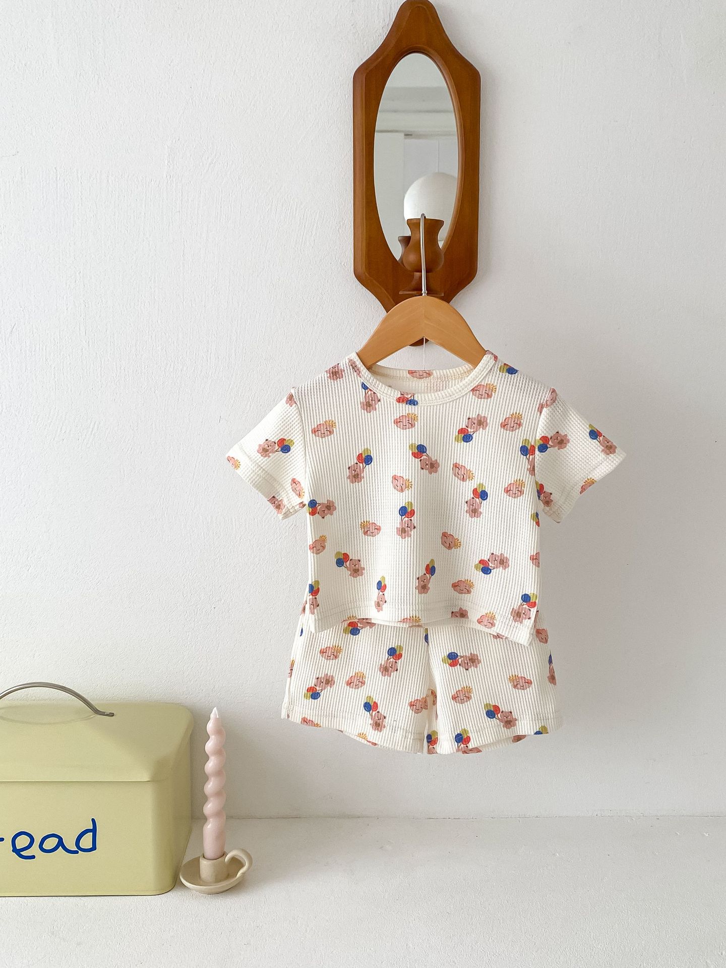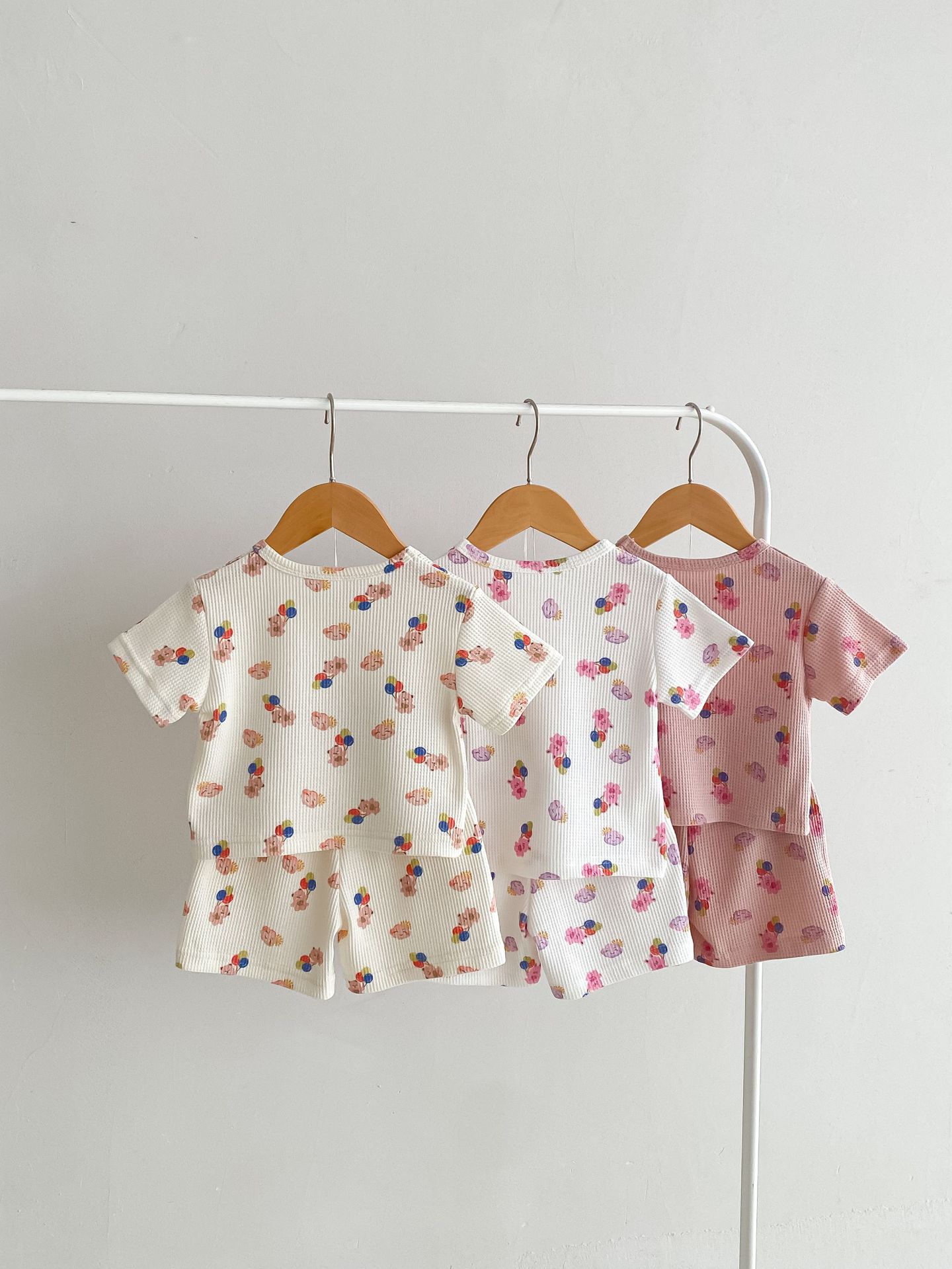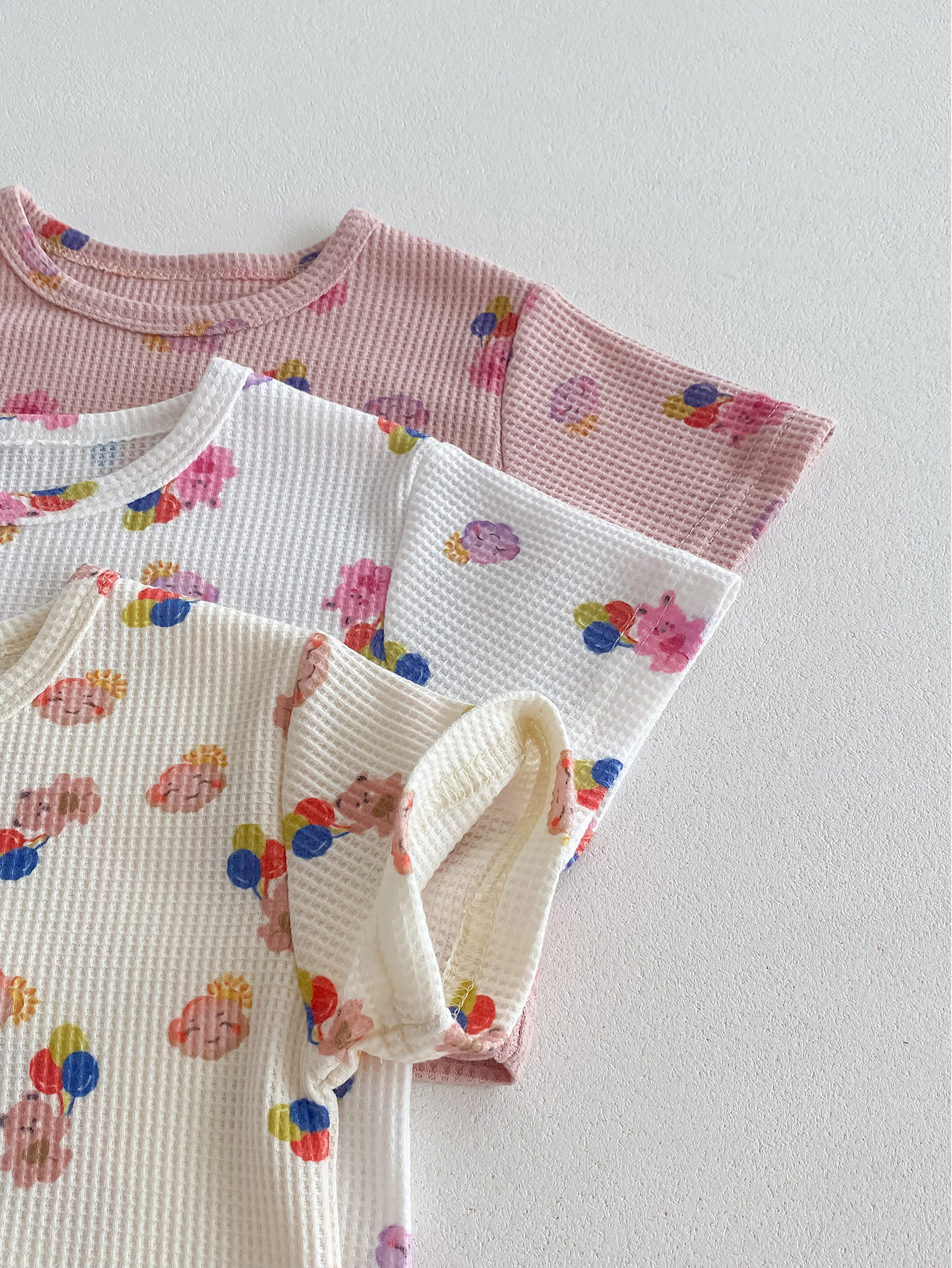 【BE111】日系華夫格紋氣球熊字母短袖短褲套裝(3色)