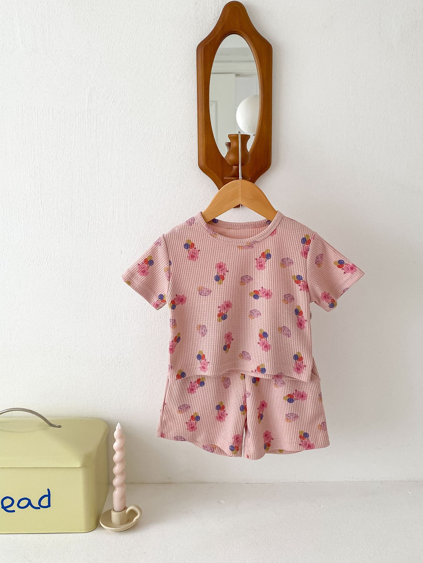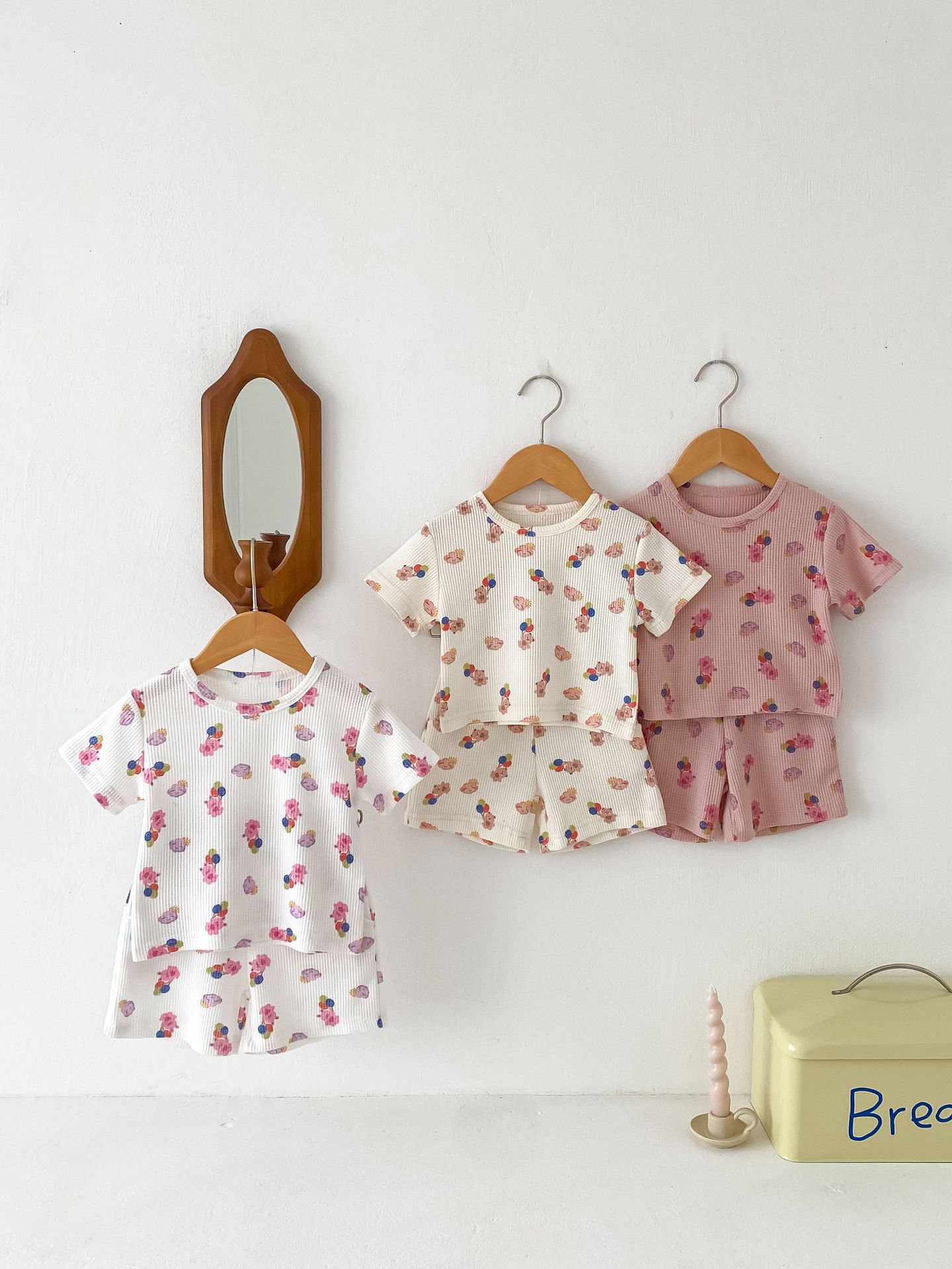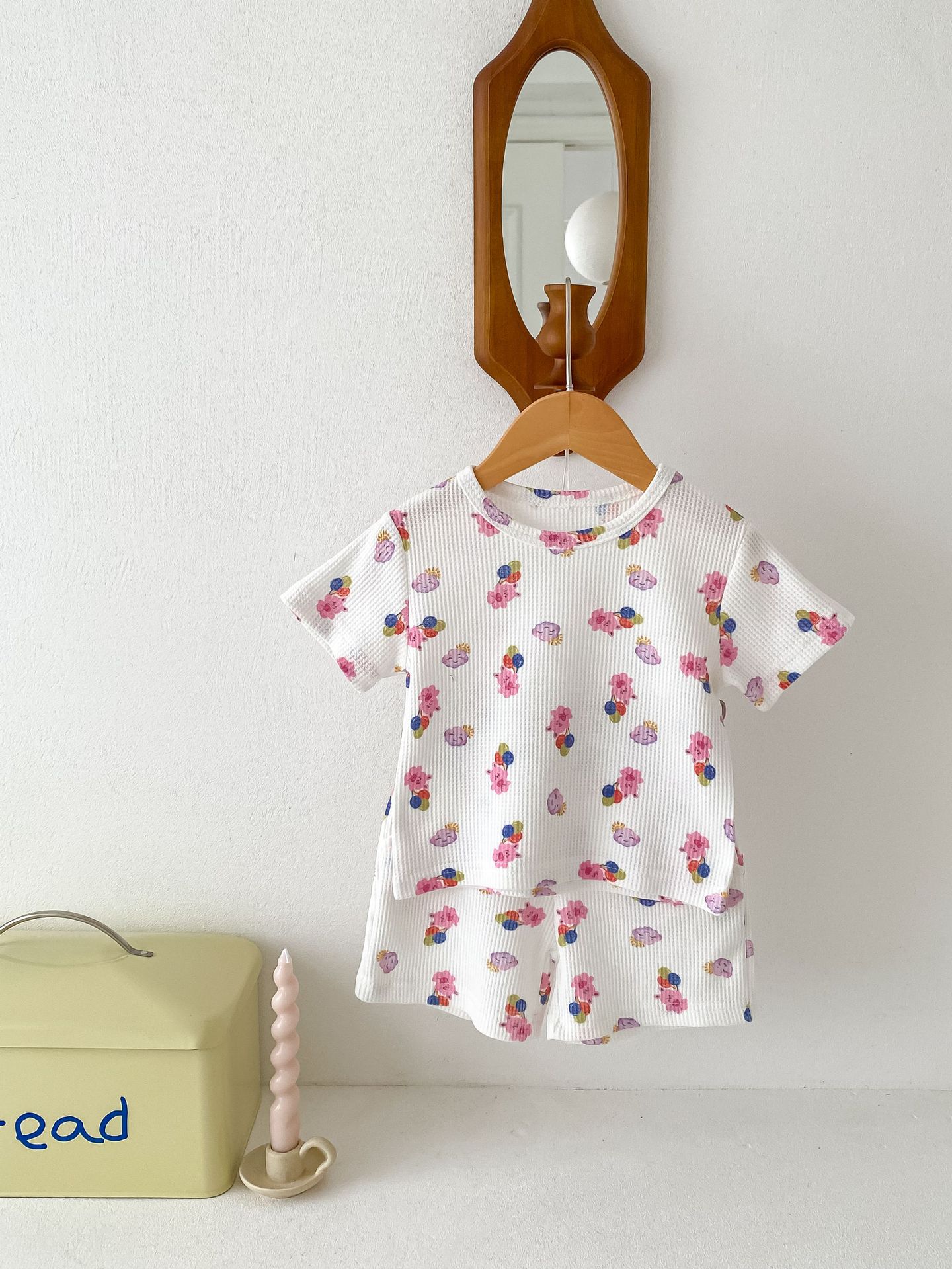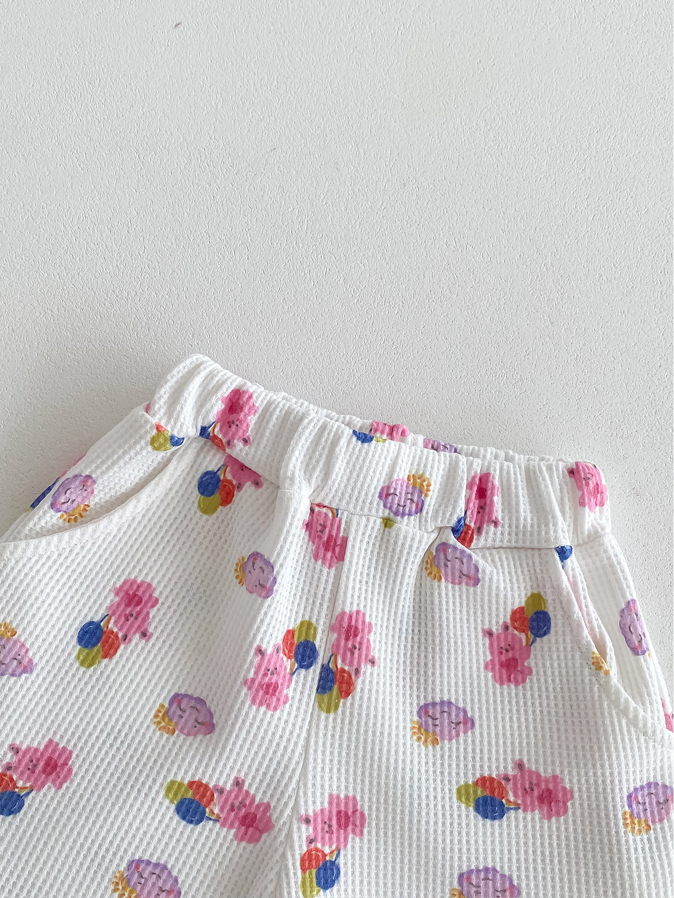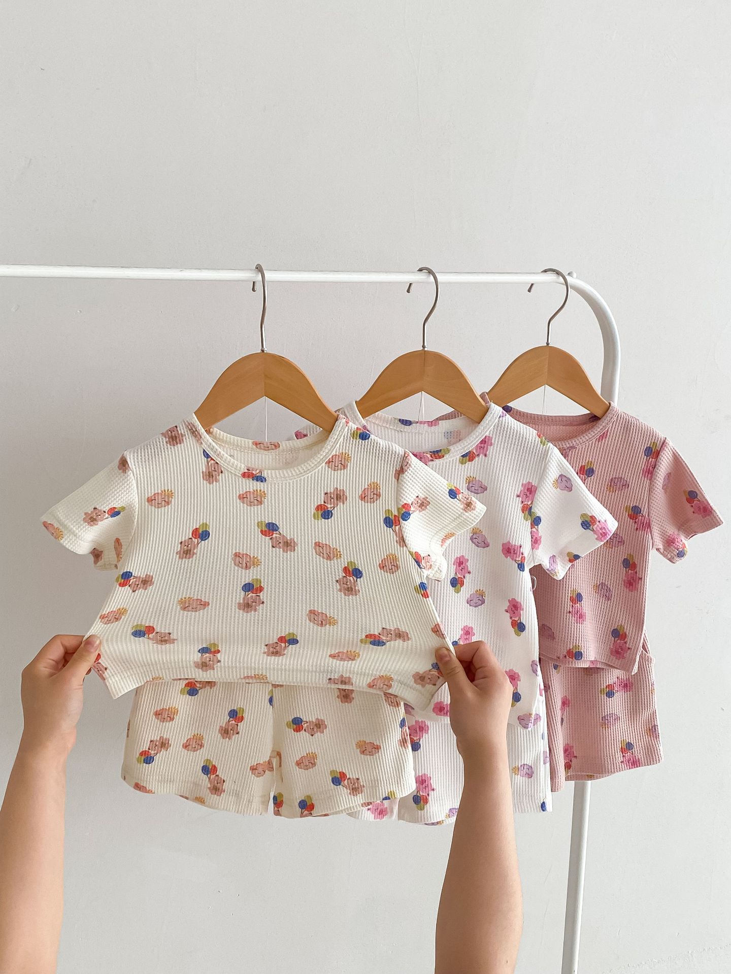 【BE111】日系華夫格紋氣球熊字母短袖短褲套裝(3色)