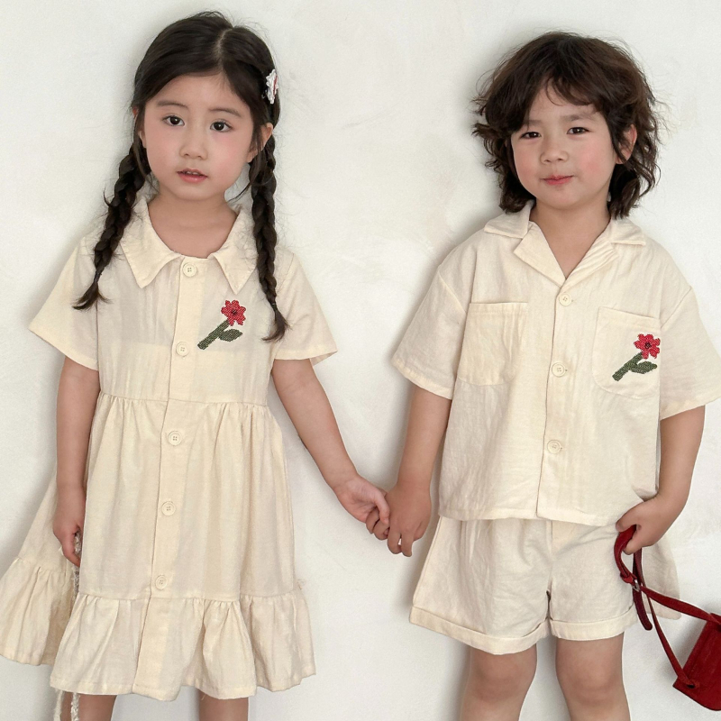 【BS242】日系刺繡小花兄妹短袖洋裝套裝(1色)